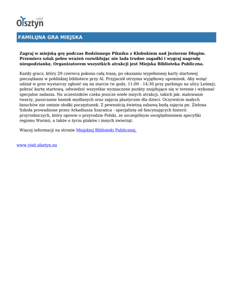 FAMILIJNA GRA MIEJSKA Zagraj w miejską grę podczas Rodzinnego Pikniku z Kłobukiem nad Jeziorem Długim. Przemierz szlak pełen wrażeń rozwikłując nie lada trudne zagadki i wygraj nagrodę niespodziankę. Organizatorem wszystkich atrakcji jest Miejska Biblioteka Publiczna. Każdy gracz, który 29 czerwca pokona całą trasę, po okazaniu wypełnionej karty startowej pieczątkami w pobliskiej bibliotece przy Al. Przyjaciół otrzyma wyjątkowy upominek. Aby wziąć udział w grze wystarczy zgłosić się na starcie (w godz. 11:00 - 14:30 przy parkingu na ulicy Leśnej), pobrać kartę startową, odwiedzić wszystkie wyznaczone punkty znajdujące się w terenie i wykonać specjalne zadania. Na uczestników czeka jeszcze wiele innych atrakcji, takich jak: malowanie twarzy, puszczanie baniek mydlanych oraz zajęcia plastyczne dla dzieci. Oczywiście małych łasuchów nie ominie słodki poczęstunek. Z pewnością świetną zabawą będą zajęcia pn. Zielona Szkoła prowadzone przez Arkadiusza Szarańca - specjalistę od fascynujących historii przyrodniczych, który opowie o przyrodzie Polski, ze szczególnym uwzględnieniem specyfiki regionu Warmii, a także o życiu ptaków i innych zwierząt. Więcej informacji na stronie Miejskiej Biblioteki Publicznej. www.visit.olsztyn.eu