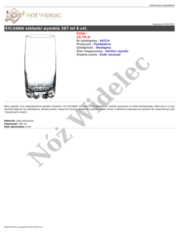 Informacje o produkcie Utworzono 07-03-2017 SYLVANA szklanki wysokie 387 ml 6 szt. Cena : 22,70 zł id e le c Nr katalogowy : 64314 Producent : Pasabahce Dostępność : Dostępny Stan magazynowy : bardzo wysoki Średnia ocena : brak recenzji N óż Materiał: szkło hartowane Pojemność: 387 ml. Ilość elementów: 6 szt. W Nieco pękate, lecz niepozbawione wdzięku szklanki z lini SYLVANA, tureckiej firmy Pasabahce, zostały wykonane ze szkła hartowanego, które jest 2-3 razy bardziej odporne na uszkodzenia. Bardzo prosta, klasyczna forma z dodatkiem pazura, dzięki czemu z łatwością dopasują się zarówno do noweczesnych jak i klasycznych wnętrz. Wygenerowano w programie www.oscGold.com