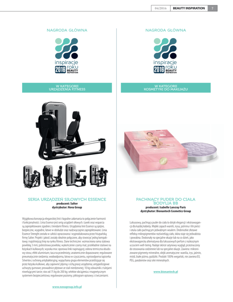 04/2016 NAGRODA GŁÓWNA 2016 BEAUTY INSPIRATION NAGRODA GŁÓWNA 2016 W KATEGORII URZĄDZENIA FITNESS W KATEGORII KOSMETYKI DO MAKIJAŻU SERIA URZĄDZEŃ SIŁOWYCH ESSENCE PACHNĄCY PUDER DO CIAŁA BODYLIA BB producent: Salter dystrybutor: Nova Group Wyjątkowa koncepcja eleganckiej linii i łagodne załamania to połączenie harmonii i funkcjonalności. Linia Essence jest serią urządzeń siłowych. Ławki oraz wsparcia są zaprojektowane zgodnie z trendami fitness. Urządzenia linii Essence są spójne, bezpieczne, wygodne, łatwe w obsłudze oraz nadzwyczajnie zaprojektowane. Linia Essence Strenght została w całości opracowana i wyprodukowana przez hiszpańską firmę Salter. Projekt i jakość zostały idealnie połączone, aby stworzyć jedną kompaktową i najsilniejszą linię na rynku fitness. Dane techniczne: wzmocniona rama stalowa powłoką 3 mm; poliestrowa powłoka; wykończenie czarny mat; przekładnie stalowe na łożyskach kulkowych; wysoka moc oporowa linki napinającej; osłona termiczna obudowy stosu; efekt aluminium; taca na przedmioty; anatomicznie dopasowane; regulowane pneumatycznie siedzenia; wodoodporna, łatwa w czyszczeniu, ognioodporna tapicerka Silvertex z ochroną antybakteryjną; wypychana grupa elementów prześlizguje się przez łożyska kulkowe, aby zapewnić płynną i cichą pracę urządzenia; antypoślizgowe uchwyty gumowe; prowadnice płytowe ze stali nierdzewnej; 10 kg odważniki z tulejami niwelującymi tarcie; stos od 75 kg do 200 kg; selektor obciążenia z magnetycznym systemem bezpieczeństwa; regulowane poziomy; piktogram opisowy z ćwiczeniami. www.novagroup.info.pl producent: Isabelle Lancray Paris dystrybutor: Bionantech Cosmetics Group Luksusowy, pachnący puder do ciała to dotyk elegancji i ekstrawagancji dla każdej kobiety. Miękki zapach wanilii, irysa, jaśminu i lilii pieści i otula ciało pachnącym jedwabnym woalem. Drobniutkie złotawe refleksy mikropigmentów rozświetlają ciało, skóra staje się jedwabista i powabna. Doskonały na specjalne okazje lub na co dzień, jako ekstrawagancka alternatywa dla luksusowych perfum z rozkosznym uczuciem well-being. Nadaje skórze satynowy wygląd, przeznaczony do stosowania codziennie lub na specjalne okazje. Zawiera: mikronizowane pigmenty mineralne, olejki aromatyczne: wanilia, irys, jaśmin, miód, białe piżmo, goździki. Produkt 100% wegański, nie zawiera EO, PEG, parabenów oraz olei mineralnych. www.bionantech.pl 7