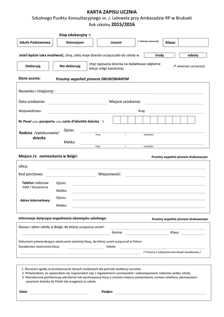 KARTA ZAPISU UCZNIA Szkolnego Punktu Konsultacyjnego im. J. Lelewela przy Ambasadzie RP w Brukseli Rok szkolny 2015/2016 Etap edukacyjny *) Szkoła Podstawowa Gimnazjum (* właściwe zaznaczyć) Liceum Jeżeli będzie taka możliwość, chcę, żeby moje dziecko uczęszczało do szkoły w Deklaruję Dane ucznia: Nie deklaruję Klasa: środy chęć zapisania dziecka na dodatkowe odpłatne lekcje religii katolickiej soboty (* właściwe zaznaczyć) Prosimy wypełnić pismem DRUKOWANYM Nazwisko i imię(ona) : Data urodzenia: Miejsce urodzenia: Województwo: Kraj: Nr Pesel (albo) paszportu (albo) carte d’identité dziecka *) Rodzice /opiekunowie/ dziecka Ojciec Imię i nazwisko Imię i nazwisko Matka Miejsce /a zamieszkania w Belgii: Prosimy wypełnić pismem drukowanym Ulica: Kod pocztowy: Telefon rodziców GSM / Stacjonarny Adres internetowy: Miejscowość: Ojciec: Matka: Ojciec: Matka: Informacje dotyczące wypełniania obowiązku szkolnego: Prosimy wypełnić pismem drukowanym Nazwa i adres szkoły w Belgii, do której uczęszcza uczeń: Gmina: Klasa: Dokument potwierdzający ukończenie ostatniej klasy, do której uczeń uczęszczał w Polsce Świadectwo ukończenia klasy: Szkoły: / Prosimy o załączenie kserokopii świadectwa / 1. Wyrażam zgodę na przetwarzanie danych osobowych dla potrzeb ewidencji uczniów. 2. Potwierdzam, że zapoznałam się /zapoznałem się/ z regulaminem uczniowskim i zobowiązaniami rodziców wobec szkoły. 3. Niezwłocznie poinformuję sekretariat lub wychowawcę klasy o zmianie miejsca zamieszkania, numeru telefonu, planowanym powrocie dziecka do Polski lub rezygnacji ze szkoły. Data: Podpis: