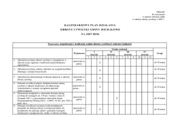 Załącznik do wytycznych w sprawie realizacji zadań w zakresie obrony cywilnej w 2007 r. KA LEN D A R ZO WY P LAN D ZIAŁ AN I A O BRO N Y C YWI LN EJ GM IN Y M IC H AŁO WO N A 2007 RO K Planowanie, organizacja i realizacja zadań obrony cywilnej i ochrony ludności Wykonawca 1. Zaktualizować plany obrony cywilnej w szczególności w zakresie oceny zagroŜeń i moŜliwości przeciwdział ania zagroŜeniom. 2. Zaktualizować plany ochrony zabytków na wypadek konfliktu zbrojnego i sytuacji kryzysowych. 3. Zaktualizować dokumentację ewakuacji planowej w zakresie obrony cywilnej. 4. Dokonać weryfikacji planów działania formacji obrony cywilnej w zakresie moŜliwości ich efektywnego wykorzystania w sytuacji wystąpienia zagroŜeń nadzwyczajnych. Dostosować zarządzeni e o utworzeniu formacji obrony cywilnej do wymogów art. 138 ust. 3 ustawy z dnia 21 listopada 1967 r. o powszechnym obowiązku obrony Rzeczypospolitej Polskiej (Dz.U. z 2004 r. Nr 241, poz. 2416 z późn. zm.). Dokonać weryfikacji (wymiany) osób posiadających przydziały do formacji obrony cywilnej pod kątem ich przydatności do realizacji zadań i spełniania wymogów określonych w przepisach dot. słuŜby w obronie cywilnej. 5. 6. pracownik oc gminy I kwartał 1 2 3 Termin reali zacji II III kwartał kwartał 4 5 6 7 8 9 IV kwartał 10 11 12 Uwagi do 30 marca X do 30 marca X pracownik oc gminy X do 30 marca pracownik oc gminy X do 30 marca pracownik oc gminy pracownik oc gminy X X do 30 marca do 30 marca 7. 8. Przesłać dane do aktualizacji planu obrony cywilnej powiatu do Wydziału Spraw Społecznych Starostwa Białostockiego (wg wzoru WZK PUW). Przedstawić do uzgodnienia do Starostwa Białostockiego gminne plany działania (zawierające szczegółowe zamierzeni a szkoleniowe) w zakresie obrony cywilnej na 2007 rok. pracownik oc gminy X pracownik oc gminy do 15 marca X do 15 lutego Szkolenie i upowszechnianie OC 9. Uczestniczyć w szkoleniu dla pracowników ds. obronnych i obrony cywilnej powiatów i gmin. 10. Szkolenie podstawowe osób funkcyjnych i członków gminnego zespołu reagowani a. 11. Realizować szkolenie podstawowe (po ukazaniu się wytycznych wojewody w sprawie realizacji szkolenia podstawowego). 12. Szkolenie podstawowe członków form acji obrony cywilnej (DruŜyna Wykrywania i Alarmowania) i innych jednostek organizacyjnych. 13. Realizować szkolenie ludności z zakresu powszechnej samoobrony. pracownik oc gminy cały rok pracownik oc gminy X 28 września pracownik oc gminy wg planów własnych pracownik oc gminy X 31 lipca pracownik oc gminy szkolenie ciągłe 14. Dokonać oceny przes zkolenia personelu obrony cywilnej i ludności w zakresie obrony cywilnej, wypracować wnioski i pracownik oc gminy propozycje zmian w tym zakresie oraz przesłać je do WSS Starostwa Białostockiego. 15. Dokonać przeglądu i oceny kierunków i priorytetów w pracownik oc szkoleniu ludności w zakresie powszechnej samoobrony oraz wypracować propozycje zmian w tym zakresie oraz przesłać je gminy do WSS Starostwa Białostockiego. 16. Prowadzić miesięczne i kwartalne treningi SwiA. pracownik oc gminy 17. Przeprowadzić głośny trening SWiA z uŜyciem syren alarmowych i środków masowego przekazu. pracownik oc gminy X do 31maja do 31 sierpnia X X X X X X X X X X X X X X czwarty czwartek miesiąca wrzesi eń 18. Współpracować z mass mediami w zakresie upowszechniani a zagadni eń dotyczących zarządzani a kryzysowego, ochrony ludności i spraw obronnych. pracownik oc gminy cały rok Zabezpieczenie logistyczne d ziałań obrony cywilnej 19. Uzgodnić stany ewidencyjne sprzętu obrony cywilnej pracownik oc stanowiącego mienie Skarbu Państwa otrzymanego w gminy uŜyczenie z podlaskiego urzędu Wojewódzkiego. 20. Przeprowadzić analizę i bieŜącą aktualizację danych zawartych pracownik oc w Bazie danych sił i środków Szefa OC. gminy X do 28 lutego X do 30 wrześni a wg terminów określonych przez WZK 21. Przeprowadzić ocenę i likwidację sprzętu OC, który utracił walory uŜytkowe. pracownik oc gminy 22. Prowadzić naprawy i konserwację sprzętu OC. pracownik oc gminy cały rok 23. Prowadzić kalibrację przyrządów dozymetrycznych. pracownik oc gminy wg oddzielnego planu 24. Prowadzić wymianę /rotację/ sprzętu OC w gminnym magazynie. 25. Uczestniczyć w dostosowaniu sytemu wykrywania i alarmowani a województwa do wymogów rozporządzenia Rady Ministrów z dnia 16 października 2006 r. w sprawie systemów wykrywania skaŜeń i właściwości organów w tych sprawach (Dz.U. Nr 191, poz. 1415). 26. Doskonalić funkcjonowanie struktur gminnego Systemu Wykrywania i alarmowania. 27. Utrzymywać w sprawności technicznej system łączności i alarmowani a i prowadzić bieŜącą konserwację. 28. Uczestniczyć w pracach modernizacyjnych systemu łączności ostrzegani a i alarmowania oraz sieci zarządzania prowadzonych przez WZK PUW. 29. Na bieŜąco konserwować, w miarę potrzeb instalować w porozumieniu z WZK PUW maszty i instalacje antenowe urządzeń łączności radiowej. pracownik oc gminy Ostrzeganie i alarmowanie pracownik oc gminy pracownik oc gminy pracownik oc gminy wg potrzeb X III kwart ał na bieŜąco cały rok wg potrzeb pracownik oc gminy na bieŜąco cały rok pracownik oc gminy cały rok ZAR ZĄD ZANIA KRY ZYSOWEGO 30. Uzgadniać zmiany w gminnym planie reagowania z Wydziałem Spraw Społecznych Starostwa Powiatowego w Białymstoku 31. Dokonać aktualizacji moŜliwości zakwat erowania ludności w doraźnych pomieszczeniach na wypadek klęsk Ŝywiołowych oraz określić potrzeby w tym zakresie. 32. Doskonalić funkcjonowanie struktur gminnego Systemu Wczesnego Ostrzegania. pracownik oc gminy pracownik oc gminy cały rok X marzec pracownik oc gminy na bieŜąco cały rok na bieŜąco cały rok w kaŜdym kwartale 35. Doskonalić procedury ostrzegani a i alarmowania w ramach SWO. pracownik oc gminy pracownik oc gminy pracownik oc gminy 36. Wytypować i delegować osoby