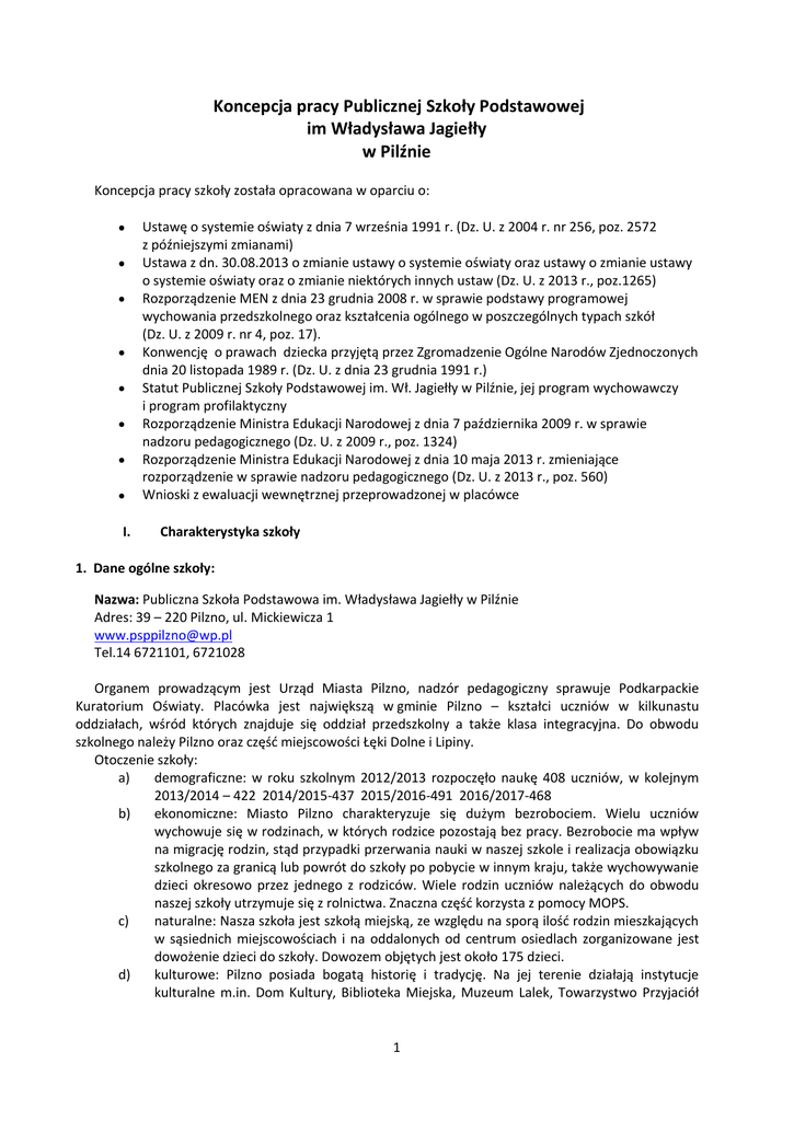 Koncepcja pracy Publicznej Szkoły Podstawowej im Władysława Jagiełły w Pilźnie Koncepcja pracy szkoły została opracowana w oparciu o: Ustawę o systemie oświaty z dnia 7 września 1991 r. (Dz. U. z 2004 r. nr 256, poz. 2572 z późniejszymi zmianami) Ustawa z dn. 30.08.2013 o zmianie ustawy o systemie oświaty oraz ustawy o zmianie ustawy o systemie oświaty oraz o zmianie niektórych innych ustaw (Dz. U. z 2013 r., poz.1265) Rozporządzenie MEN z dnia 23 grudnia 2008 r. w sprawie podstawy programowej wychowania przedszkolnego oraz kształcenia ogólnego w poszczególnych typach szkół (Dz. U. z 2009 r. nr 4, poz. 17). Konwencję o prawach dziecka przyjętą przez Zgromadzenie Ogólne Narodów Zjednoczonych dnia 20 listopada 1989 r. (Dz. U. z dnia 23 grudnia 1991 r.) Statut Publicznej Szkoły Podstawowej im. Wł. Jagiełły w Pilźnie, jej program wychowawczy i program profilaktyczny Rozporządzenie Ministra Edukacji Narodowej z dnia 7 października 2009 r. w sprawie nadzoru pedagogicznego (Dz. U. z 2009 r., poz. 1324) Rozporządzenie Ministra Edukacji Narodowej z dnia 10 maja 2013 r. zmieniające rozporządzenie w sprawie nadzoru pedagogicznego (Dz. U. z 2013 r., poz. 560) Wnioski z ewaluacji wewnętrznej przeprowadzonej w placówce I. Charakterystyka szkoły 1. Dane ogólne szkoły: Nazwa: Publiczna Szkoła Podstawowa im. Władysława Jagiełły w Pilźnie Adres: 39 – 220 Pilzno, ul. Mickiewicza 1 [email protected] Tel.14 6721101, 6721028 Organem prowadzącym jest Urząd Miasta Pilzno, nadzór pedagogiczny sprawuje Podkarpackie Kuratorium Oświaty. Placówka jest największą w gminie Pilzno – kształci uczniów w kilkunastu oddziałach, wśród których znajduje się oddział przedszkolny a także klasa integracyjna. Do obwodu szkolnego należy Pilzno oraz część miejscowości Łęki Dolne i Lipiny. Otoczenie szkoły: a) demograficzne: w roku szkolnym 2012/2013 rozpoczęło naukę 408 uczniów, w kolejnym 2013/2014 – 422 2014/2015-437 2015/2016-491 2016/2017-468 b) ekonomiczne: Miasto Pilzno charakteryzuje się dużym bezrobociem. Wielu uczniów wychowuje się w rodzinach, w których rodzice pozostają bez pracy. Bezrobocie ma wpływ na migrację rodzin, stąd przypadki przerwania nauki w naszej szkole i realizacja obowiązku szkolnego za granicą lub powrót do szkoły po pobycie w innym kraju, także wychowywanie dzieci okresowo przez jednego z rodziców. Wiele rodzin uczniów należących do obwodu naszej szkoły utrzymuje się z rolnictwa. Znaczna część korzysta z pomocy MOPS. c) naturalne: Nasza szkoła jest szkołą miejską, ze względu na sporą ilość rodzin mieszkających w sąsiednich miejscowościach i na oddalonych od centrum osiedlach zorganizowane jest dowożenie dzieci do szkoły. Dowozem objętych jest około 175 dzieci. d) kulturowe: Pilzno posiada bogatą historię i tradycję. Na jej terenie działają instytucje kulturalne m.in. Dom Kultury, Biblioteka Miejska, Muzeum Lalek, Towarzystwo Przyjaciół 1 Pilzna i Ziemi Pilźnieńskiej, TG „Sokół”, Muzeum Miejskie; Szkoła współpracuje z nimi, uczestniczy w pokazach, koncertach, akademiach, uroczystościach lokalnych. 2. Historia szkoły: Tradycje szkolnictwa na terenie Pilzna sięgają XII w., kiedy powstała pierwsza szkoła parafialna. W XV w. szkoła posiadała już własny budynek, kształciła przyszłych żaków Akademii Krakowskiej. Do najbardziej znanych wychowanków Akademii pochodzących z Pilzna należą Petrycy, Marycjusz, Glicki Grucki, Jurkowski, Halicki. Z inicjatywy burmistrza Tytusa Buynowskiego zbudowano szkołę przy obecnej ulicy Mickiewicza i w 1906 r. oddano ją do użytku. Funkcjonowała ona jako pięcioklasowa męska im. Wł. Jagiełły i pięcioklasowa żeńska im. Królowej Jadwigi. Bogata historia szkoły została opisana w wydaniu książkowym z okazji jubileuszu placówki – 100 lecia szkoły w 2006 roku. 3. Kadra: Dyrektorem szkoły od 2006 roku jest mgr Anna Błaś. W szkole zatrudnieni nauczyciele (ponad 30.) legitymują się wykształceniem wyższym pedagogicznym, posiadają różne stopnie awansu zawodowego, znaczna większość to nauczyciele dyplomowani. W szkole pracują także specjaliści: rewalidatorzy oraz bibliotekarze. Nauczyciele działają w zespołach: promocji, ewaluacji, analizy osiągnięć edukacyjnych uczniów, wychowawców i uczących w klasach 0-III i IV-VI, dokumentacji szkolnej, pomocy pedagogicznej. Wysoko wykwalifikowana kadra pedagogiczna naszej szkoły poszukuje nowych i twórczych rozwiązań dydaktycznych i wychowawczych poprzez m.in.: prowadzenie zajęć wyrównawczych, indywidualizację pracy z uczniem, wprowadzanie nowoczesnych technologii w procesie nauczania, rozwijanie zainteresowań uczniów poprzez zajęcia w kołach zainteresowań: sportowych, w tym szachowym, artystycznych, przedmiotowych; prowadzenie akcji ekologicznych, wyjazdy na basen, lodowisko, do kina i teatru, wycieczki krajoznawczo-turystyczne, organizację konkursów o zasięgu gminnym, pozyskiwanie sponsorów. Nauczyciele są otwarci na działania innowacyjne, realizują projekty edukacyjne m.in. ze środków Unii Europejskiej, rządowych i wydawnictw pedagogicznych. Nasza szkoła to placówka dobrze wyposażona w sprzęt i pomoce dydaktyczne, umożliwiająca tym samym pracę aktywnymi metodami z uwzględnieniem technologii komputerowej i informacyjnej. Kadra pedagogiczna, łącząca młodość z doświadczeniem, stale doskonaląca swoje umiejętności, kompetentna i dobrze przygotowana, właściwie dostosowuje sposób przekazywania wiedzy, kształtowania umiejętności i postaw uczniów do naturalnej w tym wieku aktywności dzieci. 4. Baza: W PSP w Pilźnie znajdują się: 18 sal przeznaczonych na zajęcia lekcyjne sala dla oddziału przedszkolnego 2 pracownie komputerowe gabinet dyrektora szkoły i jego zastępcy gabinet higienistki szkolnej, pedagoga szkolnego biblioteka z centrum multimedialnym pokój nauczycielski sekretariat 2 pomieszczenia przeznacz