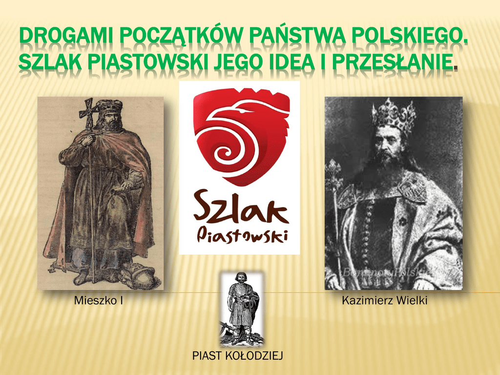 DROGAMI POCZĄTKÓW PAŃSTWA POLSKIEGO. SZLAK PIASTOWSKI JEGO IDEA I PRZESŁANIE. Mieszko I Kazimierz Wielki PIAST KOŁODZIEJ PEREPIDEMOS podróżowanie w czasie i przestrzeni Per agros DROGA - SZLAK per i agros oznaczały tych, którzy szli przez pola, przybywaIi z daleka, z zewnątrz, spoza zabudowań (spoza domu) . OZNAKOWANIE SZLAKÓW OBCOWANIE Z PRZYRODĄ Civitas Schinesghe CENTRALNE PUNKTY SZLAKU PIASTOWSKIEGO POZNAŃ GNIEZNO OSTRÓW LEDNICKI Muzeum Pierwszych Piastów NA LEDNICY Budowanie nowego szlaku w nawiązaniu do tradycji PROJEKT OZNAKOWANIA SZLAKU PIASTOWSKIEGO POZNAŃ – GNIEZNO Z 1977 ROKU Opracowanie Biura Planowania Przestrzennego w Poznaniu Autor: mgr inż. Jan Kosiński 1977 Organizacja tras Szlaku Piastowskiego POMNIKI HISTORII NA SZLAKU PIASTOWSKIM POWIĄZANIA SZLAKU PIASTOWSKIEGO z innymi szlakami na ziemiach polskich Opactwo pocysterskie w Lądzie Kapelusz pielgrzymi św. Jakuba w Muzeum Etnograficznym w Poznaniu Codex aureus Gnesnensis koniec XI w. Dokument fundacyjny klasztoru w Łeknie 1153 rok ZABYTKI RUCHOMEGO DZIEDZICTWA PIERWSZYCH PIASTÓW wybór Stauroteka z Ostrowa Lednickiego Tzw. Kielich św. Wojciecha z katedry w Gnieźnie, Patena trzemeszneńska, XII w. Denar Mieszka I Tympanon fundacyjny w Strzelnie Tzw. I kielich Dąbrówki – Gniezno XII w. Szyszak drużyny Bolesława Chrobrego z Giecza Przeszłość, jest to dziś, tylko cokolwiek dalej Cyprian Kamil Norwid DZIĘKUJĘ ZA UWAGĘ Andrzej M. Wyrwa ©