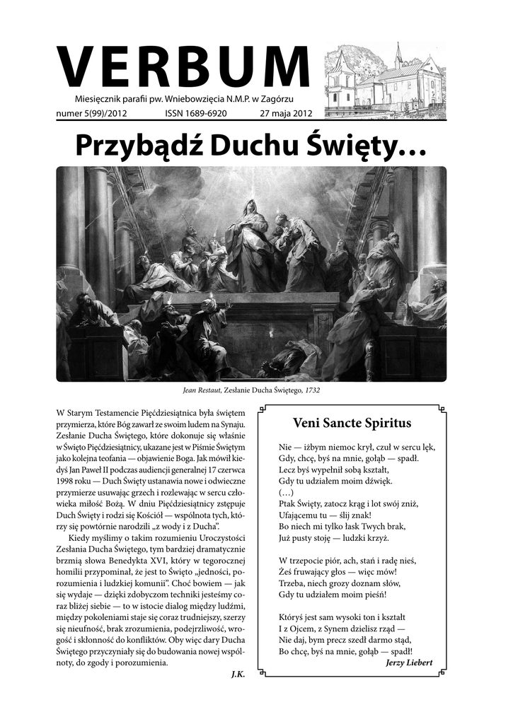 VERBUM Miesięcznik parafii pw. Wniebowzięcia N.M.P. w Zagórzu numer 5(99)/2012 ISSN 1689-6920 27 maja 2012 Przybądź Duchu Święty… Jean Restaut, Zesłanie Ducha Świętego, 1732 W Starym Testamencie Pięćdziesiątnica była świętem przymierza, które Bóg zawarł ze swoim ludem na Synaju. Zesłanie Ducha Świętego, które dokonuje się właśnie w Święto Pięćdziesiątnicy, ukazane jest w Piśmie Świętym jako kolejna teofania — objawienie Boga. Jak mówił kie dyś Jan Paweł II podczas audiencji generalnej 17 czerwca 1998 roku — Duch Święty ustanawia nowe i odwieczne przymierze usuwając grzech i rozlewając w sercu czło wieka miłość Bożą. W dniu Pięćdziesiątnicy zstępuje Duch Święty i rodzi się Kościół — wspólnota tych, któ rzy się powtórnie narodzili „z wody i z Ducha”. Kiedy myślimy o takim rozumieniu Uroczystości Zesłania Ducha Świętego, tym bardziej dramatycznie brzmią słowa Benedykta XVI, który w tegorocznej homilii przypominał, że jest to Święto „jedności, po rozumienia i ludzkiej komunii”. Choć bowiem — jak się wydaje — dzięki zdobyczom techniki jesteśmy co raz bliżej siebie — to w istocie dialog między ludźmi, między pokoleniami staje się coraz trudniejszy, szerzy się nieufność, brak zrozumienia, podejrzliwość, wro gość i skłonność do konfliktów. Oby więc dary Ducha Świętego przyczyniały się do budowania nowej wspól noty, do zgody i porozumienia. J.K. Veni Sancte Spiritus Nie — iżbym niemoc krył, czuł w sercu lęk, Gdy, chcę, byś na mnie, gołąb — spadł. Lecz byś wypełnił sobą kształt, Gdy tu udziałem moim dźwięk. (…) Ptak Święty, zatocz krąg i lot swój zniż, Ufającemu tu — ślij znak! Bo niech mi tylko łask Twych brak, Już pusty stoję — ludzki krzyż. W trzepocie piór, ach, stań i radę nieś, Żeś fruwający głos — więc mów! Trzeba, niech grozy doznam słów, Gdy tu udziałem moim pieśń! Któryś jest sam wysoki ton i kształt I z Ojcem, z Synem dzielisz rząd — Nie daj, bym precz szedł darmo stąd, Bo chcę, byś na mnie, gołąb — spadł! Jerzy Liebert Cały Twój przez Krzyż do chwały Już za miesiąc, 26 czerwca, nasza wspólnota parafialna przeżywać będzie wyjątkowe wydarzenie — Nawiedzenie Krzyża Papieskiego, który peregrynuje po Archidiecezji Przemyskiej. W modlitewnym skupieniu, podczas dzie więciotygodniowej nowenny staramy się już przygoto wywać do tego niezwykłego spotkania. Sprzyjać będą temu także kolejne wydarzenia duchowe oraz reko lekcje, bezpośrednio poprzedzające sam dzień nawie dzenia — 23, 24 i 25 czerwca, które prowadzić będzie ks. dr Franciszek Rząsa, koordynujący całość peregry nacji w archidiecezji. Szczegółowy program zamieszczony zostanie w kolejnym numerze „Verbum”, który ukaże się tuż przed rozpoczęciem rekolekcji. Szczególny związek Wielkopiątkowego Krzyża Papieskiego z naszą okolicą, o czym piszemy poniżej, sprawia, że na pewno będzie my bardzo intensywnie przeżywać te dni. Tym bardziej, że w tym samym momencie odbędzie się w naszej parafii intronizacja relikwii bł. Jana Pawła II (zob. s. 4–5). Temat peregrynacji — „Cały Twój przez Krzyż do chwały” należy interpretować — jak czytamy w ma teriałach przygotowanych przez ks. Piotra Kandefera, ks. Stanisława Haręzgę i ks. Waldemara Janigę — w spo sób chrystocentryczny, maryjny, moralny i papieski. Na tych zagadnieniach skupiać się będą także nauki rekolekcyjne, mające pomóc nam jak najbardziej zbli żyć się do tajemnicy Chrystusowego krzyża. W centrum nauk i obrzędów związanych z pe regrynacją znajduje się tajemnica paschalnej ofia ry Chrystusa, który oddaje się każdemu człowiekowi w ofierze Krzyża i Eucharystii. Przez oddanie się woli Ojca Jezus zrealizował odwieczny plan zbawienia ro dzaju ludzkiego, włączając człowieka w swoją paschę i przez wiarę i sakramenty doprowadzając go do udzia łu w swojej chwale. W dziele i chwale Chrystusa oraz w tajemnicy krzyża w najdoskonalszy sposób uczestniczy Maryja, Matka Wcielonego Słowa, czczona w naszym zagór skim sanktuarium jako Matka Nowego Życia. Każdy chrześcijanin, powołany do uczestnicze nia w ofierze Chrystusa, poprzez posłuszeństwo Ewangelii i ofiarną miłość także powinien zaangażo wać się w dzieło zbawienia, do którego konieczne jest kroczenie drogą Krzyża, zaangażowanie w nawróce nie, różne formy zadośćuczynienia, wysiłek ascetycz ny i pokuta. „Uczestnictwo w tajemnicy ofiary Jezusa pozwala doświadczyć miłosierdzia i zobowiązuje do tego, aby wielkodusznie miłosierdzie świadczyć”. Świadkiem i nauczycielem tajemnicy Krzyża jest bł. Jan Paweł II, wzór ofiarnej współpracy z Bożą ła ską, również w tajemnicy podejmowanego cierpienia. Beatyfikacja Papieża Polaka ukazuje „owoc tej tajemni ▶▶▶ 3 Historia Papieskiego Krzyża XIII stację zagórskiej Drogi Krzyżowej wykonuje młody artysta — Sebastian Trafalski (krótka notka o nim za mieszczona jest na stronie 12). Niezwykłym zbiegiem oko liczności Krzyż Papieski, który przybędzie 26 czerwca do naszej parafii, wykonał w 1997 roku je go ojciec — Stanisław Trafalski, również artysta rzeźbiarz — dla swojej żony, Janiny, która po wypadku znalazła się na wóz ku inwalidzkim. Krzyż znalazł swoje miejsce nad łóżkiem pa ni Janiny. Kiedy w 2000 roku mieszkańcy gminy Olszanica wyjeżdżali z pielgrzymką do Watykanu, tak się złożyło, że Stanisław Trafalski miał odnowić figurkę, którą chcieli podarować Papieżowi — jednak pani Janina zdecydowała, żeby ofiarować swój krucyfiks. Tak też się stało. Jakie było zdziwie nie Państwa Trafalskich, kiedy pięć lat później w pa miętny Wielki Piątek, osiem dni przed śmiercią Jana Pawła II, zobaczyli Ojca Świętego przed „ich” krzy żem, cierpiącego, skupionego na modlitwie, a potem 2 przytulonego do krz
