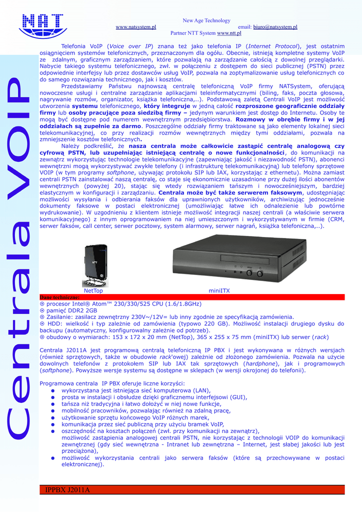 New Age Technology www.natsystem.pl email: [email protected] Partner NTT System www.ntt.pl Telefonia VoIP (Voice over IP) znana też jako telefonia IP (Internet Protocol), jest ostatnim osiągnięciem systemów telefonicznych, przeznaczonym dla ogółu. Obecnie, istnieją kompletne systemy VoIP ze zdalnym, graficznym zarządzaniem, które pozwalają na zarządzanie całością z dowolnej przeglądarki. Nabycie takiego systemu telefonicznego, zwł. w połączeniu z dostępem do sieci publicznej (PSTN) przez odpowiednie interfejsy lub przez dostawców usług VoIP, pozwala na zoptymalizowanie usług telefonicznych co do samego rozwiązania technicznego, jak i kosztów. Przedstawiamy Państwu najnowszą centralę telefoniczną VoIP firmy NATSystem, oferującą nowoczesne usługi i centralne zarządzanie aplikacjami teleinformatycznymi (biling, faks, poczta głosowa, nagrywanie rozmów, organizator, książka telefoniczna,..). Podstawową zaletą Centrali VoIP jest możliwość utworzenia systemu telefonicznego, który integruje w jedną całość rozproszone geograficznie oddziały firmy lub osoby pracujące poza siedzibą firmy – jedynym warunkiem jest dostęp do Internetu. Osoby te mogą być dostępne pod numerem wewnętrznym przedsiębiorstwa. Rozmowy w obrębie firmy i w jej oddziałach są zupełnie za darmo. Poszczególne oddziały firmy traktowane są jako elementy lokalnej sieci telekomunikacyjnej, co przy realizacji rozmów wewnętrznych między tymi oddziałami, pozwala na zmniejszenie kosztów telefonicznych. Należy podkreślić, że nasza centrala może całkowicie zastąpić centralę analogową czy cyfrową PSTN, lub uzupełniając istniejącą centralę o nowe funkcjonalności, do komunikacji na zewnątrz wykorzystując technologie telekomunikacyjne (zapewniając jakość i niezawodność PSTN), abonenci wewnętrzni mogą wykorzystywać zwykłe telefony (i infrastrukturę telekomunikacyjną) lub telefony sprzętowe VOIP (w tym programy softphone, używając protokołu SIP lub IAX, korzystając z ethernetu). Można zamiast centrali PSTN zainstalować naszą centralę, co staje się ekonomicznie uzasadnione przy dużej ilości abonentów wewnętrznych (powyżej 20), stając się wtedy rozwiązaniem tańszym i nowocześniejszym, bardziej elastycznym w konfiguracji i zarządzaniu. Centrala może być także serwerem faksowym, udostępniając możliwości wysyłania i odbierania faksów dla uprawnionych użytkowników, archiwizując jednocześnie dokumenty faksowe w postaci elektronicznej (umożliwiając łatwe ich odnalezienie lub powtórne wydrukowanie). W uzgodnieniu z klientem istnieje możliwość integracji naszej centrali (a właściwie serwera komunikacyjnego) z innym oprogramowaniem na niej umieszczonym i wykorzystywanym w firmie (CRM, serwer faksów, call center, serwer pocztowy, system alarmowy, serwer nagrań, książka telefoniczna,..). NetTop miniITX Dane techniczne: procesor Intel® Atom™ 230/330/525 CPU (1.6/1.8GHz) pamięć DDR2 2GB Zasilanie: zasilacz zewnętrzny 230V~/12V= lub inny zgodnie ze specyfikacją zamówienia. HDD: wielkość i typ zależnie od zamówienia (typowo 220 GB). Możliwość instalacji drugiego dysku do backupu (automatyczny, konfigurowalny zależnie od potrzeb). obudowy o wymiarach: 153 x 172 x 20 mm (NetTop), 365 x 255 x 75 mm (miniITX) lub serwer (rack) Centrala J2011A jest programową centralą telefoniczną IP PBX i jest wykonywana w różnych wersjach (również sprzętowych, także w obudowie rack'owej) zależnie od złożonego zamówienia. Pozwala na użycie dowolnych telefonów z protokołem SIP lub IAX tak sprzętowych (hardphone), jak i programowych (softphone). Powyższe wersje systemu są dostępne w sklepach (w wersji okrojonej do telefonii). Programowa centrala IP PBX oferuje liczne korzyści: ● wykorzystana jest istniejąca sieć komputerowa (LAN), ● prosta w instalacji i obsłudze dzięki graficznemu interfejsowi (GUI), ● tańsza niż tradycyjna i łatwo dołożyć w niej nowe funkcje, ● mobilność pracowników, pozwalając również na zdalną pracę, ● użytkowanie sprzętu końcowego VoIP różnych marek, ● komunikacja przez sieć publiczną przy użyciu bramek VoIP, ● oszczędność na kosztach połączeń (zwł. przy komunikacji na zewnątrz), możliwość zastąpienia analogowej centrali PSTN, nie korzystając z technologii VOIP do komunikacji zewnętrznej (gdy sieć wewnętrzna - Intranet lub zewnętrzna – Internet, jest słabej jakości lub jest przeciążona), ● możliwość wykorzystania centrali jako serwera faksów (które są przechowywane w postaci elektronicznej). IPPBX J2011A Oferowany system telefonii VoIP zawiera następujące elementy składowe: 1. Sprzęt (Centrala IP PBX J2011A – niezbędna, przełącznik i bramki – opcja). 2. Oprogramowanie - zintegrowany system NAT oparty na Linuksie. Zastosowany sprzęt został wybrany pod kątem najmniejszego poboru energii, dużej wydajności, cichej pracy (NetTop nie posiada ruchomych urządzeń chłodzących, miniITX – dwa/trzy wiatraczki) i małych wymiarów. Dlatego, pracuje praktycznie w dowolnych pomieszczeniach (także biurowych) i potrafi obsługiwać wielu abonentów przy niewielkich kosztach eksploatacyjnych. Wersja podstawowa systemu zawiera tylko telefonię obejmującą połączenia głosowe i wizyjne (wraz z historią połączeń i nagrywaniem), pocztę głosową, ale można rozbudować o nowe funkcje (np. Faks, CRM, Hotel, wideokonferencje, szyfrowanie połączeń,...). Komunikaty głosowe i menu obejmuje kilka języków, w tym oczywiście polski w wersji podstawowej. życzenie klienta istnieje możliwość dostosowania menu i nagrania komunikatów w innych językach. Na System może współpracować z istniejącą centralką (analogową lub cyfrową) i: • ułatwia proste i szybkie zwiększanie liczby abonentów, • pozwala na darmową łączność abonentów VoIP z abonentami lokalnymi (po skróconym numerze wewnętrzny