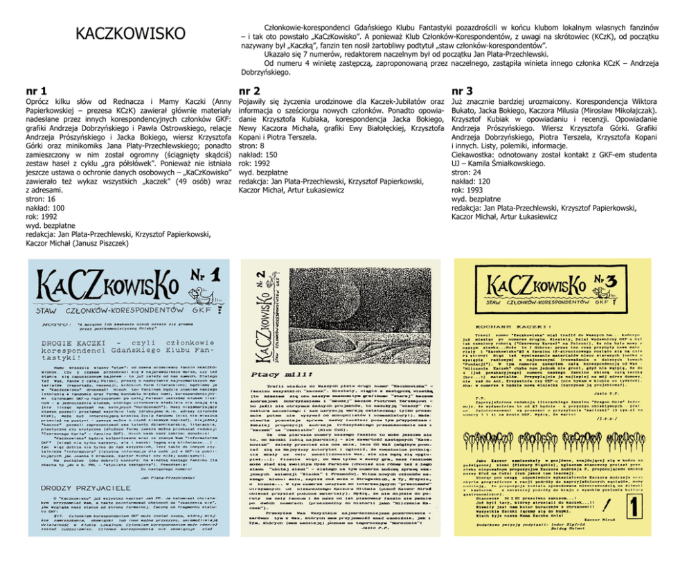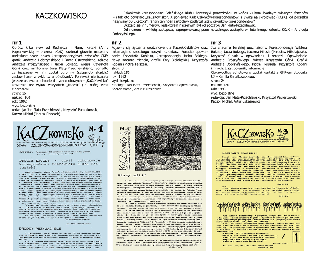 KACZKOWISKO Członkowie-korespondenci Gdańskiego Klubu Fantastyki pozazdrościli w końcu klubom lokalnym własnych fanzinów – i tak oto powstało „KaCzKowisko”. A ponieważ Klub Członków-Korespondentów, z uwagi na skrótowiec (KCzK), od początku nazywany był „Kaczką”, fanzin ten nosił żartobliwy podtytuł „staw członków-korespondentów”. Ukazało się 7 numerów, redaktorem naczelnym był od początku Jan Plata-Przechlewski. Od numeru 4 winietę zastępczą, zaproponowaną przez naczelnego, zastąpiła winieta innego członka KCzK – Andrzeja Dobrzyńskiego. nr 1 nr 2 nr 3 Oprócz kilku słów od Rednacza i Mamy Kaczki (Anny Papierkowskiej – prezesa KCzK) zawierał głównie materiały nadesłane przez innych korespondencyjnych członków GKF: grafiki Andrzeja Dobrzyńskiego i Pawła Ostrowskiego, relacje Andrzeja Prószyńskiego i Jacka Bokiego, wiersz Krzysztofa Górki oraz minikomiks Jana Platy-Przechlewskiego; ponadto zamieszczony w nim został ogromny (ściągnięty skądciś) zestaw haseł z cyklu „gra półsłówek”. Ponieważ nie istniała jeszcze ustawa o ochronie danych osobowych – „KaCzKowisko” zawierało też wykaz wszystkich „kaczek” (49 osób) wraz z adresami. stron: 16 nakład: 100 rok: 1992 wyd. bezpłatne redakcja: Jan Plata-Przechlewski, Krzysztof Papierkowski, Kaczor Michał (Janusz Piszczek) Pojawiły się życzenia urodzinowe dla Kaczek-Jubilatów oraz informacja o sześciorgu nowych członków. Ponadto opowiadanie Krzysztofa Kubiaka, korespondencja Jacka Bokiego, Newy Kaczora Michała, grafiki Ewy Białołęckiej, Krzysztofa Kopani i Piotra Terszela. stron: 8 nakład: 150 rok: 1992 wyd. bezpłatne redakcja: Jan Plata-Przechlewski, Krzysztof Papierkowski, Kaczor Michał, Artur Łukasiewicz Już znacznie bardziej urozmaicony. Korespondencja Wiktora Bukato, Jacka Bokiego, Kaczora Milusia (Mirosław Mikołajczak). Krzysztof Kubiak w opowiadaniu i recenzji. Opowiadanie Andrzeja Prószyńskiego. Wiersz Krzysztofa Górki. Grafiki Andrzeja Dobrzyńskiego, Piotra Terszela, Krzysztofa Kopani i innych. Listy, polemiki, informacje. Ciekawostka: odnotowany został kontakt z GKF-em studenta UJ – Kamila Śmiałkowskiego. stron: 24 nakład: 120 rok: 1993 wyd. bezpłatne redakcja: Jan Plata-Przechlewski, Krzysztof Papierkowski, Kaczor Michał, Artur Łukasiewicz nr 4 nr 5 nr 6 Pierwszy z winietą Andrzeja Dobrzyńskiego. Obok korespondencji – opowiadania (Kamil Śmiałkowski, Andrzej Habasiński, Brunon Sas), wiersze (Krzysztof Górka), grafiki (Piotr Terszel, Andrzej Dobrzyński, Piotr Storoniak, Andrzej Wojciechowski i inni). Newsy Kaczora Michała. Tradycyjne słowo od Mamy Kaczki. stron: 20 nakład: 120 rok: 1993 wyd. bezpłatne redakcja: Jan Plata-Przechlewski, Krzysztof Papierkowski, Kaczor Michał W przeważającej części numer literacko-graficzny. Opowiadania (Cezary Domarus, Brunon Sas, Witold Nicowski, Dawid Brykalski), grafiki (Piotr Terszel, Jan Plata-Przechlewski, Grzegorz Raczek, Grzegorz Kupiec). Na ostatniej stronie pojawiło się po raz pierwszy Kaczuszkowisko – z opowiadaniem 10-letniego Kuby Roszkowskiego. stron: 20 nakład: 100 rok: 1994 wyd. bezpłatne redakcja: Jan Plata-Przechlewski, Krzysztof Papierkowski, Joanna Zielińska Także numer głównie literacko-graficzny. Opowiadania (Kaczka Joasia – czyli Joanna Zielińska, Witold Nicowski, Brunon Sas, Jacek Drewnowski, Andrzej Prószyński, Cezary Domarus), grafika Andrzej Dobrzyński, Piotr Terszel, Grzegorz Raczek, Jan Plata-Przechlewski i inni), komiks (Piotr Terszel, Jerzy Szyłak). Drugie Kaczuszkowisko – z felietonem 14-letniego Pawła Papierkowskiego. stron: 16 nakład: 100 rok: 1996 wyd. bezpłatne redakcja: Jan Plata-Przechlewski, Krzysztof Ciszewski, Joanna Zielińska nr 7 Numer literacko-graficzny. Obszerny wstępniak poświęcony zmarłemu Andrzejowi Dobrzyńskiemu. Opowiadania (Dawid Brykalski, Jacek Drewnowski, 2x Helena Strokowska, Joanna Zielińska i Rafał A, Ziemkiewicz) i grafika Andrzeja Dobrzyńskiego. stron: 20 nakład: 100 rok: 1996 wyd. bezpłatne redakcja: Jan Plata-Przechlewski, Krzysztof Ciszewski, Joanna Zielińska I to był ostatni numer „KaCzKowiska”. Materiału było jeszcze prawie na kolejny – ale „prawie”. Zresztą nie tylko trudności z pozyskaniem opowiadań i grafik od członkówkorespondentów stały się powodem ostatecznego wyschnięcia stawu. Stający się coraz bardziej fanzinem comiesięczny „Informator GKF" doskonale potrafi zagospodarować wszelkie klubowe (i okołoklubowe) talenty...