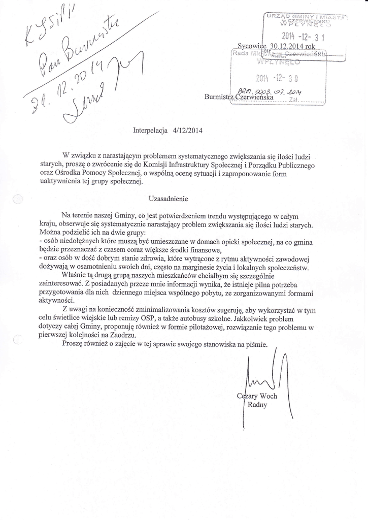 ll ,l \ jt l r, .,ił l/ \ l, 'r-Ą .l V ,/ tq Ęt .. i] l/ lv 7i:iŁ \/L u, -:t3Ę- Jt ll il \,J :]. ,, o? łł4 V |: ., lnterpelacja 4l a -! _.,:_:i. l2l2aI4 \Y zwiąlru znanstającvm problemem systematycznego zwiększania się ilościludzi starych, proszę o zwrócenie się do Komisji InfrastrŃtury Społecznej i Porządku Publicznego oraz OŚrodka Pomocy Społecznej, o wspólną ocenę syluacji i zaproponowanie form uak§rłnienia tej grupy społecznej. uzasadnienie Na terenie naszej Gminy, co jest potwierdzeniem trendu występującego w caĘłn kraju, obserwuje się systematyczrrie narastający problem zwiększania się ilościludzi starych. Mozna podzielić ich na dwie grupy: - osób niedołęznych które musząbyć umieszczane w domach opieki społecznej, na co gmina będzie przeznaczaó z czasem coraz większę środkifinansowe, - oTaZ osób w doŚĆ dobrym stanie zdrowia, które wylrącone z rytnru akrywnościzawodowej doĄrwająw osamotnieniu swoich dni, często na marginesie Ęciai lokalnych społeczeństw. właśnietą drugą grupą naszych mieszkńców chciałbym się szczególńe zainteresowaÓ. Z posiadanychprzeze mnie infonrracji wlnika, że istnieje pilna potrzeba PrzYgotowania dla nich dzienrrego miejsca wspólnego pobyĘ ze zorganizowanym,i formami akĘwności. Z uwag na koniecznośćzrrinimalizowania kosźów sugeruję, aby wykorzystać w Ęrm celu Świętlice wiejskie lub remĘ OSP, a także autobusy szkolne. Jakkoiwiek problem doĘczy całej Gminy, proponuję równiez w formie pilotżowej ,rczwiryańe tego problemu w pierwszej kolej nościna Zao drzu. proszę równiez o zajęcie w tej sprawie swojego stanowiska na piśmie. Woch Radny t i