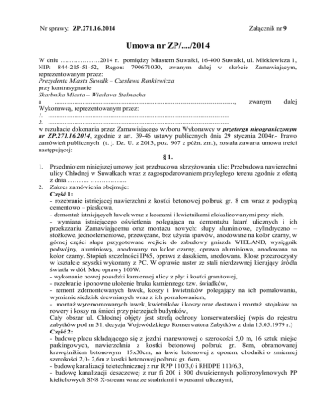 Nr sprawy: ZP.271.16.2014 Załącznik nr 9 Umowa nr ZP/..../2014 W dniu ………………2014 r. pomiędzy Miastem Suwałki, 16-400 Suwałki, ul. Mickiewicza 1, NIP: 844-215-51-52, Regon: 790671030, zwanym dalej w skrócie Zamawiającym, reprezentowanym przez: Prezydenta Miasta Suwałk – Czesława Renkiewicza przy kontrasygnacie Skarbnika Miasta – Wiesława Stelmacha a .............................................................................................................., zwanym dalej Wykonawcą, reprezentowanym przez: 1. ............................................................................................................... 2. ............................................................................................................... w rezultacie dokonania przez Zamawiającego wyboru Wykonawcy w przetargu nieograniczonym nr ZP.271.16.2014, zgodnie z art. 39-46 ustawy publicznych dnia 29 stycznia 2004r.- Prawo zamówień publicznych (t. j. Dz. U. z 2013, poz. 907 z późn. zm.), została zawarta umowa treści następującej: § 1. 1. 2. Przedmiotem niniejszej umowy jest przebudowa skrzyżowania ulic: Przebudowa nawierzchni ulicy Chłodnej w Suwałkach wraz z zagospodarowaniem przyległego terenu zgodnie z ofertą z dnia……….. …………….. Zakres zamówienia obejmuje: Część 1: - rozebranie istniejącej nawierzchni z kostki betonowej polbruk gr. 8 cm wraz z podsypką cementowo – piaskowa, - demontaż istniejących ławek wraz z koszami i kwietnikami zlokalizowanymi przy nich, - wymiana istniejącego oświetlenia polegająca na demontażu latarń ulicznych i ich przekazaniu Zamawiającemu oraz montażu nowych: słupy aluminiowe, cylindryczno – stożkowe, jednoelementowe, przewężane, bez użycia spawów, anodowane na kolor czarny, w górnej części słupa przygotowane wejście do zabudowy gniazda WIELAND, wysięgnik podwójny, aluminiowy, anodowany na kolor czarny, oprawa aluminiowa, anodowana na kolor czarny. Stopień szczelności IP65, oprawa z daszkiem, anodowana. Klosz przezroczysty w kształcie szyszki wykonany z PC. W oprawie raster ze stali nierdzewnej kierujący źródła światła w dół. Moc oprawy 100W. - wykonanie nowej posadzki kamiennej ulicy z płyt i kostki granitowej, - rozebranie i ponowne ułożenie bruku kamiennego tzw. świadków, - remont zdemontowanych ławek, koszy i kwietników polegający na ich pomalowaniu, wymianie siedzisk drewnianych wraz z ich pomalowaniem, - montaż wyremontowanych ławek, kwietników i koszy oraz dostawa i montaż stojaków na rowery i koszy na śmieci przy pierzejach budynków, Cały obszar ul. Chłodnej objęty jest strefą ochrony konserwatorskiej (wpis do rejestru zabytków pod nr 31, decyzja Wojewódzkiego Konserwatora Zabytków z dnia 15.05.1979 r.) Część 2: - budowę placu składającego się z jezdni manewrowej o szerokości 5,0 m, 16 sztuk miejsc parkingowych, nawierzchnia z kostki betonowej polbruk gr. 8cm, obramowanej krawężnikiem betonowym 15x30cm, na ławie betonowej z oporem, chodniki o zmiennej szerokości 2,0- 2,6m z kostki betonowej polbruk gr. 6cm, - budowę kanalizacji teletechnicznej z rur RPP 110/3,0 i RHDPE 110/6,3, - budowę kanalizacji deszczowej z rur fi 200 i 300 dwuściennych polipropylenowych PP kielichowych SN8 X-stream wraz ze studniami i wpustami ulicznymi, 3. 4. 5. - budowę oświetlenia ulicznego, słupy aluminiowe o przekroju okrągłym, bez szwu, zabudowane na fundamentach prefabrykowanych typu SAL-60 z wysięgnikiem pojedynczym WA-20/1 anodowane w kolorze czarnym prod. ROSA lub równoważne. Słupy powinny być wyposażone w uchwyty na flagi. Na proj. słupach montować oprawy oświetleniowe typu OW S-100W prod. ROSA lub równoważne. Szczegółowy zakres robót opisany został w SIWZ w tym dokumentacji projektowej, specyfikacjach technicznych wykonania i odbioru robót budowlanych i przedmiarach robót. Wykonawca zobowiązuje się do wykonania przedmiotu umowy zgodnie z zasadami wiedzy technicznej i sztuki budowlanej, obowiązującymi przepisami i polskimi normami oraz oddania przedmiotu niniejszej umowy Zamawiającemu w terminie w niej uzgodnionym. Zamówienie dotyczy projektu pn. „Poprawa infrastruktury publicznej w celu zwiększenia atrakcyjności turystycznej w regionie transgranicznym”, zadanie inwestycyjne: „Przebudowa nawierzchni ulicy Chłodnej w Suwałkach wraz z zagospodarowaniem przyległego terenu”. Jest to projekt transgraniczny, który będzie realizowany w ramach Programu Współpracy Transgranicznej Litwa – Polska – Rosja na lata 2007-2013. § 2. 1. Termin wykonania zamówienia: część 1 – 20 czerwca 2014r., część 2 – 9 lipca 2014r. 2. Termin zakończenia zamówienia oznacza faktyczne zakończenie robót, zgłoszone przez Kierownika budowy w dzienniku budowy i potwierdzone przez Nadzór Inwestorski. §3 Obowiązki zamawiającego Do obowiązków Zamawiającego należy: 1) Wprowadzenie i protokolarne przekazanie Wykonawcy terenu robót wraz z dziennikiem budowy, 2) Zapewnienie nadzoru inwestorskiego, inspektorami nadzoru będą: …………………………………………………………………………………… 3) Odebranie przedmiotu Umowy po sprawdzeniu jego należytego wykonania; 4) Terminowa zapłata wynagrodzenia za wykonane i odebrane prace. §4 Obowiązki Wykonawcy 1. Do obowiązków Wykonawcy należy: 1) Dostarczenie oświadczenia kierownika budowy stwierdzające sporządzenie planu bezpieczeństwa i ochrony zdrowia i przyjęcie obowiązku kierowania budową oraz dostarczenie informacji zawierających dane zamieszczane w ogłoszeniu, o których mowa w art. 42 ust. 2 pkt 2 Prawa budowlanego w terminie 5 dni od daty podpisania umowy, 2) Przejęcie terenu robót od Zamawiającego; 3) Opracowanie przed rozpoczęciem robót: b) planu bezpieczeństwa i ochrony zdrowia c) projektu organizacji robót, 4) Zabezpieczenie i wygrodzenie terenu robót; 5) Zapewnienie dozoru mienia na terenie robót na własny koszt; 