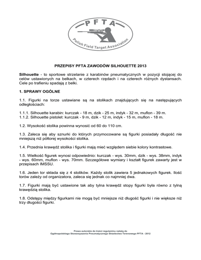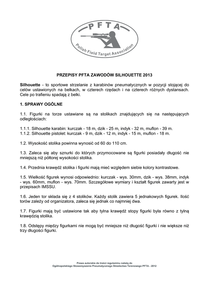 PRZEPISY PFTA ZAWODÓW SILHOUETTE 2013 Silhouette - to sportowe strzelanie z karabinów pneumatycznych w pozycji stojącej do celów ustawionych na belkach, w czterech rzędach i na czterech różnych dystansach. Cele po trafieniu spadają z belki. 1. SPRAWY OGÓLNE 1.1. Figurki na torze ustawiane są na stolikach znajdujących się na następujących odległościach: 1.1.1. Silhouette karabin: kurczak - 18 m, dzik - 25 m, indyk - 32 m, muflon - 39 m. 1.1.2. Silhouette pistolet: kurczak - 9 m, dzik - 12 m, indyk - 15 m, muflon - 18 m. 1.2. Wysokość stolika powinna wynosić od 60 do 110 cm. 1.3. Zaleca się aby sznurki do których przymocowane są figurki posiadały długość nie mniejszą niż półtorej wysokości stolika. 1.4. Przednia krawędź stolika i figurki mają mieć względem siebie kolory kontrastowe. 1.5. Wielkość figurek wynosi odpowiednio: kurczak - wys. 30mm, dzik - wys. 38mm, indyk - wys. 60mm, muflon - wys. 70mm. Szczegółowe wymiary i kształt figurek zawarty jest w przepisach IMSSU. 1.6. Jeden tor składa się z 4 stolików. Każdy stolik zawiera 5 jednakowych figurek. Ilość torów zależy od organizatora, zaleca się jednak co najmniej dwa. 1.7. Figurki mają być ustawione tak aby tylna krawędź stopy figurki była równo z tylną krawędzią stolika. 1.8. Odstępy między figurkami nie mogą być mniejsze niż długość figurki i nie większe niż trzy długości figurki. Prawa autorskie do treści regulaminu należą do Ogółnopolskiego Stowarzyszenia Pneumatycznego Strzelectwa Terenowego PFTA - 2012 2. ZAWODY 2.1. Wszystkie strzały oddajemy z pozycji stojącej. Cele należy strzelać w kolejności od lewej do prawej, poczynając od kurczaków a kończąc na muflonach. 2.2. Zawody składają się z dwóch serii po 20 strzałów. Zawodnicy strzelają najpierw serię dwudziestu strzałów według kolejności wyłonionej w losowaniu. Kolejność strzelań w drugiej serii ustalona zostaje na podstawie wyników z serii pierwszej. Rozpoczyna zawodnik, który uzyskał najsłabszy wynik, ostatnim strzelcem jest osoba, która osiągnęła najlepszy wynik w pierwszej serii. 2.3. Czas na strzelenie jednej, dwudziesto-strzałowej serii, to 10 minut. Czas zaczyna być liczony po załadowaniu pierwszego śrutu do karabinka i po wydaniu przez sędziego komendy do rozpoczęcia strzelania. Czas nie jest zatrzymywany przy przejściach zawodnika do strzelania kolejnych stolików.2.4. Za zaliczoną uznaje się tylko taką figurkę, która w skutek trafienia spadnie z belki. Figurka która została obrócona, a nawet przewrócona, lecz nie spadła, nie jest liczona jako trafienie. 2.5. Figurka trafiona w niewłaściwej kolejności, nawet jeśli spadnie, nie jest zaliczana. Jeśli oprócz trafionej figurki spadnie z belki inna figurka – nie zostaje ona zaliczona jako trafiona. W takiej sytuacji należy zgłosić sędziemu konieczność naprawy toru. 2.5.1. Trafienie figurki poza kolejnością skutkuje nieprzyznaniem punktów za figurkę trafioną, oraz za figurkę do której powinien zostać oddany strzał. 2.5.2. W przypadku trafienia figurki poza kolejnością, zawodnikowi pozostanie jeden niewykorzystany śrut, który jest zobowiązany okazać sędziemu po zakończeniu strzelania. 2.6. W przypadku konieczności naprawy toru sędzia decyduje o sposobie i momencie naprawy. Naprawa powinna zostać przeprowadzona w sposób nie utrudniający strzelania innym zawodnikom. Podczas naprawy czas danego zawodnika zostaje zatrzymany. Po naprawieniu uszkodzenia, zawodnik kontynuuje swoje strzelanie, od miejsca w którym przerwał, dysponując czasem, jaki pozostał przed przerwaniem strzelania. 2.7. Za każdą zaliczoną jako trafienie figurkę zawodnik otrzymuje jeden punkt. 2.8. Punkty uzyskiwane przez zawodnika zapisywane są na bieżąco przez sędziego podczas trwania konkurencji. Niedopuszczalne jest zapisywanie uzyskanego przez zawodnika wyniku dopiero po ukończeniu strzelania. 2.9. Jeżeli po zakończeniu zawodów , na miejscach 1,2 lub 3 , zawodnicy mają taką samą ilość punktów, przeprowadza się dogrywkę. O kolejności dalszych miejsc , przy tej samej ilości trafień, decyduje "count back". Osoba, która spudłowała jako pierwsza licząc od pierwszego kurczaka z lewej strony, uzyskuje niższe miejsce. 2.10. Zasady dogrywki: Na jednym torze strzela dwóch zawodników. Każdy z zawodników strzela po dwie figurki z każdego stojaka. Czas trwania dogrywki wynosi 4 minuty. W przypadku większej ilości zawodników zakwalifikowanych do dogrywki sędzia dokonuje losowania kolejności strzelań. Prawa autorskie do treści regulaminu należą do Ogółnopolskiego Stowarzyszenia Pneumatycznego Strzelectwa Terenowego PFTA - 2012 3. SPRZĘT 3.1. Do udziału w zawodach dopuszczę się wszelkie wiatrówki - karabinki, pistolety oraz rewolwery, bez ograniczeń w budowie i kalibrze. 3.2. Do zawodów dopuszcza się jedynie sprzęt wystrzeliwujący śrut z energią nie większą niż 17J. 3.3. Dozwolone są jednostki wielostrzałowe - posiadające magazynek. 3.4. Zabrania się korzystania z celowników laserowych. 4. KARABINKI 4.1. Dopuszczalne jest używanie haków, regulowanych stopek i "palmrestów". 4.2. Zabronione jest używanie specjalnych ubrań strzeleckich oraz pasów z nośnym włącznie. Dopuszczalne jest używanie wszelkich rękawic także rękawic strzeleckich. 4.3. Dopuszcza się dokonywanie regulacji lunety w trakcie strzelania. Podczas regulacji czas nie jest zatrzymywany. 5. PISTOLETY 5.1. Długość całkowita pistoletu nie może przekraczać 457 mm a rewolweru 406 mm. Wymiary wraz z przyborami celowniczymi. 5.2. Dozwolone są wszelkie celowniki optyczne w tym lunety i kolimatory oraz przezierniki. 5.3. Dopuszcza się możliwość regulacji przyrządów celowniczych w trakcie strzelania. Podczas regulacji czas nie jest zatrzymywany. 5.4. Zabrania się stosowania w lunetach nakładek na okular (świńskie ucho). 5.5. Pistolety i rewolwery należy trzymać w jedn