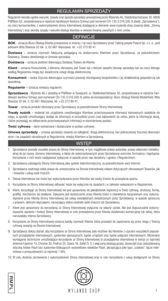 REGULAMIN SPRZEDAŻY Regulamin określa ogólne warunki, zasady oraz sposób sprzedaży prowadzonej przez Mylando AG, Staldenbachstrasse 30, 8808 Pfäffikon SZ, zarejestrowaną w rejestrze handlowym kantonu Schwyz pod numerem CH-130.3.016.592-8 (dalej: „Sprzedawca”), na rzecz konsumentów, z wykorzystaniem strony internetowej działającej w domenie www.mylando.shop (zwanej dalej: „Stroną Internetową”) oraz określa zasady i warunki obsługi klientów w okresie trwania zawartych z nimi umów. DEFINICJE BOK - oznacza Biuro Obsługi Klienta prowadzone w imieniu i na rzecz Sprzedawcy przez Talking people Poland Sp. z o. o., pod adresem Wita Stwosza 32 lok. 3, 02-661 Warszawa. tel. +22 273 90 41. Dostawa – oznacza czynność faktyczną polegającą na dostarczeniu Klientowi przez Sprzedawcę, za pośrednictwem Dostawcy, Towaru określonego w Umowie sprzedaży. Dostawca – oznacza podmiot dokonujący Dostawy Towaru do Klienta. Klient – oznacza Konsumenta, z któremu oferowany jest Towar lub z którym zawarto Umowę sprzedaży lub na rzecz którego według Regulaminu mogą być świadczone usługi drogą elektroniczną. Konsument – osoba fizyczna dokonująca czynności prawnej niezwiązanej bezpośrednio z jej działalnością gospodarczą lub zawodową. Regulamin – oznacza niniejszy regulamin. Sprzedawca - Mylando AG z siedzibą w Pfäffikon w Szwajcarii, ul. Staldenbachstrasse 30, zarejestrowaną w rejestrze handlowym kantonu Schwyz pod numerem CH-130.3.016.592-8, adres do korespondencji: Biuro Obsługi Klienta Westerfield, Wita Stwosza 32 lok. 3, 02-661 Warszawa, tel. +22 273 90 41. Towar – oznacza produkt oferowany przez Sprzedawcę za pośrednictwem Strony Internetowej. Trwały nośnik – materiał lub urządzenie umożliwiające Klientowi przechowywanie informacji kierowanych osobiście do niego, w sposób umożliwiający dostęp do informacji w przyszłości przez czas odpowiedni do celów, jakim te informacje służą, i które pozwalają na odtworzenie przechowywanych informacji w niezmienionej postaci. Treść cyfrowa – dane wytwarzane i dostarczane w postaci cyfrowej. Umowa sprzedaży – umowa sprzedaży zawarta na odległość, drogą elektroniczną, bez jednoczesnej fizycznej obecności stron i na zasadach określonych w Regulaminie, miedzy Klientem a Sprzedawcą.F WSTĘP 1. Sprzedawca posiada wszelkie prawa do Strony Internetowej, w tym majątkowe prawa autorskie, prawa własności intelektualnej do jej nazwy, domeny internetowej, a także do wykorzystywanych przez Sprzedawcę wzorców, formularzy i logotypów. Korzystanie z nich może następować wyłącznie w sposób przez nas określony i zgodny z Regulaminem. 2. Sprzedawca udostępnia Strony Internetową jako system teleinformatyczny, za pośrednictwem sieci Internet. 3. Sprzedawca zastrzega sobie prawo do umieszczania na Stronie Internetowej reklam dotyczących oferowanych Towarów, jak i towarów i usług osób trzecich. 4. Strona Internetowa nie może być wykorzystywana przez Klientów lub osoby trzecie do przesyłania spamu. 5. Korzystanie ze Strony Internetowej odbywać może się wyłącznie na zasadach i w zakresie wskazanym w Regulaminie. 6. Klient, korzystając ze Strony Internetowej nie jest uprawniony do jakiejkolwiek ingerencji w Treść cyfrową, strukturę, formę, grafikę, mechanizm jej działania. Zakazane jest dostarczanie przez Klienta treści o charakterze bezprawnym oraz wykorzystywanie przez Klienta Strony Internetowej lub usług nieodpłatnych świadczonych przez Sprzedawcę, w sposób sprzeczny z prawem, dobrymi obyczajami, naruszający dobra osobiste osób trzecich lub Sprzedawcy. 7. Klient jest uprawniony do korzystania ze Strony Internetowej wyłącznie na własny użytek. Nie jest dopuszczalne wykorzystywanie zasobów i funkcji Strony Internetowej w celu prowadzenia przez Klienta działalności komercyjnej lub takiej, która naruszałaby interes Sprzedawcy. 8. Korzystanie ze Strony Internetowej oznacza każdą czynność Klienta, która prowadzi do zapoznania się przez niego z Treścią cyfrową zawartą na Stronie Internetowej. 9. Sprzedawca dołoży starań, aby korzystanie ze Strony Internetowej było możliwe dla Klientów z użyciem wszystkich popularnych przeglądarek internetowych, systemów operacyjnych, typów urządzeń oraz typów połączeń internetowych. Minimalne wymagania techniczne umożliwiające korzystanie ze Strony Internetowej to przeglądarka internetowa w wersji co najmniej (Internet Explorer 10, Chrome 30, FireFox 24, Opera 16, Safari 5.1) z włączoną obsługą języka Javascript oraz zainstalowaną wtyczką Adobe Flash bez systemów blokujących wyświetlanie obiektów Flash, akceptująca pliki typu „cookies”, łącze internetowe o przepustowości co najmniej 1 M/s. 10.W celu złożenia zamówienia z wykorzystaniem Strony Internetowej oraz w celu korzystania z usług dostępnych na Strony RMPL 1 Internetowej, Klient musi posiadać aktywne konto poczty elektronicznej. 11.Sprzedawca oświadcza, iż publiczny charakter sieci Internet i korzystanie z usług świadczonych drogą elektroniczną wiązać może się z zagrożeniem pozyskania i modyfikowana danych Klientów przez 3 osoby nieuprawnione, dlatego Klienci powinni stosować właściwe środki techniczne, które zminimalizują wskazane wyżej zagrożenia (stosować aktualne programy antywirusowe i chroniące tożsamość korzystających z sieci Internet). 12.Sprzedawca tworzy i wdraża zabezpieczenia przed nieuprawnionym korzystaniem, zwielokrotnianiem lub rozpowszechnianiem treści zawartych na Stronie Internetowej. W przypadku zastosowania przez Sprzedawcę powyższych zabezpieczeń, Klienci zobowiązują się powstrzymać od jakichkolwiek działań zmierzających do usunięcia lub obejścia takich zabezpieczeń lub rozwiązań. ZAMÓWIENIA, PŁATNOŚĆ I REALIZACJA ZAMÓWIEŃ 1. Informacje zawarte na Stronie Internetowej stanowią ofertę Sprzedawcy. 2. Klient może składać zamówie