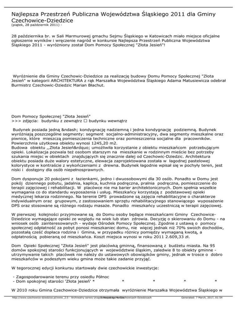 Najlepsza Przestrzeń Publiczna Województwa Śląskiego 2011 dla Gminy Czechowice-Dziedzice (piątek, 28 październik 2011) - 28 października br. w Sali Marmurowej gmachu Sejmu Śląskiego w Katowicach miało miejsce oficjalne ogłoszenie wyników i wręczenie nagród w konkursie Najlepsza Przestrzeń Publiczna Województwa Śląskiego 2011 - wyróżniony został Dom Pomocy Społecznej "Złota Jesień"! Wyróżnienie dla Gminy Czechowic-Dziedzice za realizację budowy Domu Pomocy Społecznej "Złota Jesień" w kategorii ARCHITEKTURA z rąk Marszałka Województwa Śląskiego Adama Matusiewicza odebrał Burmistrz Czechowic-Dziedzic Marian Błachut. Dom Pomocy Społecznej "Złota Jesień" >>> zdjęcia: budynku z zewnątrz budynku wewnątrz Budynek posiada jedną – kondygnację nadziemną i jedna kondygnację podziemną. Budynek wyróżniają poszczególne segmenty: segment socjalno-administracyjny, dwa segmenty mieszkalne oraz piwnice, które mieszczą pomieszczenia techniczne oraz pomieszczenia socjalne dla pracowników. Powierzchnia użytkowa obiektu wynosi 1245,20 m2. Budowa obiektu ,,Złota Jesień” umożliwiła korzystanie z obiektu mieszkańcom potrzebującym opieki. Lokalizacja pozwala też osobom starszym na mieszkanie w rodzinnym mieście bez potrzeby szukania miejsc w obiektach znajdujących się znacznie dalej od Czechowic-Dziedzic. Architektura obiektu posiada duże walory estetyczne, elewacja zaprojektowana została w łagodnej pastelowej kolorystyce w kontraście z wykończeniami z drewna. Budynek łagodnie wpisał się w pochyły teren, jest niski i dostępny dla osób niepełnosprawnych. Dom dysponuje 20 pokojami z łazienkami, jedno i dwuosobowymi dla 30 osób. Ponadto w Domu jest pokój dziennego pobytu, jadalnia, kaplica, kuchnia podręczna, pralnia podręczna, pomieszczenie do terapii zajęciowej i rehabilitacji. W placówce nie ma barier architektonicznych. Dom spełnia wszelkie wymagania co do standardu wyposażenia i usług. Mieszkańcy korzystają z podstawowej opieki medycznej lekarza rodzinnego. Na terenie DPS prowadzone są zajęcia rehabilitacyjne o charakterze indywidualnym oraz grupowym, z zastosowaniem sprzętu rehabilitacyjnego stanowiącego wyposażenie DPS oraz stosowane są różnego rodzaju masaże. Ponadto mieszkańcy uczestniczą w terapii zajęciowej. W pierwszej kolejności przyjmowane są do Domu osoby będące mieszkańcami Gminy CzechowiceDziedzice wymagające opieki ze względu na wiek lub stan zdrowia. Decyzję o skierowaniu do Domu - na wniosek osób zainteresowanych - wydaje Ośrodek Pomocy Społecznej. Zgodnie z ustawą o pomocy społecznej odpłatność za pobyt ponosi mieszkaniec domu, nie więcej jednak niż 70% swoich dochodów, pozostałą cześć dopłaca rodzina i Gmina, w przypadku różnicy pomiędzy wymaganą kwotą, a odpłatnością pobieraną od mieszkańca. Koszt miejsca wynosi w roku 2011 2.609,33 zł. Dom Opieki Społecznej "Złota Jesień" jest placówką gminną, finansowaną z budżetu miasta. Na 95 domów spokojnej starości funkcjonujących w województwie śląskim, zaledwie 8 to obiekty gminne utrzymywanie takich placówek nie należy do ustawowych obowiązków gminy, jednak w trosce o dobro mieszkańców w podeszłym wieku gmina może takie zadanie przyjąć. W tegorocznej edycji konkursu startowały dwie czechowickie inwestycje: - Zagospodarowanie terenu przy osiedlu Północ - Dom spokojnej starości 'Złota jesień' * * * * * W 2010 roku Gmina Czechowice-Dziedzice otrzymała wyróżnienie Marszałka Województwa Śląskiego w http://www.czechowice-dziedzice.pl/www_2.0 - Archiwalny serwis Urzędu Powered Miejskiego by Mambo w Czechowicach-Dziedzicach Generated: 7 March, 2017, 01:54 konkursie Najlepsza Przestrzeń Publiczna Województwa Śląskiego za realizację przebudowy kina Świt. http://www.czechowice-dziedzice.pl/www_2.0 - Archiwalny serwis Urzędu Powered Miejskiego by Mambo w Czechowicach-Dziedzicach Generated: 7 March, 2017, 01:54