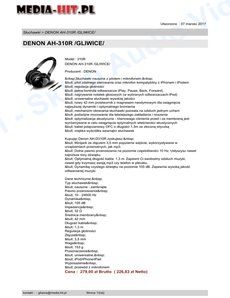 o i d d i V Utworzono : 07 marzec 2017 Słuchawki > DENON AH-310R /GLIWICE/ DENON AH-310R /GLIWICE/ Model : 310R DENON AH-310R /GLIWICE/ p le Producent : DENON l p u A Słuchawki nauszne z pilotem i mikrofonem: • pilot zdalnego sterowania oraz mikrofon kompatybilny z iPhonem i iPodem • regulacja głośności • pełna kontrola odtwarzacza (Play, Pause, Back, Forward) • nagrywanie notatek głosowych (w wybranych odtwarzaczach iPod) • uniwersalne słuchawki wysokiej jakości • nowy 42 mm przetwornik z magnesem neodymowym dla osiągnięcia najwyższej dynamiki i optymalnego brzmienia • mechanizm obracania słuchawki pozwala na odsłuch jednym uchem • podwójne mocowanie dla łatwiejszego zakładania i noszenia • optymalizacja akustyczna - równowaga ciśnienia przed i za membraną jest wyrównywana w celu osiągnięcia optymalnych właściwości akustycznych • kabel połączeniowy OFC o długości 1,3m ze złoconą wtyczką • miękka wyściółka wewnątrz słuchawek k S Kupując Denon AH-D310R zyskujesz: • Minijack ze złączem 3,5 mm popularne wejście, wykorzystywane w urządzeniach przenośnych, jak mp3. • Dolne pasmo przenoszenia na poziomie częstotliwości 10 Hz. Usłyszysz nawet najniższe tony dźwięku. • Optymalną długość kabla: 1,3 m. Zapewni Ci swobodny odsłuch muzyki, nawet gdy trzymasz swoją mp3 czy telefon w plecaku. • Dynamikę czystego dźwięku na poziomie 105 dB. Zapewnia wysoką jakość odtwarzanej muzyki. Dane techniczne: Typ słuchawek • nauszne - zamknięte Pasmo przenoszenia • 10 - 24000 Hz Dynamika • 105 dB Impedancja • 32 Ω Średnica membrany • 42 mm Długość kabla • 1,3 m Regulacja głośności Złącze • 3,5 mm Waga • 153 g Przeznaczenie • uniwersalne, • iPod/iPhone/iPad Wyposażenie • przewód z mikrofonem Cena : 279,00 zł Brutto ( 226,83 zł Netto) kontakt : - [email protected] Strona 1/{nb} o i d d i V Utworzono : 07 marzec 2017 Słuchawki > DENON AH-310R /GLIWICE/ DENON AH-310R /GLIWICE/ l p p le k S u A Dostępność: Produkt dostępny w naszym sklepie od 30 kwiecień 2015 kontakt : - [email protected] Strona 2/{nb}