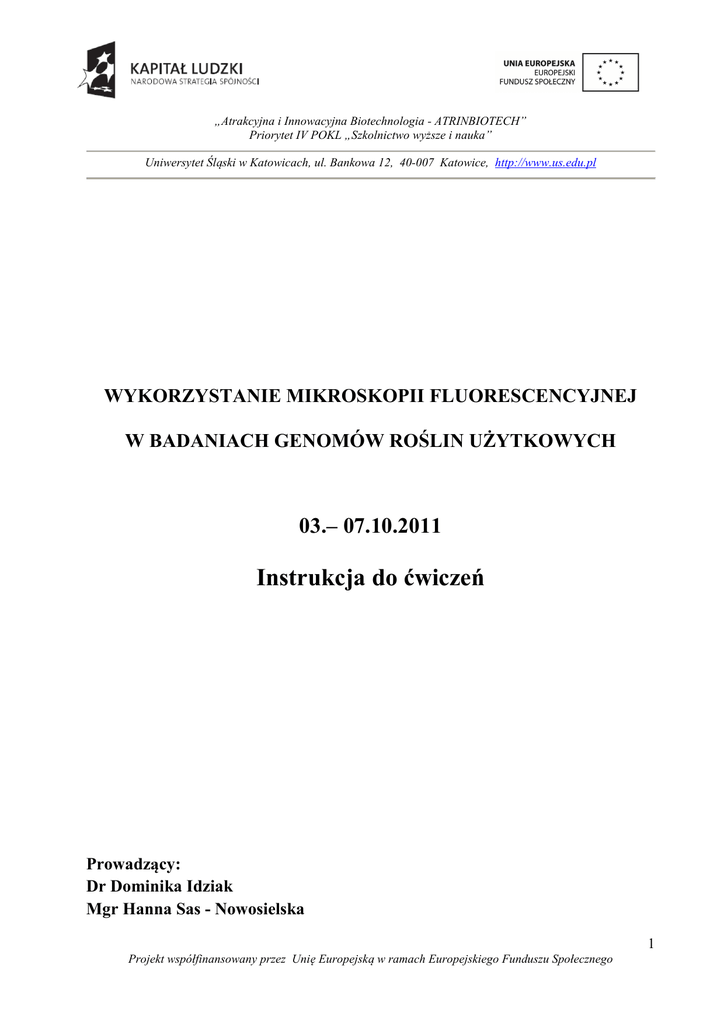 „Atrakcyjna i Innowacyjna Biotechnologia - ATRINBIOTECH” Priorytet IV POKL „Szkolnictwo wyższe i nauka” Uniwersytet Śląski w Katowicach, ul. Bankowa 12, 40-007 Katowice, http://www.us.edu.pl WYKORZYSTANIE MIKROSKOPII FLUORESCENCYJNEJ W BADANIACH GENOMÓW ROŚLIN UŻYTKOWYCH 03.– 07.10.2011 Instrukcja do ćwiczeń Prowadzący: Dr Dominika Idziak Mgr Hanna Sas - Nowosielska 1 Projekt współfinansowany przez Unię Europejską w ramach Europejskiego Funduszu Społecznego „Atrakcyjna i Innowacyjna Biotechnologia - ATRINBIOTECH” Priorytet IV POKL „Szkolnictwo wyższe i nauka” Uniwersytet Śląski w Katowicach, ul. Bankowa 12, 40-007 Katowice, http://www.us.edu.pl ZNAKOWANIE SOND DNA Znakowanie metodą nick – translacji Za pomocą metody nick-translacji można znakować koliste lub liniowe cząsteczki DNA o długości od 1 kpz (np. plazmidy, niektóre produkty PCR) do 20-30 kpz (przeciętna długość sekwencji pofragmentowanego jądrowego DNA), a nawet ok. 100 kpz (klony BAC). Metoda ta nie umożliwia amplifikacji DNA podczas znakowania, zatem ilość znakowanej matrycy DNA potrzebnej do przeprowadzenia jednej reakcji jest stosunkowo duża (0,5-20 µg/20 µl). Przykładowe sondy znakowane metodą nick – translacji: Całkowity genomowy DNA (wyizolowany za pomocą metody C-TAB lub przy użyciu komercyjnych zestawów odczynników do izolacji). Sonda 25S rDNA. Matrycą do znakowania jest fragment DNA o długości 2,3 kpz wycięty w wyniku trawienia restryktazą ClaI z odcinka kodującego 25S rDNA u A. thaliana (Unfried, Gruendler, 1990). Skład mieszaniny reakcyjnej do znakowania metodą nick-translacji Składniki dATP (0,4 mM) dCTP (0,4 mM) dGTP (0,4 mM) dTTP (0,4 mM) 10x bufor reakcyjny DNA do znakowania (100-300 ng/µl) Digoksygenina-11-dUTP (1 mM; Roche, nr kat. 1363905) lub Tetrametylorodamina-5-dUTP (1 mM; Roche, nr kat. 1534378) Mieszanina enzymów DNazy I i polimerazy I (Roche, nr kat. 11745808910) RAZEM Objętość [µl] 2,50 2,50 2,50 1,67 2,00 6,00 0,83 2,00 20,00 Warunki reakcji nick-translacji: 2 Projekt współfinansowany przez Unię Europejską w ramach Europejskiego Funduszu Społecznego „Atrakcyjna i Innowacyjna Biotechnologia - ATRINBIOTECH” Priorytet IV POKL „Szkolnictwo wyższe i nauka” Uniwersytet Śląski w Katowicach, ul. Bankowa 12, 40-007 Katowice, http://www.us.edu.pl 15oC × 95 minut + 65oC × 10 minut+ 4oC × ∞ Znakowanie metodą PCR Metoda ta jest odpowiednia do znakowania kolistych lub liniowych cząsteczek DNA o długości od 0,2 kpz do 1-2 kpz. Pozwala ona na amplifikację DNA podczas procedury znakowania, dzięki czemu ilość matrycy DNA potrzebna do przeprowadzenia reakcji jest stosunkowo niewielka (zwykle 10-50 ng/50 µl). Przykładowe sondy znakowane metodą PCR: Sonda 5S rDNA (pTa794). Sonda znakowana metodą PCR. Matrycę do znakowania stanowi klon wyizolowany z Triticum aestivum (Gerlach, Dyer, 1980). W reakcji PCR wykorzystuje się uniwersalne startery sekwencyjne typu M13 „forward”, (5’-CAG GGT TTT CCC AGT CAC GA-3’) oraz „reverse” (5’-CGG ATA ACA ATT TCA CAC AGG-3’). Skład mieszaniny reakcyjnej dla sondy 5S rDNA Składniki Sterylna woda destylowana Bufor reakcyjny 10× dla polimerazy DNA Taq (Promega) dATP (2,5 mM) dCTP (2,5 mM) dGTP (2,5 mM) dTTP (2,5 mM) M13 forward (starter 5 pmol/ml) M13 reverse (starter 5 pmol/ml DNA (preparat plazmidowy, 20 ng/µl) Tetrametylorodamina-5-dUTP lub digoksygenina-11-dUTP Enzym Taq-polimeraza (5U/µl, Promega) RAZEM Ilość [µl] 27,50 5,00 2,00 2,00 2,00 3,25 2,00 2,00 2,00 1,75 0,50 50,00 Warunki reakcji PCR: 94oC/1 min + [94oC/40 sek. + 55oC/40 sek. + 72oC/60 sek.] ×35 + 72oC/5 min 3 Projekt współfinansowany przez Unię Europejską w ramach Europejskiego Funduszu Społecznego „Atrakcyjna i Innowacyjna Biotechnologia - ATRINBIOTECH” Priorytet IV POKL „Szkolnictwo wyższe i nauka” Uniwersytet Śląski w Katowicach, ul. Bankowa 12, 40-007 Katowice, http://www.us.edu.pl Sonda telomerowa (HT100.3). Matrycę do tworzenia sondy stanowi około 30 powtórzeń telomerowych typu Arabidopsis (TTTAGGG)n znajdujących się w plazmidzie pGEM-T Easy (Promega). Skład mieszaniny reakcyjnej dla sondy telomerowej HT100.3 Składniki Sterylna woda destylowana Bufor reakcyjny 10× dla polimerazy DNA Taq (Promega) dATP (2,5 mM) dCTP (2,5 mM) dGTP (2,5 mM) dTTP (2,5 mM) M13 forward (starter 5 pmol/ml) M13 reverse (starter 5 pmol/ml DNA (preparat plazmidowy, 10 ng/µl) Tetrametylorodamina-5-dUTP lub digoksygenina-11-dUTP Enzym Taq-polimeraza (5U/µl, Promega) RAZEM Ilość [µl] 26,50 5,00 2,00 2,00 2,00 3,25 2,00 2,00 2,00 1,75 0,50 50,00 Warunki reakcji PCR: 94oC/1 min + [94oC/30 sek. + 55oC/40 sek. + 72oC/60 sek.] ×35 + 72oC/5 min 4 Projekt współfinansowany przez Unię Europejską w ramach Europejskiego Funduszu Społecznego „Atrakcyjna i Innowacyjna Biotechnologia - ATRINBIOTECH” Priorytet IV POKL „Szkolnictwo wyższe i nauka” Uniwersytet Śląski w Katowicach, ul. Bankowa 12, 40-007 Katowice, http://www.us.edu.pl Sonda centromerowa (CCS1). Sekwencja CCS1 o długości 260 par zasad wyizolowana z Brachypodium sylvaticum (Aragon-Alcaide i in., 1996). Skład mieszaniny reakcyjnej dla sondy CCS1 Składniki Sterylna woda destylowana Bufor reakcyjny 10× dla polimerazy DNA Taq (Promega) dATP (2,5 mM) dCTP (2,5 mM) dGTP (2,5 mM) dTTP (2,5 mM) CCS1 A (starter) CCS1 B(starter) DNA (sekwencja CCS1) Digoksygenina-11-dUTP lub tetrametylorodamina-5-dUTP Enzym Taq-polimeraza (5U/µl, Promega) RAZEM Ilość [µl] 26,50 5,00 2,00 2,00 2,00 3,25 2,00 2,00 2,00 1,75 0,50 50,00 Warunki reakcji PCR: 94oC/1 min + [94oC/40 sek. + 56oC/40 sek. + 72oC/1 min 10 sek.] ×35 + 72oC/5 min UWAGA: Sondy znakowane tetrametylorodaminą są wrażliwe na światło! 5 Projekt współfinansowany przez Unię Europejską w ramach Europejskiego Funduszu Społecznego „Atrakcyjna i Innowacyjna Biotechnologia - ATRINBIOTECH” Priorytet IV POKL „Szkolnictwo wyższe i nauka” Uniwersytet Śląski w Kato
