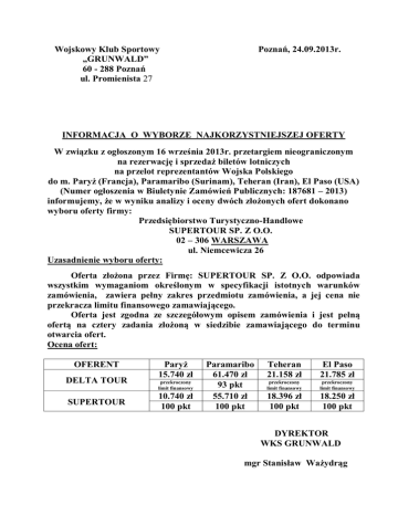 Wojskowy Klub Sportowy „GRUNWALD” 60 - 288 Poznań ul. Promienista 27 Poznań, 24.09.2013r. INFORMACJA O WYBORZE NAJKORZYSTNIEJSZEJ OFERTY W związku z ogłoszonym 16 września 2013r. przetargiem nieograniczonym na rezerwację i sprzedaż biletów lotniczych na przelot reprezentantów Wojska Polskiego do m. Paryż (Francja), Paramaribo (Surinam), Teheran (Iran), El Paso (USA) (Numer ogłoszenia w Biuletynie Zamówień Publicznych: 187681 – 2013) informujemy, że w wyniku analizy i oceny dwóch złożonych ofert dokonano wyboru oferty firmy: Przedsiębiorstwo Turystyczno-Handlowe SUPERTOUR SP. Z O.O. 02 – 306 WARSZAWA ul. Niemcewicza 26 Uzasadnienie wyboru oferty: Oferta złożona przez Firmę: SUPERTOUR SP. Z O.O. odpowiada wszystkim wymaganiom określonym w specyfikacji istotnych warunków zamówienia, zawiera pełny zakres przedmiotu zamówienia, a jej cena nie przekracza limitu finansowego zamawiającego. Oferta jest zgodna ze szczegółowym opisem zamówienia i jest pełną ofertą na cztery zadania złożoną w siedzibie zamawiającego do terminu otwarcia ofert. Ocena ofert: OFERENT DELTA TOUR SUPERTOUR Paryż 15.740 zł przekroczony limit finansowy 10.740 zł 100 pkt Paramaribo 61.470 zł 93 pkt 55.710 zł 100 pkt Teheran 21.158 zł El Paso 21.785 zł przekroczony limit finansowy przekroczony limit finansowy 18.396 zł 100 pkt 18.250 zł 100 pkt DYREKTOR WKS GRUNWALD mgr Stanisław Ważydrąg
