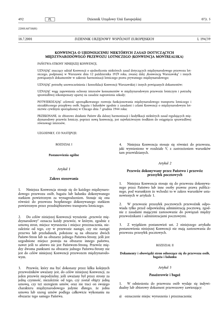 492 Dziennik Urzędowy Unii Europejskiej PL 07/t. 5 22001A0718(01) DZIENNIK URZĘDOWY WSPÓLNOT EUROPEJSKICH 18.7.2001 L 194/39 KONWENCJA O UJEDNOLICENIU NIEKTÓRYCH ZASAD DOTYCZĄCYCH MIĘDZYNARODOWEGO PRZEWOZU LOTNICZEGO (KONWENCJA MONTREALSKA) PAŃSTWA-STRONY NINIEJSZEJ KONWENCJI, UZNAJĄC znaczący udzial Konwencji o ujednoliceniu niektórych zasad dotyczących międzynarodowego przewozu lotniczego, podpisanej w Warszawie dnia 12 października 1929 roku, zwanej dalej „Konwencją Warszawską” i innych powiązanych dokumentów w zakresie harmonizacji lotniczego prawa prywatnego międzynarodowego; UZNAJĄC potrzebę unowocześnienia i konsolidacji Konwencji Warszawskiej i innych powiązanych dokumentów; UZNAJĄC wagę zapewnienia ochrony interesów konsumentów w międzynarodowym przewozie lotniczym i potrzebę sprawiedliwej rekompensaty opartej na zasadzie naprawienia szkody; POTWIERDZAJĄC celowość uporządkowanego rozwoju funkcjonowania międzynarodowego transportu lotniczego i niezaklóconego przeplywu osób, bagażu i ladunków zgodnie z zasadami i celami Konwencji o międzynarodowym lotnictwie cywilnym sporządzonej w Chicago dnia 7 grudnia 1944 roku; PRZEKONANE, że zbiorowe dzialanie Państw dla dalszej harmonizacji i kodyfikacji niektórych zasad regulujących międzynarodowy przewóz lotniczy, poprzez nową konwencję, jest najwlaściwszym środkiem do osiągnięcia sprawiedliwej równowagi interesów, UZGODNILY, CO NASTĘPUJE: ROZDZIAL I Postanowienia ogólne 4. Niniejsza Konwencja stosuje się również do przewozu, jaki wymieniono w rozdziale V, z zastrzeżeniem warunków tam przewidzianych. Artykul 2 Artykul 1 Przewóz dokonywany przez Państwo i przewóz przesylek pocztowych Zakres stosowania 1. Niniejsza Konwencja stosuje się do każdego międzynarodowego przewozu osób, bagażu lub ladunku dokonywanego statkiem powietrznym za wynagrodzeniem. Stosuje się ona również do przewozu bezplatnego dokonywanego statkiem powietrznym przez przedsiębiorstwo transportu lotniczego. 2. Do celów niniejszej Konwencji wyrażenie „przewóz międzynarodowy” oznacza każdy przewóz, w którym, zgodnie z umową stron, miejsce wyruszenia i miejsce przeznaczenia, niezależnie od tego, czy w przewozie nastąpi, czy nie nastąpi przerwa lub przeladunek, polożone są na obszarze dwóch Państw-Stron lub na obszarze jednego Państwa-Strony, jeśli jest uzgodnione miejsce postoju na obszarze innego państwa, nawet jeśli to aństwo nie jest Państwem-Stroną. Przewóz między dwoma punktami na obszarze jednego Państwa-Strony nie jest do celów niniejszej Konwencji przewozem międzynarodowym. 3. Przewóz, który ma być dokonany przez kilku kolejnych przewoźników uważany jest, do celów niniejszej Konwencji, za jeden przewóz niepodzielny, jeśli uważany byl przez strony za jedną czynność, niezależnie od tego, czy zostal objęty jedną umową, czy też szeregiem umów, oraz nie traci on swojego charakteru międzynarodowego jedynie dlatego, że jedna umowa lub szereg umów podlega calkowicie wykonaniu na obszarze tego samego Państwa. 1. Niniejsza Konwencja stosuje się do przewozu dokonywanego przez Państwo lub inne osoby prawne prawa publicznego, pod warunkiem że wchodzi to w zakres warunków ustanowionych w artykule 1. 2. W przewozie przesylek pocztowych przewoźnik odpowiada tylko przed odpowiednią administracją pocztową, zgodnie z zasadami mającymi zastosowanie do powiązań między przewoźnikami i administracjami pocztowymi. 3. Z wyjątkiem postanowień ust. 2 niniejszego artykulu postanowienia niniejszej Konwencji nie mają zastosowania do przewozu przesylek pocztowych. ROZDZIAL II Dokumenty i obowiązki stron odnoszące się do przewozu osób, bagażu i ladunku Artykul 3 Pasażerowie i bagaż 1. W odniesieniu do przewozu osób wydaje się indywidualny lub zbiorowy dokument przewozowy zawierający: a) oznaczenie miejsc wyruszenia i przeznaczenia; 07/t. 5 Dziennik Urzędowy Unii Europejskiej PL b) jeśli miejsca wyruszenia i przeznaczenia są polożone na obszarze jednego Państwa-Strony, a przewidziane jedno lub więcej miejsc postoju znajduje się na obszarze innego Państwa, oznaczenie co najmniej jednego takiego miejsca postoju. 2. Każdy inny środek zawierający informację wskazaną w ust. 1 może zastąpić wydanie dokumentu określonego w tym ustępie. Jeśli używa się takiego innego środka, przewoźnik dostarcza pasażerowi oświadczenie na piśmie zawierające takie informacje. 3. Przewoźnik wydaje pasażerowi przywieszkę identyfikacyjną bagażu dla każdej przyjętej sztuki bagażu. 4. Pasażer otrzymuje zawiadomienie na piśmie stwierdzające, że w przypadku gdy ma zastosowanie niniejsza Konwencja, reguluje ona i może ograniczyć odpowiedzialność przewoźników w zakresie śmierci lub uszkodzenia ciala oraz za zniszczenie, utratę lub uszkodzenie bagażu oraz za opóźnienie. 5. Niezgodność z postanowieniami powyższych ustępów nie ma wplywu na istnienie lub ważność umowy przewozu, która mimo wszystko podlega zasadom niniejszej Konwencji, w tym odnoszącym się do ograniczenia odpowiedzialności. Artykul 4 Ladunek 1. W odniesieniu do przewozu ladunku wydaje się lotniczy list przewozowy. 2. Każdy inny środek zawierający zapis mającego się odbyć przewozu może zastąpić wydanie lotniczego listu przewozowego. Jeśli użyty zostaje taki inny środek, przewoźnik, na żądanie nadawcy, wydaje nadawcy potwierdzenie odbioru ladunku umożliwiające identyfikację przesylki i dostęp do informacji ujętych w zapisach zawartych w tych innych środkach. Artykul 5 Treść lotniczego listu przewozowego i potwierdzenia przyjęcia ladunku Lotniczy list przewozowy lub potwierdzenie przyjęcia ladunku zawierają: a) oznaczenie miejsc wyruszenia i przeznaczenia; b) jeśli miejsca wyruszenia i przeznaczenia polożone są na obszarze jednego Państwa-Strony, a przewidziane jedno lub więcej miejsc postoju polożone jest na obszarze innego Pań