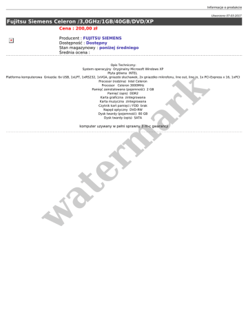 Informacje o produkcie Utworzono 07-03-2017 Fujitsu Siemens Celeron /3,0GHz/1GB/40GB/DVD/XP Cena : 200,00 zł Producent : FUJITSU SIEMENS Dostępność : Dostępny Stan magazynowy : poniżej średniego Średnia ocena : er m ar k Opis Techniczny: System operacyjny Oryginalny Microsoft Windows XP Płyta główna INTEL Platforma komputerowa Gniazda: 6x USB, 1xLPT, 1xRS232, 1xVGA, gniazdo słuchawek, 2x gniazdko mikrofonu, line out, line in, 1x PCI-Express x 16, 1xPCI Procesor (rodzina) Intel Celeron Procesor Celeron 3000MHz Pamięć zainstalowana (pojemność) 2 GB Pamięć (opis) DDR2 Karta graficzna zintegrowana Karta muzyczna zintegrowana Czytnik kart pamięci / FDD brak Napęd optyczny DVD-RW Dysk twardy (pojemność) 80 GB Dysk twardy (opis) SATA w at komputer uzywany w pełni sprawny 3 m-c gwarancji