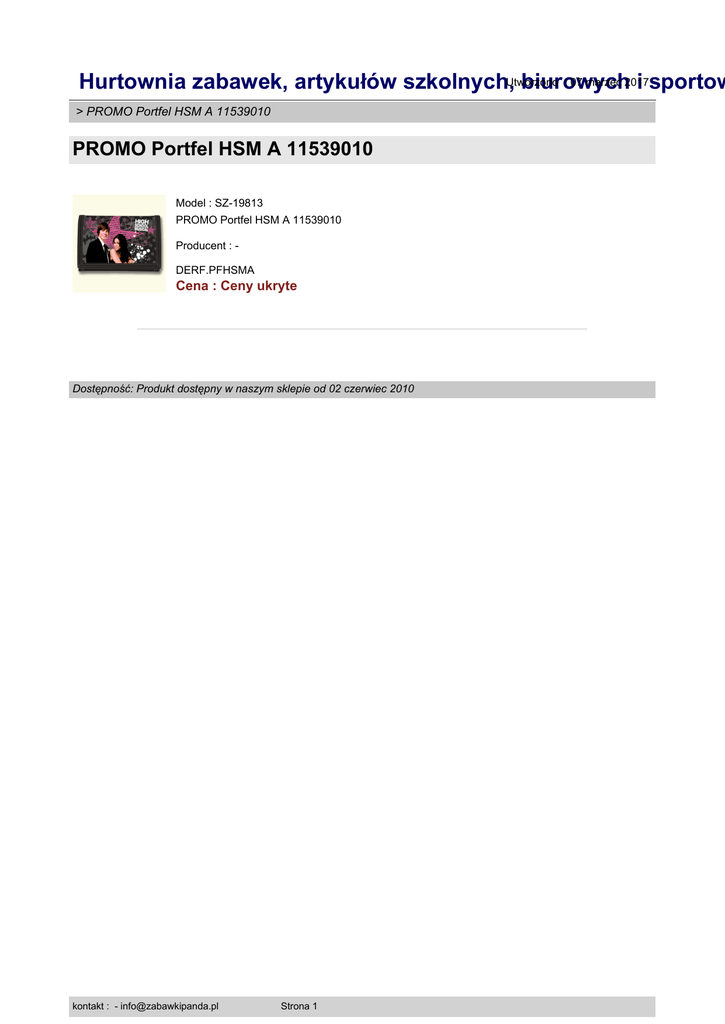 : 07 marzec 2017 Hurtownia zabawek, artykułów szkolnych,Utworzono biurowych i sportow > PROMO Portfel HSM A 11539010 PROMO Portfel HSM A 11539010 Model : SZ-19813 PROMO Portfel HSM A 11539010 Producent : DERF.PFHSMA Cena : Ceny ukryte Dostępność: Produkt dostępny w naszym sklepie od 02 czerwiec 2010 kontakt : - [email protected] Strona 1