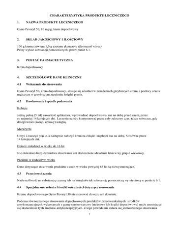 CHARAKTERYSTYKA PRODUKTU LECZNICZEGO 1. NAZWA PRODUKTU LECZNICZEGO Gyno Pevaryl 50, 10 mg/g, krem dopochwowy 2. SKŁAD JAKOŚCIOWY I ILOŚCIOWY 100 g kremu zawiera 1,0 g azotanu ekonazolu (Econazoli nitras). Pełny wykaz substancji pomocniczych, patrz: punkt 6.1. 3. POSTAĆ FARMACEUTYCZNA Krem dopochwowy 4. SZCZEGÓŁOWE DANE KLINICZNE 4.1 Wskazania do stosowania Gyno Pevaryl 50, krem dopochwowy, stosuje się u kobiet w zakażeniach grzybiczych sromu i pochwy oraz u mężczyzn w grzybiczym zapaleniu żołędzi prącia. 4.2 Dawkowanie i sposób podawania Kobiety Jedną, pełną (5 ml) zawartość aplikatora, wprowadzać dopochwowo, raz na dobę przed snem, przez co najmniej 14 kolejnych dni. Leczenie należy kontynuować przez cały zalecony czas, także wówczas, gdy dolegliwości (świąd, upławy) ustąpią. Mężczyźni Umyć i osuszyć prącie, a następnie nałożyć krem na żołądź i napletek raz na dobę. Stosować przez 14 kolejnych dni. Dzieci i młodzież w wieku do 16 lat Nie określono bezpieczeństwa stosowania ani skuteczności działania leku w tej grupie wiekowej. Pacjenci w podeszłym wieku Dane dotyczące stosowania produktu u osób w wieku powyżej 65 lat są niewystarczające. 4.3 Przeciwwskazania Nadwrażliwość na substancję czynną lub na którąkolwiek substancję pomocniczą wymienioną w punkcie 6.1. 4.4 Specjalne ostrzeżenia i środki ostrożności dotyczące stosowania Kremu dopochwowego Gyno Pevaryl 50 nie stosować do oczu ani doustnie. Podczas równoczesnego stosowania dopochwowych produktów przeciwzakaźnych i środków antykoncepcyjnych wykonanych z gumy (prezerwatywy lateksowe lub krążki dopochwowe) może zmniejszyć się skuteczność tych środków antykoncepcyjnych. Z tego powodu nie zaleca się jednoczesnego stosowania 1 kremu dopochwowego Gyno Pevaryl 50 z krążkiem dopochwowym ani z prezerwatywą lateksową. Pacjentki stosujące plemnikobójcze środki antykoncepcyjne należy informować o możliwej inaktywacji plemnikobójczych środków antykoncepcyjnych przez leki dopochwowe stosowane miejscowo. Kremu dopochwowego Gyno Pevaryl 50 nie należy kojarzyć z innym, stosowanym miejscowo (zewnętrznie lub dopochwowo) leczeniem narządów płciowych. Leczenie należy przerwać, jeśli wystąpią nasilone objawy podrażnienia lub uczulenia. U pacjentów z nadwrażliwością na pochodne imidazolowe obserwowano także uczulenie na azotan ekonazolu. 4.5. Interakcje z innymi produktami leczniczymi i inne rodzaje interakcji Ekonazol hamuje aktywność cytochromu CYP3A4/2C9. Ze względu na ograniczoną dostępność ogólnoustrojową po podaniu dopochwowym (patrz: punkt 5.2) jest mało prawdopodobne wystąpienie interakcji mających znaczenie kliniczne, lecz stwierdzano je podczas stosowania doustnych leków przeciwzakrzepowych. U pacjentek stosujących doustne leki przeciwzakrzepowe, takie jak warfaryna czy acenokumarol należy zachować ostrożność i kontrolować działanie przeciwzakrzepowe. 4.6. Wpływ na płodność, ciążę i laktację Ciąża W badaniach na zwierzętach azotan ekonazolu nie wykazywał działania teratogennego, jednak w dużych dawkach działał toksycznie na płód (patrz punkt 5.3). Nie wiadomo czy u ludzi może wystąpić podobne działanie. Z uwagi na wchłanianie substancji czynnej z pochwy, kremu dopochwowego Gyno Pevaryl 50 nie należy stosować w pierwszym trymestrze ciąży, chyba że ma to istotne znaczenie dla zdrowia pacjentki. Krem dopochwowy Gyno Pevaryl 50 można stosować w drugim lub trzecim trymestrze ciąży, jeśli spodziewane korzyści dla matki przeważają nad możliwym ryzykiem dla płodu. Karmienie piersią Po podaniu doustnym azotanu ekonazolu samicom szczura w okresie laktacji, ekonazol i (lub) jego metabolity były wydzielane z mlekiem i wykrywano je u karmionych noworodków. Nie wiadomo, czy azotan ekonazolu przenika do mleka ludzkiego. Stosując krem dopochwowy Gyno Pevaryl 50 u kobiet karmiących piersią, należy zachować ostrożność. 4.7. Wpływ na zdolność prowadzenia pojazdów i obsługiwania maszyn Nieznany. 4.8. Działania niepożądane Dane z badań klinicznych Bezpieczeństwo stosowania ekonazolu w postaci kremu dopochwowego i globulek dopochwowych oceniano u 3630 pacjentek uczestniczących w 32 badaniach klinicznych. W Tabeli 1 przedstawiono działania niepożądane stwierdzone w tych badaniach u ≥1% pacjentek leczonych ekonazolem w postaci kremu dopochwowego lub globulek dopochwowych. 2 Tabela 1. Działania niepożądane stwierdzone w 32 badaniach klinicznych u ≥1% pacjentek leczonych ekonazolem Odsetek pacjentek Klasyfikacja układów i narządów Działanie niepożądane (N=3630) [%] Zaburzenia skóry i tkanki podskórnej Uczucie pieczenia skóry 1,2 Świąd 1,2 W Tabeli 2 przedstawiono działania niepożądane stwierdzone w 32 badaniach klinicznych u <1% pacjentek leczonych ekonazolem w postaci kremu lub globulek. Tabela 2. Działania niepożądane stwierdzone w 32 badaniach klinicznych u <1% pacjentek leczonych ekonazolem Klasyfikacja układów i narządów Działanie niepożądane Zaburzenia skóry i tkanki podskórnej Wysypka Zaburzenia układu rozrodczego i piersi Uczucie pieczenia sromu i pochwy Doświadczenia po wprowadzeniu produktu do obrotu W Tabeli 3 przedstawiono działania niepożądane stwierdzone po raz pierwszy po wprowadzeniu produktu Gyno-Pevaryl 150 do obrotu. Częstości występowania oszacowano na podstawie raportów spontanicznych lub danych z badań klinicznych lub epidemiologicznych w zależności od dostępności danych. Działania niepożądane uszeregowano wg częstości występowania zgodnie z następującym schematem: bardzo często często niezbyt często rzadko bardzo rzadko ≥1/10; ≥1/100 i <1/10; ≥1/1 000 i <1/100; ≥1/10 000 i <1/1000; <1/10 000, w tym pojedyncze doniesienia. Tabela 3. Działania niepożądane stwierdzone po wprowadzeniu produktu Gyno-Pevaryl 150 do obrotu uszeregowane wg częstości występowania na podstawie raport