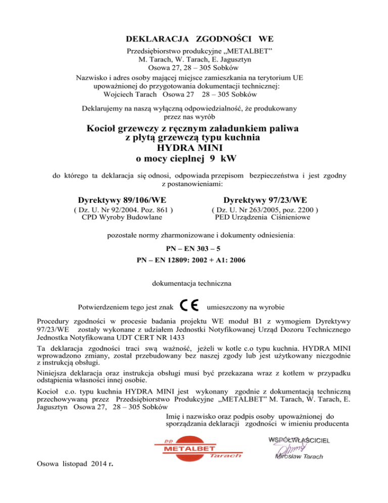 DEKLARACJA ZGODNOŚCI WE Przedsiębiorstwo produkcyjne „METALBET” M. Tarach, W. Tarach, E. Jagusztyn Osowa 27, 28 – 305 Sobków Nazwisko i adres osoby mającej miejsce zamieszkania na terytorium UE upoważnionej do przygotowania dokumentacji technicznej: Wojciech Tarach Osowa 27 28 – 305 Sobków Deklarujemy na naszą wyłączną odpowiedzialność, że produkowany przez nas wyrób Kocioł grzewczy z ręcznym załadunkiem paliwa z płytą grzewczą typu kuchnia HYDRA MINI o mocy cieplnej 9 kW do którego ta deklaracja się odnosi, odpowiada przepisom bezpieczeństwa i jest zgodny z postanowieniami: Dyrektywy 89/106/WE Dyrektywy 97/23/WE ( Dz. U. Nr 92/2004. Poz. 861 ) CPD Wyroby Budowlane ( Dz. U. Nr 263/2005, poz. 2200 ) PED Urządzenia Ciśnieniowe pozostałe normy zharmonizowane i dokumenty odniesienia: PN – EN 303 – 5 PN – EN 12809: 2002 + A1: 2006 dokumentacja techniczna Potwierdzeniem tego jest znak umieszczony na wyrobie Procedury zgodności w procesie badania projektu WE moduł B1 z wymogiem Dyrektywy 97/23/WE zostały wykonane z udziałem Jednostki Notyfikowanej Urząd Dozoru Technicznego Jednostka Notyfikowana UDT CERT NR 1433 Ta deklaracja zgodności traci swą ważność, jeżeli w kotle c.o typu kuchnia. HYDRA MINI wprowadzono zmiany, został przebudowany bez naszej zgody lub jest użytkowany niezgodnie z instrukcją obsługi. Niniejsza deklaracja oraz instrukcja obsługi musi być przekazana wraz z kotłem w przypadku odstąpienia własności innej osobie. Kocioł c.o. typu kuchnia HYDRA MINI jest wykonany zgodnie z dokumentacją techniczną przechowywaną przez Przedsiębiorstwo Produkcyjne „METALBET” M. Tarach, W. Tarach, E. Jagusztyn Osowa 27, 28 – 305 Sobków Imię i nazwisko oraz podpis osoby upoważnionej do sporządzania deklaracji zgodności w imieniu producenta Osowa listopad 2014 r.