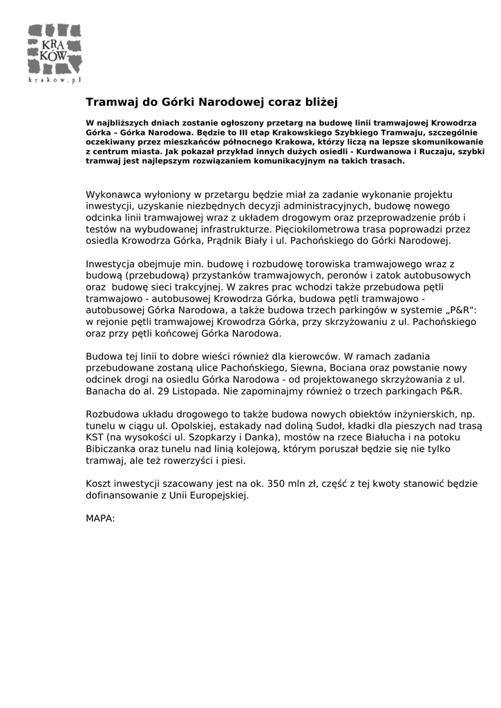 Tramwaj do Górki Narodowej coraz bliżej W najbliższych dniach zostanie ogłoszony przetarg na budowę linii tramwajowej Krowodrza Górka – Górka Narodowa. Będzie to III etap Krakowskiego Szybkiego Tramwaju, szczególnie oczekiwany przez mieszkańców północnego Krakowa, którzy liczą na lepsze skomunikowanie z centrum miasta. Jak pokazał przykład innych dużych osiedli - Kurdwanowa i Ruczaju, szybki tramwaj jest najlepszym rozwiązaniem komunikacyjnym na takich trasach. Wykonawca wyłoniony w przetargu będzie miał za zadanie wykonanie projektu inwestycji, uzyskanie niezbędnych decyzji administracyjnych, budowę nowego odcinka linii tramwajowej wraz z układem drogowym oraz przeprowadzenie prób i testów na wybudowanej infrastrukturze. Pięciokilometrowa trasa poprowadzi przez osiedla Krowodrza Górka, Prądnik Biały i ul. Pachońskiego do Górki Narodowej. Inwestycja obejmuje min. budowę i rozbudowę torowiska tramwajowego wraz z budową (przebudową) przystanków tramwajowych, peronów i zatok autobusowych oraz budowę sieci trakcyjnej. W zakres prac wchodzi także przebudowa pętli tramwajowo - autobusowej Krowodrza Górka, budowa pętli tramwajowo autobusowej Górka Narodowa, a także budowa trzech parkingów w systemie „P&R": w rejonie pętli tramwajowej Krowodrza Górka, przy skrzyżowaniu z ul. Pachońskiego oraz przy pętli końcowej Górka Narodowa. Budowa tej linii to dobre wieści również dla kierowców. W ramach zadania przebudowane zostaną ulice Pachońskiego, Siewna, Bociana oraz powstanie nowy odcinek drogi na osiedlu Górka Narodowa - od projektowanego skrzyżowania z ul. Banacha do al. 29 Listopada. Nie zapominajmy również o trzech parkingach P&R. Rozbudowa układu drogowego to także budowa nowych obiektów inżynierskich, np. tunelu w ciągu ul. Opolskiej, estakady nad doliną Sudoł, kładki dla pieszych nad trasą KST (na wysokości ul. Szopkarzy i Danka), mostów na rzece Białucha i na potoku Bibiczanka oraz tunelu nad linią kolejową, którym poruszał będzie się nie tylko tramwaj, ale też rowerzyści i piesi. Koszt inwestycji szacowany jest na ok. 350 mln zł, część z tej kwoty stanowić będzie dofinansowanie z Unii Europejskiej. MAPA: Powered by TCPDF (www.tcpdf.org)