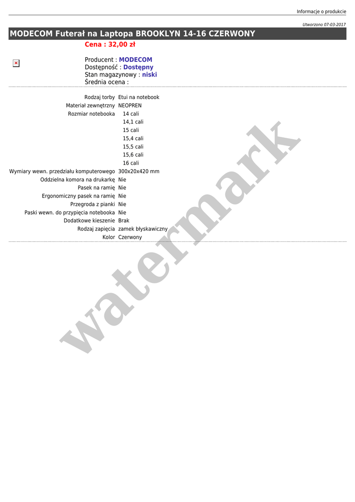 Informacje o produkcie Utworzono 07-03-2017 MODECOM Futerał na Laptopa BROOKLYN 14-16 CZERWONY Cena : 32,00 zł Producent : MODECOM Dostępność : Dostępny Stan magazynowy : niski Średnia ocena : Rodzaj torby Etui na notebook Materiał zewnętrzny NEOPREN Rozmiar notebooka 14 cali 14,1 cali 15 cali er m ar k 15,4 cali 15,5 cali 15,6 cali 16 cali Wymiary wewn. przedziału komputerowego 300x20x420 mm Oddzielna komora na drukarkę Nie Pasek na ramię Nie Ergonomiczny pasek na ramię Nie Przegroda z pianki Nie Paski wewn. do przypięcia notebooka Nie Dodatkowe kieszenie Brak Rodzaj zapięcia zamek błyskawiczny w at Kolor Czerwony