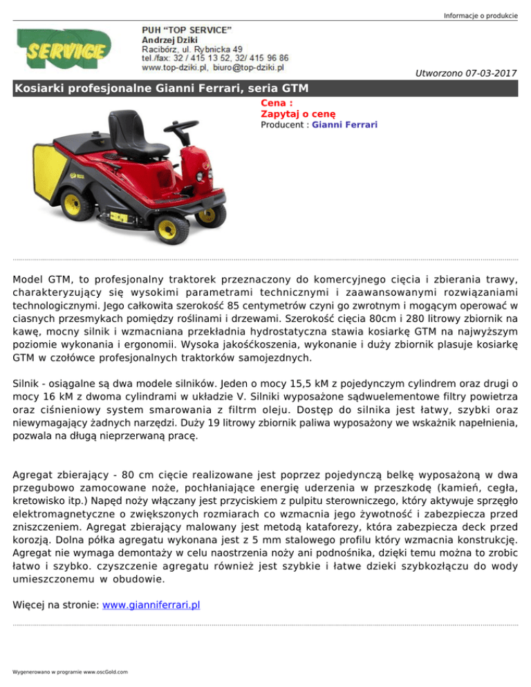 Informacje o produkcie Utworzono 07-03-2017 Kosiarki profesjonalne Gianni Ferrari, seria GTM Cena : Zapytaj o cenę Producent : Gianni Ferrari Model GTM, to profesjonalny traktorek przeznaczony do komercyjnego cięcia i zbierania trawy, charakteryzujący się wysokimi parametrami technicznymi i zaawansowanymi rozwiązaniami technologicznymi. Jego całkowita szerokość 85 centymetrów czyni go zwrotnym i mogącym operować w ciasnych przesmykach pomiędzy roślinami i drzewami. Szerokość cięcia 80cm i 280 litrowy zbiornik na kawę, mocny silnik i wzmacniana przekładnia hydrostatyczna stawia kosiarkę GTM na najwyższym poziomie wykonania i ergonomii. Wysoka jakośćkoszenia, wykonanie i duży zbiornik plasuje kosiarkę GTM w czołówce profesjonalnych traktorków samojezdnych. Silnik - osiągalne są dwa modele silników. Jeden o mocy 15,5 kM z pojedynczym cylindrem oraz drugi o mocy 16 kM z dwoma cylindrami w układzie V. Silniki wyposażone sądwuelementowe filtry powietrza oraz ciśnieniowy system smarowania z filtrm oleju. Dostęp do silnika jest łatwy, szybki oraz niewymagający żadnych narzędzi. Duży 19 litrowy zbiornik paliwa wyposażony we wskażnik napełnienia, pozwala na długą nieprzerwaną pracę. Agregat zbierający - 80 cm cięcie realizowane jest poprzez pojedynczą belkę wyposażoną w dwa przegubowo zamocowane noże, pochłaniające energię uderzenia w przeszkodę (kamień, cegła, kretowisko itp.) Napęd noży włączany jest przyciskiem z pulpitu sterowniczego, który aktywuje sprzęgło elektromagnetyczne o zwiększonych rozmiarach co wzmacnia jego żywotność i zabezpiecza przed zniszczeniem. Agregat zbierający malowany jest metodą kataforezy, która zabezpiecza deck przed korozją. Dolna półka agregatu wykonana jest z 5 mm stalowego profilu który wzmacnia konstrukcję. Agregat nie wymaga demontaży w celu naostrzenia noży ani podnośnika, dzięki temu można to zrobic łatwo i szybko. czyszczenie agregatu również jest szybkie i łatwe dzieki szybkozłączu do wody umieszczonemu w obudowie. Więcej na stronie: www.gianniferrari.pl Wygenerowano w programie www.oscGold.com