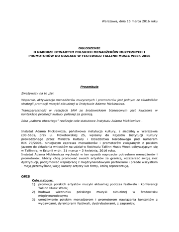 Warszawa, dnia 15 marca 2016 roku OGŁOSZENIE O NABORZE OTWARTYM POLSKICH MENADŻERÓW MUZYCZNYCH I PROMOTORÓW DO UDZIAŁU W FESTIWALU TALLINN MUSIC WEEK 2016 Preambuła Zważywszy na to ,że: Wsparcie, aktywizacja menadżerów muzycznych i promotorów jest jednym ze składników strategii promocji muzyki aktualnej w Instytucie Adama Mickiewicza. Transparentność w relacjach IAM ze środowiskiem biznesowym jest kluczowa w kontekście promocji kultury polskiej za granicą. Idea „naboru otwartego” realizuje cele statutowe Instytutu Adama Mickiewicza . Instytut Adama Mickiewicza, państwowa instytucja kultury, z siedzibą w Warszawie (00-560), przy ul. Mokotowskiej 25, wpisany do Rejestru Instytucji Kultury prowadzonego przez Ministra Kultury i Dziedzictwa Narodowego pod numerem RIK 70/2006, niniejszym zaprasza menadżerów i promotorów związanych z polskim jazzem do składania wniosków na udział w festiwalu Tallinn Music Week odbywającym się w Tallinnie, w Estonii w dn. 31 marca – 3 kwietnia, 2016 roku. Instytut Adama Mickiewicza wychodzi w ten sposób naprzeciw potrzebom menadżerów i promotorów, którzy chcą promować swoich artystów za granicą, rozszerzać swoją sieć dystrybucji, podejmować współpracę z międzynarodowymi partnerami i przede wszystkim - mają przemyślaną wizję kariery artysty lub firmy, którą reprezentują. OPIS Cele naboru: 1) promocja polskich artystów muzyki aktualnej podczas festiwalu i konferencji Tallinn Music Week; 2) budowa wizerunku polskiego muzyki aktualnej w środowisku międzynarodowym; 3) umożliwienie polskim menadżerom i promotorom nawiązania kontaktów z wydawcami, dyrektorami festiwali, dystrybutorami, z zagranicy; WSPARCIE 1. Instytut wesprze finansowo wnioskodawców w zakresie: 1) zwrotu kosztów zakupu akredytacji na festiwal i konferencję Tallinn Music Week; 2. Instytut nie zapewnia i nie będzie pokrywał innych kosztów Wnioskodawcy, w tym kosztów podróży na Festiwal, zakwaterowania podczas Festiwalu, a także nie będzie wypłacał wnioskodawcom diet ani honorariów. WNIOSKODAWCY 3. Ogłoszenie kieruje się do menadżerów muzycznych, promotorów, wydawców muzycznych posiadających w swoim katalogu polskich artystów oraz dyrektorów programowych/artystycznych polskich festiwali zapraszających na swój festiwal polskich artystów FORMULARZ ZGŁOSZENIOWY 4. Osoby zgłaszające, zobowiązane są do wypełnienia formularza zgłoszeniowego zawierającego pytania mające na celu określenie profilu zgłaszającego, a także określającego cele wyjazdu na Targi oraz proponowany plan ewentualnych spotkań z zagranicznymi partnerami. Formularz zgłoszeniowy znajduje się na stronie www.iam.pl PROCEDURA 5. Nabór wniosków trwać będzie w okresie od dnia 16 do 21 marca 2016 roku, do końca dnia (do 23.59). Formularz zgłoszeniowy należy przesłać e-mailem na adres [email protected]. 6. Do udziału w projekcie zaproszonych zostanie maksymalnie 5 wnioskodawców, których zgłoszenia zostaną najwyżej ocenione. 7. Do oceny merytorycznej są kierowane wyłącznie wnioski spełniające wymagania formalne, tj. przesłane w terminie i zawierające wypełnione wszystkie wymagane pozycje formularza. 8. Oceny merytorycznej wniosków dokonywać będzie Komisja, w składzie trzech osób (eksperta muzyki aktualnej IAM, realizatora i koordynatora projektów muzycznych IAM, oraz jednego eksperta zewnętrznego). 9. Wnioski będą oceniane, przez każdego z członków Komisji, według następujących kryteriów merytorycznych: 1) Doświadczenia w branży wynikającego z krótkiego opisu działalności wnioskodawcy – 0-10 pkt; 2) Rzeczowo sformułowanych celów wyjazdu na festiwal Tallinn Music Week – 0-10 pkt; 3) Planu potencjalnych spotkań z zagranicznymi partnerami podczas festiwal Tallinn Music Week – 0 – 10 pkt; 4) Przejrzyście i szczegółowo sformułowanych potencjalnych efektów wyjazdu na festiwal Tallinn Music Week - 0 – 10 pkt; 10. Każdy z członków Komisji będzie przyznawał punkty, o których mowa w ust. 9 powyżej, samodzielnie, które następnie ulegną zsumowaniu i podzieleniu przez liczbę członków Komisji. 11. Wyniki, uzyskane przez wnioskodawców zostaną ogłoszone na stronach internetowych www.iam.pl do dnia 23 marca 2016 roku. 12. Do uzyskania wsparcia Instytutu rekomendowane będą projekty, które uzyskały najwyższą punktację. 13. Instytut będzie się kontaktował z Wnioskodawcami, którzy złożyli formularze zgłoszeniowe, o których mowa w ust. 4 powyżej, celem zaproszenia do udziału w projekcie. 14. Zwrot kosztów zakupu akredytacji, o której mowa w pkt 1, odbędzie się przelewem na podane konto Wnioskodawcy w terminie 14 dni od momentu dostarczenia prawidłowo przygotowanego raportu z wyjazdu na festiwal Tallinn Music Week wraz z dokumentem księgowym potwierdzającym zakup ww. akredytacji. Wzór raportu znajduje się w załączniku nr 2. 15. W przypadku, w którym wybrany Wnioskodawca nie weźmie udziału w festiwalu Tallinn Music Week, z przyczyn od niego zależnych, zobowiązany będzie do zwrotu Instytutowi kosztów związanych z wykupionym noclegiem, w wysokości kosztów poniesionych przez Instytut, w terminie 7 dni od daty dostarczenia wezwania do zapłaty. 16. Decyzja Komisji dokonującej oceny jest decyzją ostateczną w sprawie, a tym samym Instytut nie prowadzi trybu odwoławczego. 17. Instytut będzie przetwarzać dane osobowe zgodnie z ustawą z dnia 29 sierpnia 1997 r. o ochronie danych osobowych (Dz. U. Nr 133, poz. 883 ze zm.). Instytut jest administratorem zbioru danych osobowych i przetwarza dane osobowe w celach związanych z przeprowadzeniem niniejszego naboru. Każda osoba, której dane dotyczą, ma prawo do wglądu w swoje dane osobowe przetwarzane przez administratora oraz do ich poprawiania. 18. Dodatkowe informacje można uzyskać pod numerem telefonu +22 44 76 151.