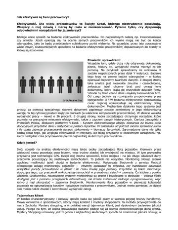 Jak efektywni są twoi pracownicy? Efektywność. Dla wielu pracodawców to Święty Graal, którego niestrudzenie poszukują. Wszyscy o niej mówią i marzą by rosła w nieskończoność. Pytanie tylko, czy dysponują odpowiednimi narzędziami by ją zmierzyć? Istnieje wiele sposób na badanie efektywności pracowników. Do najprostszych należą np. kwestionariusze czy ankiety. Jeżeli opierają się na ocenie samych pracowników ich wyniki mogą nie być do końca wiarygodne, jako że będą przedstawiały subiektywny punkt widzenia. Na szczęście, przez lata opracowano wiele innych, skuteczniejszych sposobów na badanie efektywności pracowników, dopasowanych do branży w której są stosowane. Powiedz: sprawdzam! Wszędzie tam, gdzie dużą rolę odgrywają dokumenty, pisma, faktury itp. wydajność można mierzyć za ich pomocą. Na przykład: sprawdzamy ile wniosków X zostało rozpatrzonych przez dział Y instytucji. Badanie tego typu na pewno będzie wiarygodne – w końcu operować będziemy twardymi danymi. Z drugiej strony taka analiza jest niezwykle żmudna i czasochłonna, zwłaszcza jeżeli chcemy brać pod uwagę inne dokumenty, które krążą po wszystkich działach firmy. Szkoda by takie cenne dane umykały kierownikom firm. Od czego jednak są rozwiązania proponowane przez specjalistów IT? W badaniu efektywności pracowników coraz częściej wykorzystuje się elektroniczny obieg dokumentów. Mechanizm działania tego systemu jest prosty: za pomocą specjalnego skanera dokument papierowy zostaje zamieniony w jego elektroniczną wersję. W tej cyfrowej postaci krąży po biurkach (a właściwie komputerach pracowników). W efekcie wzrasta wydajność pracy – nawet o 36 procent. Z drugiej strony, kadra zarządzająca otrzymuje narzędzie, które pozwala na precyzyjne mierzenie efektywności, także z użyciem danych historycznych. Dariusz Jarczyński z PrimeSoft Polska, dostawcy platformy V-Desk – System elektronicznego obiegu dostarcza na biurka osób decyzyjnych przydatne dane i statystyki w postaci raportów. W zależności od potrzeb można sprawdzić komu i ile czasu zajmuje procesowanie danego dokumentu – tłumaczy Jarczyński. Zgromadzone dane nie tylko dadzą obraz tego, jak wygląda efektywność w instytucji, ale będą przydatne w codziennym zarządzaniu np. kiedy nadejdzie czas przyznawania premii najbardziej skutecznym pracownikom... Gdzie jesteś? Swój sposób na analizę efektywności mają także osoby zarządzające flotą pojazdów. Kierowcy przez większość czasu pozostają poza biurem, więc trudno zbadać ich wydajność na miejscu. W tym przypadku przydatna jest technologia GPS. Dzięki niej można sprawdzić, które miejsca i na jak długo odwiedził dany pracownik poruszający się służbowym samochodem. To jednak nie wszystko. Monitoring oferuje szeroki wachlarz możliwości jeżeli chodzi o badanie efektywności. Małgorzata Słodownik z serwisu Flotis.pl oferującego usługę monitoringu pojazdów – Możemy sprawdzić na przykład, czy handlowiec odwiedził wszystkie punkty przewidziane w planie i ile czasu trwały jego przerwy. Przydatne są także informacje dotyczące tego, czy pracownik wykorzystuje samochód w prywatnych celach – zauważa. Co istotne z punktu widzenia użytkownika, nowoczesne systemy monitoringu są proste i bezpieczne w obsłudze – Usługa Flotis dostępna jest z poziomu przeglądarki internetowej, nie trzeba instalować żadnego oprogramowania, więc łatwo z niej skorzystać – zapewnia Słodownik. Monitorowanie floty pojazdów w pierwszej kolejności pozawala na optymalizację kosztów i łatwiejsze rozliczenia z pracownikami. Jednak warto pamiętać, że dzięki nim można także zbadać i kontrolować wydajność załogi. Tajemniczy klient W bardzo charakterystyczny i ciekawy sposób bada się jakość pracy w szeroko pojętej branży handlowej. Mowa konkretnie o sprzedawcach, którzy mają kontakt z mystery shopperami. Ta metoda przywędrowała do nas z Zachodu. Mystery shopping, a w polskiej wersji tajemniczy klient, jest dyskretnym badaniem jakości usług. Polega na tym, że osoba prowadząca badanie podaje się za klienta zainteresowanego daną ofertą. Mystery Shopping uznawany jest za jeden z najbardziej skutecznych sposób na zmierzenie jakości obsługi, a co za tym idzie efektywności pracownika. Tajemniczy klient sprawdza np. uprzejmość obsługi, sposób w jaki traktuje się klienta, a także to jak przedstawia mu się ofertę. Po przeprowadzeniu takiego badania wiadomo, czy sprzedawca stosuje się do ogólnie przyjętych w jego pracy standardów obsługi klienta. To istotne zwłaszcza jeżeli weźmiemy pod uwagę, że z badań opublikowanych przez stowarzyszenie mystery shoppingu (MSPA), wynika, że powodem straty klienta aż w 68 procentach przypadków jest niewłaściwa obsługa. ------------------------------Dystrybucja materiałów: Kinga Przybysz [email protected] kom./+48/ 519-181-900