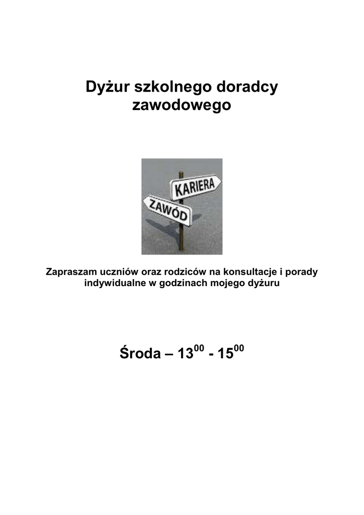 Dyżur szkolnego doradcy zawodowego Zapraszam uczniów oraz rodziców na konsultacje i porady indywidualne w godzinach mojego dyżuru Środa – 1300 - 1500