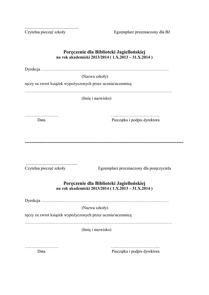 ................................................... Czytelna pieczęć szkoły Egzemplarz przeznaczony dla BJ Poręczenie dla Biblioteki Jagiellońskiej na rok akademicki 2013/2014 ( 1.X.2013 – 31.X.2014 ) Dyrekcja ………….…………………………………………………………………… (Nazwa szkoły) ręczy za zwrot książek wypożyczonych przez ucznia/uczennicę …………………………………………………………………………………………… (Imię i nazwisko) …………………… Data …...………………………... Pieczątka i podpis dyrektora ------------------------------------------------------------------------------------------------- ................................................. Czytelna pieczęć szkoły Egzemplarz przeznaczony dla poręczyciela Poręczenie dla Biblioteki Jagiellońskiej na rok akademicki 2013/2014 ( 1.X.2013 – 31.X.2014 ) Dyrekcja ………….…………………………………………………………………… (Nazwa szkoły) ręczy za zwrot książek wypożyczonych przez ucznia/uczennicę …………………………………………………………………………………………… (Imię i nazwisko) …………………… Data …...………………………... Pieczątka i podpis dyrektora