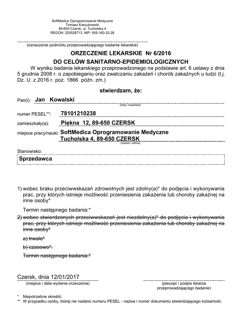 SoftMedica Oprogramowanie Medyczne Tomasz Kaszubowski 89-650 Czersk, ul. Tucholska 4 REGON: 220528713, NIP: 555-160-32-28 (oznaczenie podmiotu przeprowadzającego badanie lekarskie) ORZECZENIE LEKARSKIE Nr 6/2016 DO CELÓW SANITARNO-EPIDEMIOLOGICZNYCH W wyniku badania lekarskiego przeprowadzonego na podstawie art. 6 ustawy z dnia 5 grudnia 2008 r. o zapobieganiu oraz zwalczaniu zakażeń i chorób zakaźnych u ludzi (t.j. Dz. U. z 2016 r. poz. 1866 późn. zm.) stwierdzam, że: Pan(i): Jan Kowalski (imię i nazwisko) numer PESEL**: 78101210238 zamieszkały(a): Piękna 12, 89-650 CZERSK miejsce pracy/nauki: SoftMedica Oprogramowanie Medyczne Tucholska 4, 89-650 CZERSK (nazwa i adres) Stanowisko: Sprzedawca 1) wobec braku przeciwwskazań zdrowotnych jest zdolny(a)* do podjęcia i wykonywania prac, przy których istnieje możliwość przeniesienia zakażenia lub choroby zakaźnej na inne osoby* Termin następnego badania:* 2) wobec stwierdzonych przeciwwskazań jest niezdolny(a)* do podjęcia i wykonywania prac, przy których istnieje możliwość przeniesienia zakażenia lub choroby zakaźnej na inne osoby* a) trwale* b) czasowo*: Termin następnego badania:* Czersk, dnia 12/01/2017 (miejsce i data wydania orzeczenia) (pieczęć i podpis lekarza przeprowadzającego badanie) * Niepotrzebne skreślić. ** W przypadku osoby, której nie nadano numeru PESEL - nazwa i numer dokumentu stwierdzającego tożsamość.