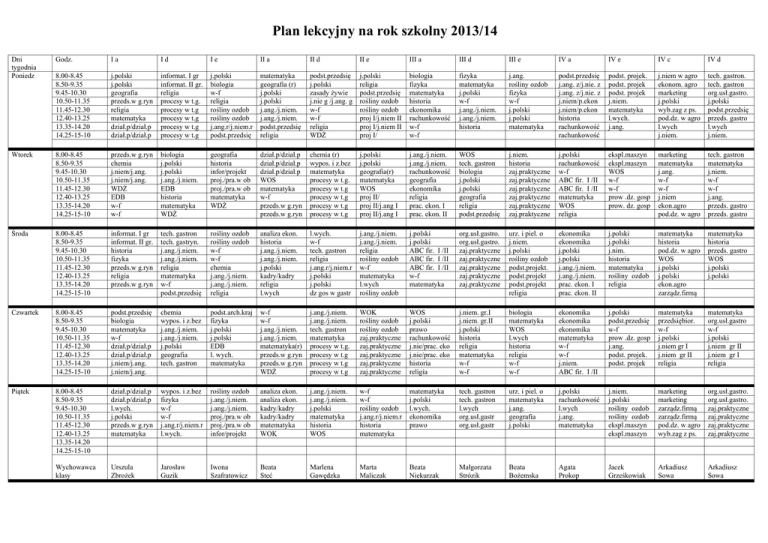 Plan lekcyjny na rok szkolny 2013/14 Dni tygodnia Poniedz Godz. Ia Id Ie II a II d II e III a III d III e IV a IV e IV c IV d 8.00-8.45 8.50-9.35 9.45-10.30 10.50-11.35 11.45-12.30 12.40-13.25 13.35-14.20 14.25-15-10 j.polski j.polski geografia przeds.w g.ryn religia matematyka dział.p/dział.p dział.p/dział.p informat. I gr informat. II gr. religia procesy w t.g. procesy w t.g procesy w t.g procesy w t.g procesy w t.g j.polski biologia w-f religia rośliny ozdob rośliny ozdob j.ang.r/j.niem.r podst.przedsię matematyka geografia (r) j.polski j.polski j.ang./j.niem. j.ang./j.niem. podst.przedsię religia podst.przedsię j.polski zasady żywie j.nie g /j.ang. g w-f w-f religia WDŻ j.polski religia podst.przedsię rośliny ozdob rośliny ozdob proj I/j.niem II proj I/j.niem II proj I/ biologia fizyka matematyka historia ekonomika rachunkowość w-f w-f fizyka matematyka j.polski w-f j.ang./j.niem. j.ang./j.niem. historia j.ang. rośliny ozdob fizyka w-f j.polski j.polski matematyka podst.przedsię j.ang. z/j.nie. z j.ang. z/j.nie. z j.niem/p.ekon j.niem/p.ekon historia rachunkowość rachunkowość podst. projek. podst. projek podst. projek j.niem. matematyka l.wych. j.ang. j.niem w agro ekonom. agro marketing j.polski wyb.zag z ps. pod.dz. w agro l.wych j.niem. tech. gastron. tech. gastron org.usł.gastro. j.polski podst.przedsię przeds. gastro l.wych j.niem. Wtorek 8.00-8.45 8.50-9.35 9.45-10.30 10.50-11.35 11.45-12.30 12.40-13.25 13.35-14.20 14.25-15-10 przeds.w g.ryn chemia j.niem/j.ang. j.niem/j.ang. WDŻ EDB w-f w-f biologia j.polski j.polski j.ang./j.niem. EDB historia matematyka WDŻ geografia historia infor/projekt proj./pra.w ob proj./pra.w ob matematyka WDŻ dział.p/dział.p dział.p/dział.p dział.p/dział.p WOS matematyka w-f przeds.w g.ryn przeds.w g.ryn chemia (r) wypos. i z.bez matematyka procesy w t.g. procesy w t.g procesy w t.g procesy w t.g procesy w t.g j.polski j.polski geografia(r) matematyka WOS proj II/ proj II/j.ang I proj II/j.ang I j.ang./j.niem. j.ang./j.niem. rachunkowość geografia ekonomika religia prac. ekon. I prac. ekon. II WOS tech. gastron biologia j.polski j.polski geografia religia podst.przedsię j.niem. historia zaj.praktyczne zaj.praktyczne zaj.praktyczne zaj.praktyczne zaj.praktyczne zaj.praktyczne j.polski rachunkowość w-f ABC fir. I /II ABC fir. I /II matematyka WOS religia ekspl.maszyn ekspl.maszyn WOS w-f w-f prow .dz. gosp prow. dz. gosp marketing matematyka j.ang. w-f w-f j.niem ekon.agro pod.dz. w agro tech. gastron matematyka j.niem. w-f w-f j.ang. przeds. gastro przeds. gastro Środa 8.00-8.45 8.50-9.35 9.45-10.30 10.50-11.35 11.45-12.30 12.40-13.25 13.35-14.20 14.25-15-10 informat. I gr informat. II gr. historia fizyka przeds.w g.ryn religia przeds.w g.ryn tech. gastron tech. gastryn. j.ang./j.niem. j.ang./j.niem. religia matematyka w-f podst.przedsię rośliny ozdob rośliny ozdob w-f w-f chemia j.ang./j.niem. j.ang./j.niem. religia analiza ekon. historia j.ang./j.niem. j.ang./j.niem. j.polski kadry/kadry religia l.wych l.wych. w-f tech. gastron religia j.ang.r/j.niem.r j.polski j.polski dz gos w gastr j.ang./j.niem. j.ang./j.niem. religia rośliny ozdob w-f matematyka l.wych rośliny ozdob j.polski j.polski ABC fir. I /II ABC fir. I /II ABC fir. I /II w-f matematyka org.usł.gastro. org.usł.gastro. zaj.praktyczne zaj.praktyczne zaj.praktyczne zaj.praktyczne zaj.praktyczne urz. i piel. o j.niem. j.polski rośliny ozdob podst.projekt. podst.projekt podst.projekt religia ekonomika ekonomika j.polski j.polski j.ang./j.niem. j.ang./j.niem. prac. ekon. I prac. ekon. II j.polski j.polski j.nim. historia matematyka rośliny ozdob religia matematyka historia pod.dz. w agro WOS j.polski j.polski ekon.agro zarządz.firmą matematyka historia przeds. gastro WOS j.polski j.polski Czwartek 8.00-8.45 8.50-9.35 9.45-10.30 10.50-11.35 11.45-12.30 12.40-13.25 13.35-14.20 14.25-15-10 podst.przedsię biologia matematyka w-f dział.p/dział.p dział.p/dział.p j.niem/j.ang. j.niem/j.ang. chemia wypos. i z.bez j.ang./j.niem. j.ang./j.niem. j.polski geografia tech. gastron podst.arch.kraj fizyka j.polski j.polski EDB l. wych. matematyka w-f w-f j.ang./j.niem. j.ang./j.niem. matematyka(r) przeds.w g.ryn przeds.w g.ryn WDŻ j.ang./j.niem. j.ang./j.niem. tech. gastron matematyka procesy w t.g. procesy w t.g procesy w t.g procesy w t.g WOK rośliny ozdob rośliny ozdob zaj.praktyczne zaj.praktyczne zaj.praktyczne zaj.praktyczne zaj.praktyczne WOS j.polski prawo rachunkowość j.nie/prac. eko j.nie/prac. eko historia religia j.niem. gr.I j.niem. gr.II j.polski historia religia matematyka w-f w-f biologia matematyka WOS l.wych historia religia w-f w-f ekonomika ekonomika ekonomika matematyka w-f w-f j.niem. ABC fir. I /II j.polski podst.przedsię w-f prow .dz. gosp j.ang. podst. projek. podst. projek matematyka przedsiębior. w-f j.polski j.niem gr I j.niem gr II religia matematyka org.usł.gastro w-f j.polski j.niem gr II j.niem gr I religia Piątek 8.00-8.45 8.50-9.35 9.45-10.30 10.50-11.35 11.45-12.30 12.40-13.25 13.35-14.20 14.25-15-10 dział.p/dział.p dział.p/dział.p l.wych. j.polski przeds.w g.ryn matematyka wypos. i z.bez fizyka w-f w-f j.ang.r/j.niem.r l.wych. rośliny ozdob j.ang./j.niem. j.ang./j.niem. proj./pra.w ob proj./pra.w ob infor/projekt analiza ekon. analiza ekon. kadry/kadry kadry/kadry matematyka WOK j.ang./j.niem. j.ang./j.niem. j.polski matematyka historia WOS w-f w-f rośliny ozdob j.ang.r/j.niem.r historia matematyka matematyka j.polski l.wych. ekonomika prawo tech. gastron tech. gastron l.wych org.usł.gastr org.usł.gastr urz. i piel. o matematyka j.ang. geografia j.polski j.polski rachunkowość l.wych j.ang. matematyka j.niem. j.polski rośliny ozdob rośliny ozdob ekspl.maszyn ekspl.maszyn marketing marketing zarządz.firmą zarządz.firmą pod.dz. w agro wyb.zag z ps. org.usł.gastro. org.usł.gastro. zaj.praktyczne zaj.praktyczne zaj.praktyczne zaj.praktyczne Wychowawca klasy Urszula Zbrożek Jarosław Guzik Iwona Sza