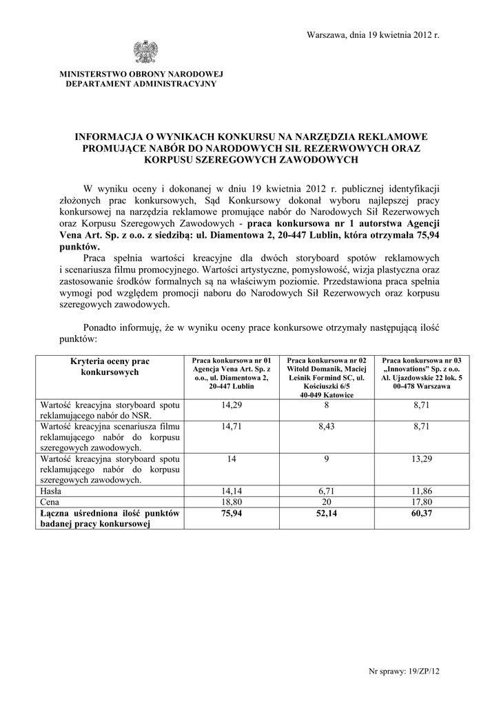 Warszawa, dnia 19 kwietnia 2012 r. MINISTERSTWO OBRONY NARODOWEJ DEPARTAMENT ADMINISTRACYJNY INFORMACJA O WYNIKACH KONKURSU NA NARZĘDZIA REKLAMOWE PROMUJĄCE NABÓR DO NARODOWYCH SIŁ REZERWOWYCH ORAZ KORPUSU SZEREGOWYCH ZAWODOWYCH W wyniku oceny i dokonanej w dniu 19 kwietnia 2012 r. publicznej identyfikacji złożonych prac konkursowych, Sąd Konkursowy dokonał wyboru najlepszej pracy konkursowej na narzędzia reklamowe promujące nabór do Narodowych Sił Rezerwowych oraz Korpusu Szeregowych Zawodowych - praca konkursowa nr 1 autorstwa Agencji Vena Art. Sp. z o.o. z siedzibą: ul. Diamentowa 2, 20-447 Lublin, która otrzymała 75,94 punktów. Praca spełnia wartości kreacyjne dla dwóch storyboard spotów reklamowych i scenariusza filmu promocyjnego. Wartości artystyczne, pomysłowość, wizja plastyczna oraz zastosowanie środków formalnych są na właściwym poziomie. Przedstawiona praca spełnia wymogi pod względem promocji naboru do Narodowych Sił Rezerwowych oraz korpusu szeregowych zawodowych. Ponadto informuję, że w wyniku oceny prace konkursowe otrzymały następującą ilość punktów: Kryteria oceny prac konkursowych Praca konkursowa nr 01 Agencja Vena Art. Sp. z o.o., ul. Diamentowa 2, 20-447 Lublin Praca konkursowa nr 02 Witold Domanik, Maciej Leśnik Formind SC, ul. Kościuszki 6/5 40-049 Katowice Praca konkursowa nr 03 „Innovations” Sp. z o.o. Al. Ujazdowskie 22 lok. 5 00-478 Warszawa Wartość kreacyjna storyboard spotu reklamującego nabór do NSR. Wartość kreacyjna scenariusza filmu reklamującego nabór do korpusu szeregowych zawodowych. Wartość kreacyjna storyboard spotu reklamującego nabór do korpusu szeregowych zawodowych. Hasła Cena Łączna uśredniona ilość punktów badanej pracy konkursowej 14,29 8 8,71 14,71 8,43 8,71 14 9 13,29 14,14 18,80 75,94 6,71 20 52,14 11,86 17,80 60,37 Nr sprawy: 19/ZP/12