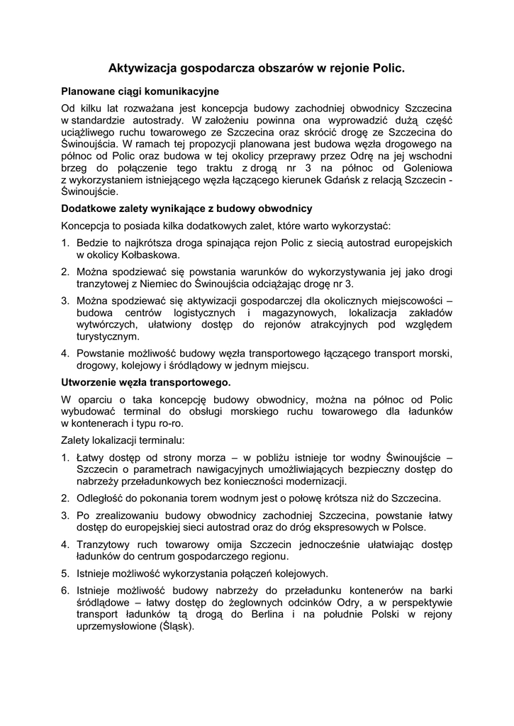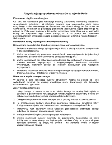 Aktywizacja gospodarcza obszarów w rejonie Polic. Planowane ciągi komunikacyjne Od kilku lat rozważana jest koncepcja budowy zachodniej obwodnicy Szczecina w standardzie autostrady. W założeniu powinna ona wyprowadzić dużą część uciążliwego ruchu towarowego ze Szczecina oraz skrócić drogę ze Szczecina do Świnoujścia. W ramach tej propozycji planowana jest budowa węzła drogowego na północ od Polic oraz budowa w tej okolicy przeprawy przez Odrę na jej wschodni brzeg do połączenie tego traktu z drogą nr 3 na północ od Goleniowa z wykorzystaniem istniejącego węzła łączącego kierunek Gdańsk z relacją Szczecin Świnoujście. Dodatkowe zalety wynikające z budowy obwodnicy Koncepcja to posiada kilka dodatkowych zalet, które warto wykorzystać: 1. Bedzie to najkrótsza droga spinająca rejon Polic z siecią autostrad europejskich w okolicy Kołbaskowa. 2. Można spodziewać się powstania warunków do wykorzystywania jej jako drogi tranzytowej z Niemiec do Świnoujścia odciążając drogę nr 3. 3. Można spodziewać się aktywizacji gospodarczej dla okolicznych miejscowości – budowa centrów logistycznych i magazynowych, lokalizacja zakładów wytwórczych, ułatwiony dostęp do rejonów atrakcyjnych pod względem turystycznym. 4. Powstanie możliwość budowy węzła transportowego łączącego transport morski, drogowy, kolejowy i śródlądowy w jednym miejscu. Utworzenie węzła transportowego. W oparciu o taka koncepcję budowy obwodnicy, można na północ od Polic wybudować terminal do obsługi morskiego ruchu towarowego dla ładunków w kontenerach i typu ro-ro. Zalety lokalizacji terminalu: 1. Łatwy dostęp od strony morza – w pobliżu istnieje tor wodny Świnoujście – Szczecin o parametrach nawigacyjnych umożliwiających bezpieczny dostęp do nabrzeży przeładunkowych bez konieczności modernizacji. 2. Odległość do pokonania torem wodnym jest o połowę krótsza niż do Szczecina. 3. Po zrealizowaniu budowy obwodnicy zachodniej Szczecina, powstanie łatwy dostęp do europejskiej sieci autostrad oraz do dróg ekspresowych w Polsce. 4. Tranzytowy ruch towarowy omija Szczecin jednocześnie ułatwiając dostęp ładunków do centrum gospodarczego regionu. 5. Istnieje możliwość wykorzystania połączeń kolejowych. 6. Istnieje możliwość budowy nabrzeży do przeładunku kontenerów na barki śródlądowe – łatwy dostęp do żeglownych odcinków Odry, a w perspektywie transport ładunków tą drogą do Berlina i na południe Polski w rejony uprzemysłowione (Śląsk). 7. Stworzenie szansy przeniesienia na śródlądowe drogi wodne dużej części ładunków kontenerowych i rozwój ośrodków przeładowujących kontenery w rejonie Wrocławia, Opola i Gliwic. 8. Przejście na bardziej ekologiczne i tańsze metody transportu ładunków. 9. Odciążenie drogi nr 3 i ułatwienie ochrony Wolińskiego Parku Narodowego. 10. Wzrost obrotu towarów w kontenerach i ro-ro w rejonie portów Szczecin Świnoujście Uzasadnienie koncepcji. Na Bałtyku istnieją połączenia promowe wzdłuż wybrzeży n.p Helsinki – porty Niemiec. Uzasadnieniem dla takich decyzji jest chęć ominięcia niezbyt wygodnych ciągów komunikacyjny na Łotwie, Litwie i w Polsce. Ponadto odciąża to ruch na drogach i przenosi go na bardziej ekologiczne i tańsze metody transportu. Podobną koncepcję zaprezentowano w ubiegłym roku w Ministerstwie Infrastruktury w czasie rozmów z Ministrem Transportu Litwy proponując połączenie podobnym mostem Świnoujścia z Kłajpedą. W propozycji tej jest jednak słabe ogniwo w postaci połączeń drogowych ze Świnoujścia w kierunku granicy z Niemcami i na południe Polski, w kierunku Czech i Austrii. Do najbliższej autostrady jest tam ponad 100 km i nie ma widoków na szybkie zlikwidowanie tej niedogodności. Ponadto Gdańsk stwarza możliwości do przeładunku kontenerów z dużych statków. W takim przypadku potrzebna jest sieć połączeń kontenerowców dowozowych (fiderów), które przemieszczą mniejsze partie ładunków w kierunku centrów gospodarczych i do połączeń z europejską siecią dróg lądowych i śródlądowych. Małe kontenerowce mogą również realizować przewozy z kierunków północnych Bałtyku, a nawet portów Morza Północnego (n.p Hamburg). Policki węzeł transportowy może być konkurencyjny nawet w stosunku do portu Mukran – z Polic będzie około 100 km bliżej do autostrad w okolicy Berlina, a z kierunków wschodnich obszarów Bałtyku, bliżej nawet drogą morską. Z uwagi na trudności komunikacyjne w samym Szczecinie, terminal kontenerowy w porcie nie ma zbyt dogodnych warunków do rozwoju. Węzeł w Policach łatwo ten problem rozwiązuje. Lokalizacja węzła jest szansą dla rozwoju żeglugi śródlądowej na Odrze w powiązaniu z międzynarodową siecią dróg wodnych, jak i dla rozwoju żeglugi kabotażowej wzdłuż wybrzeża polskiego. Dużym atutem jest bliskość śródlądowych wód żeglownych i ich mała kolizyjność z ruchem morskim. Możliwa jest lepsza ochrona obszarów wrażliwych ekologicznie oraz powstają szanse na aktywizację małych portów Zalewu Szczecińskiego. Powstanie odpowiedniego potencjału gospodarczego ułatwi również rozwój żeglugi rekreacyjnej i turystyki. Należy spodziewać się specjalizacji ośrodków przeładunkowych – Świnoujście, głównie ruch pasażerski, Police obrót towarowy. Andrzej Lipok