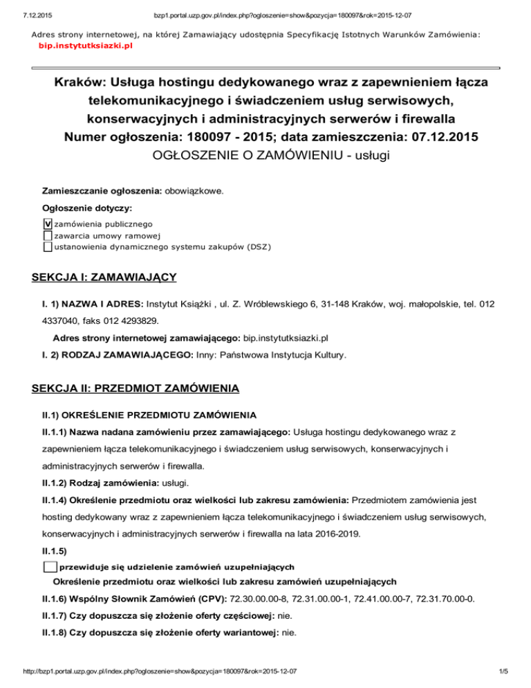 7.12.2015 bzp1.portal.uzp.gov.pl/index.php?ogloszenie=show&pozycja=180097&rok=20151207 Adres strony internetowej, na której Zamawiający udostępnia Specyfikację Istotnych Warunków Zamówienia: bip.instytutksiazki.pl Kraków: Usługa hostingu dedykowanego wraz z zapewnieniem łącza telekomunikacyjnego i świadczeniem usług serwisowych, konserwacyjnych i administracyjnych serwerów i firewalla Numer ogłoszenia: 180097 2015; data zamieszczenia: 07.12.2015 OGŁOSZENIE O ZAMÓWIENIU usługi Zamieszczanie ogłoszenia: obowiązkowe. Ogłoszenie dotyczy: V zamówienia publicznego zawarcia umowy ramowej ustanowienia dynamicznego systemu zakupów (DSZ) SEKCJA I: ZAMAWIAJĄCY I. 1) NAZWA I ADRES: Instytut Książki , ul. Z. Wróblewskiego 6, 31148 Kraków, woj. małopolskie, tel. 012 4337040, faks 012 4293829. Adres strony internetowej zamawiającego: bip.instytutksiazki.pl I. 2) RODZAJ ZAMAWIAJĄCEGO: Inny: Państwowa Instytucja Kultury. SEKCJA II: PRZEDMIOT ZAMÓWIENIA II.1) OKREŚLENIE PRZEDMIOTU ZAMÓWIENIA II.1.1) Nazwa nadana zamówieniu przez zamawiającego: Usługa hostingu dedykowanego wraz z zapewnieniem łącza telekomunikacyjnego i świadczeniem usług serwisowych, konserwacyjnych i administracyjnych serwerów i firewalla. II.1.2) Rodzaj zamówienia: usługi. II.1.4) Określenie przedmiotu oraz wielkości lub zakresu zamówienia: Przedmiotem zamówienia jest hosting dedykowany wraz z zapewnieniem łącza telekomunikacyjnego i świadczeniem usług serwisowych, konserwacyjnych i administracyjnych serwerów i firewalla na lata 20162019. II.1.5) przewiduje się udzielenie zamówień uzupełniających Określenie przedmiotu oraz wielkości lub zakresu zamówień uzupełniających II.1.6) Wspólny Słownik Zamówień (CPV): 72.30.00.008, 72.31.00.001, 72.41.00.007, 72.31.70.000. II.1.7) Czy dopuszcza się złożenie oferty częściowej: nie. II.1.8) Czy dopuszcza się złożenie oferty wariantowej: nie. http://bzp1.portal.uzp.gov.pl/index.php?ogloszenie=show&pozycja=180097&rok=20151207 1/5 7.12.2015 bzp1.portal.uzp.gov.pl/index.php?ogloszenie=show&pozycja=180097&rok=20151207 II.2) CZAS TRWANIA ZAMÓWIENIA LUB TERMIN WYKONANIA: Zakończenie: 31.12.2019. SEKCJA III: INFORMACJE O CHARAKTERZE PRAWNYM, EKONOMICZNYM, FINANSOWYM I TECHNICZNYM III.2) ZALICZKI III.3) WARUNKI UDZIAŁU W POSTĘPOWANIU ORAZ OPIS SPOSOBU DOKONYWANIA OCENY SPEŁNIANIA TYCH WARUNKÓW III. 3.1) Uprawnienia do wykonywania określonej działalności lub czynności, jeżeli przepisy prawa nakładają obowiązek ich posiadania Opis sposobu dokonywania oceny spełniania tego warunku Wykonawca winien wykazać się posiadaniem aktualnie obowiązującego wpisu do rejestru przedsiębiorców telekomunikacyjnych w zakresie działalności związanej z przedmiotem niniejszego zamówienia, dokonanego przez Prezesa Urzędu Komunikacji Elektronicznej. III.3.2) Wiedza i doświadczenie Opis sposobu dokonywania oceny spełniania tego warunku Wykonawca musi wykazać, że w okresie ostatnich 3 lat przed upływem terminu składania ofert, a jeżeli okres prowadzenia działalności jest krótszy w tym okresie, zrealizował lub realizuje co najmniej jedną umowę na podstawie której świadczy usługi hostingu wraz z zapewnieniem łącza telekomunikacyjnego i świadczeniem usług serwisowych, konserwacyjnych i administracyjnych o wartości łącznej nie mniejszej niż 500.000,00 złotych brutto. III.3.3) Potencjał techniczny Opis sposobu dokonywania oceny spełniania tego warunku Zamawiający wymaga, aby Wykonawca wykazał, że dysponuje co najmniej jedną serwerownią spełniającą wymagania określone w punkcie 3.1. Opisu przedmiotu zamówienia (załącznik nr 4 do SIWZ), w szczególności: (a) system zarządzania serwerownią, spełniający wymagania normy PN/ISO 270012007 lub równoważnej; (b) posiadanie przez serwerownię co najmniej dwóch, niezależnych źródeł zasilania oraz systemów UPS. Zasilanie awaryjne musi gwarantować automatyczne podtrzymanie zasilania dla serwerów Zamawiającego oraz wszelkich systemów i infrastruktury serwerowni, zapewniających podtrzymanie prawidłowego środowiska pracy serwerów Zamawiającego; (c) budynek serwerowni musi posiadać co najmniej dwa autonomiczne wejścia dostępowe; (d) budynek serwerowni musi dawać możliwość umiejscowienia anteny radiowej na dachu; (e) serwerownia musi posiadać własny generator prądu, gwarantujący podtrzymanie zasilania w serwerowni przy pełnej mocy przez minimum 24 godziny bez potrzeby tankowania, a w razie dalszej potrzeby gwarantujący możliwość tankowania bez przerywania pracy serwerowni; (f) w przypadku awarii zasilania powyższe systemy muszą przełączać się w sposób automatyczny; (g) serwerownia musi posiadać redundantny system klimatyzacji; (h) serwerownia musi posiadać redundantne połączenie internetowe podpięte do co najmniej 3 różnych operatorów internetowych. http://bzp1.portal.uzp.gov.pl/index.php?ogloszenie=show&pozycja=180097&rok=20151207 2/5 7.12.2015 bzp1.portal.uzp.gov.pl/index.php?ogloszenie=show&pozycja=180097&rok=20151207 Połączenia te muszą być realizowane za pomocą światłowodów; (i) cały obszar serwerowni, w tym jego otoczenie zewnętrzne i poszczególne, wewnętrzne strefy bezpieczeństwa, muszą podlegać stałemu nadzorowi kamer telewizji przemysłowej CCTV z rejestracją ciągłą, a dodatkowo podlegały fizycznemu patrolowaniu i kontroli w trybie 24h/dobę przez wszystkie dni w roku; (j) budynek serwerowni musi posiadać system przeciwpożarowy system gaszenia gazem; (k) w serwerowni musi być wdrożony system kontroli dostępu do serwerowni; (l) infrastruktura sieciowa centrum hostingowego (serwerowni) poprzez stosowane systemy monitorująco obronne (firewall), musi zapewniać odpowiedni poziom ochrony przed atakami z sieci. III.3.4) Osoby zdolne do wykonania zamówienia Opis sposobu dokonywania oceny spełniania tego warunku O udzielenie zamówienia może ubiegać się Wykonawca, który dysponuje lub