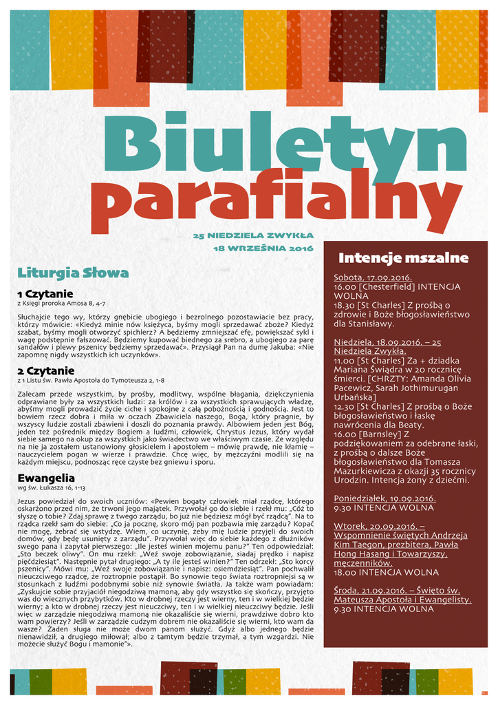 25 NIEDZIELA ZWYKŁA 18 WRZEŚNIA 2016 Liturgia Słowa 1 Czytanie 8, 4-7 z Księgi proroka Amosa którzy gnębicie ubogiego i bezrolnego pozostawiacie bez pracy, Słuchajcie tego wy, którzy mówicie: «Kiedyż minie nów księżyca, byśmy mogli sprzedawać zboże? Kiedyż szabat, byśmy mogli otworzyć spichlerz? A będziemy zmniejszać efę, powiększać sykl i wagę podstępnie fałszować. Będziemy kupować biednego za srebro, a ubogiego za parę sandałów i plewy pszenicy będziemy sprzedawać». Przysiągł Pan na dumę Jakuba: «Nie zapomnę nigdy wszystkich ich uczynków». 2 Czytanie z 1 Listu św. Pawła Apostoła do Tymoteusza 2, 1-8 Zalecam przede wszystkim, by prośby, modlitwy, wspólne błagania, dziękczynienia odprawiane były za wszystkich ludzi: za królów i za wszystkich sprawujących władzę, abyśmy mogli prowadzić życie ciche i spokojne z całą pobożnością i godnością. Jest to bowiem rzecz dobra i miła w oczach Zbawiciela naszego, Boga, który pragnie, by wszyscy ludzie zostali zbawieni i doszli do poznania prawdy. Albowiem jeden jest Bóg, jeden też pośrednik między Bogiem a ludźmi, człowiek, Chrystus Jezus, który wydał siebie samego na okup za wszystkich jako świadectwo we właściwym czasie. Ze względu ustanowiony głosicielem i apostołem – mówię prawdę, nie kłamię – na nie ja zostałem nauczycielem pogan w wierze i prawdzie. Chcę więc, by mężczyźni modlili się na każdym miejscu, podnosząc ręce czyste bez gniewu i sporu. Ewangelia wg św. Łukasza 16, 1-13 Jezus powiedział do swoich uczniów: «Pewien bogaty człowiek miał rządcę, którego oskarżono przed nim, że trwoni jego majątek. Przywołał go do siebie i rzekł mu: „Cóż to sprawę z twego zarządu, bo już nie będziesz mógł być rządcą”. Na to słyszę o tobie? Zdaj rządca rzekł sam do siebie: „Co ja pocznę, skoro mój pan pozbawia mię zarządu? Kopać nie mogę, żebrać się wstydzę. Wiem, co uczynię, żeby mię ludzie przyjęli do swoich domów, gdy będę usunięty z zarządu”. Przywołał więc do siebie każdego z dłużników swego pana i zapytał pierwszego: „Ile jesteś winien mojemu panu?” Ten odpowiedział: „Sto beczek oliwy”. On mu rzekł: „Weź swoje zobowiązanie, siadaj prędko i napisz pięćdziesiąt”. Następnie pytał drugiego: „A ty ile jesteś winien?” Ten odrzekł: „Sto korcy pszenicy”. Mówi mu: „Weź swoje zobowiązanie i napisz: osiemdziesiąt”. Pan pochwalił że roztropnie postąpił. Bo synowie tego świata roztropniejsi są w nieuczciwego rządcę, stosunkach z ludźmi podobnymi sobie niż synowie światła. Ja także wam powiadam: „Zyskujcie sobie przyjaciół niegodziwą mamoną, aby gdy wszystko się skończy, przyjęto was do wiecznych przybytków. Kto w drobnej rzeczy jest wierny, ten i w wielkiej będzie wierny; a kto w drobnej rzeczy jest nieuczciwy, ten i w wielkiej nieuczciwy będzie. Jeśli więc w zarządzie niegodziwą mamoną nie okazaliście się wierni, prawdziwe dobro kto w zarządzie cudzym dobrem nie okazaliście się wierni, kto wam da wam powierzy? Jeśli wasze? Żaden sługa nie może dwom panom służyć. Gdyż albo jednego będzie nienawidził, a drugiego miłował; albo z tamtym będzie trzymał, a tym wzgardzi. Nie Biuletyn parafialny możecie służyć Bogu i mamonie”». Intencje mszalne Sobota, 17.09.2016. 16.00 [Chesterfield] INTENCJA WOLNA 18.30 [St Charles] Z prośbą o zdrowie i Boże błogosławieństwo dla Stanisławy. Niedziela, 18.09.2016. – 25 Niedziela Zwykła. 11.00 [St Charles] Za + dziadka Mariana Świądra w 20 rocznicę śmierci. [CHRZTY: Amanda Olivia Pacewicz, Sarah Jothimurugan Urbańska] 12.30 [St Charles] Z prośbą o Boże błogosławieństwo i łaskę nawrócenia dla Beaty. 16.00 [Barnsley] Z podziękowaniem za odebrane łaski, z prośbą o dalsze Boże błogosławieństwo dla Tomasza Mazurkiewicza z okazji 35 rocznicy Urodzin. Intencja żony z dziećmi. Poniedziałek, 19.09.2016. 9.30 INTENCJA WOLNA Wtorek, 20.09.2016. – Wspomnienie świętych Andrzeja Kim Taegon, prezbitera, Pawła Hong Hasang i Towarzyszy, męczenników. 18.00 INTENCJA WOLNA Środa, 21.09.2016. – Święto św. Mateusza Apostoła i Ewangelisty. 9.30 INTENCJA WOLNA Ogłoszenia parafialne Kolekta w ostatnią niedzielę, (Chesterfield £31.05; Msza sobotnia £33.00; 1 Msza - £140.20; 2 Msza £99.70; Barnsley - £99.40) wyniosła razem - £403.35, w tym Gift Aid - £88.17. Druga zbiórka na Fundację im. kard. Glempa (Chesterfield - £14.00; Msza sobotnia - £30.00; 1 Msza - £75.25; 2 Msza - £44.65; Barnsley - £75.15) wyniosła razem - £239.04. Serdeczne “Bóg zapłać!” za każdą złożoną ofiarę. W przyszłą niedzielę kolekta przeznaczona będzie na potrzeby naszej Parafii. Nauki Przedmałżeńskie połączone z Poradnią Życia Rodzinnego odbędą się w naszej Parafii [w Ośrodku 518-520 Ecclesall Road, Sheffield S11 8PY] w sobotę, 24 września. Początek o godz. 11.00, zakończenie o godz. 17.00. Nauki są jednodniowe. Nie trzeba wcześniej zgłaszać swojego udziału ani dostarczać jakichkolwiek dokumentów. Uczestniczyć w nich mogą wszyscy, także ci, którzy nie są członkami wspólnoty parafialnej w Sheffield. Uczestnicy Kursu na zakończenie otrzymują potwierdzenie udziału w Naukach Przedmałżeńskich. Koszt - £25 od osoby. Kolejny termin nauk w tym roku: 17 grudnia. Dostępny jest nowy numer „Gościa Niedzielnego” w cenie £1.5. W tym numerze polecam artykuł p.t.: „Nasza bitwa o Anglię” – Polacy mieszkający w Harlow, gdzie niedawno zamordowano naszego Rodaka, wyczuwają wyraźną zmianę nastrojów w Wielkiej Brytanii po czerwcowym referendum. Chcą tu jednak pozostać. Czwartek, 22.09.2016. 18.00 INTENCJA WOLNA Piątek, 23.09.2016. – Wspomnienie św. o. Pio z Pietrelciny. 9.30 INTENCJA WOLNA Sobota, 24.09.2016. 16.00 [Chesterfield] Za + Jana Paprockiego w miesiąc po śmierci. 18.30 [St Charles] INTENCJA WOLNA Nie