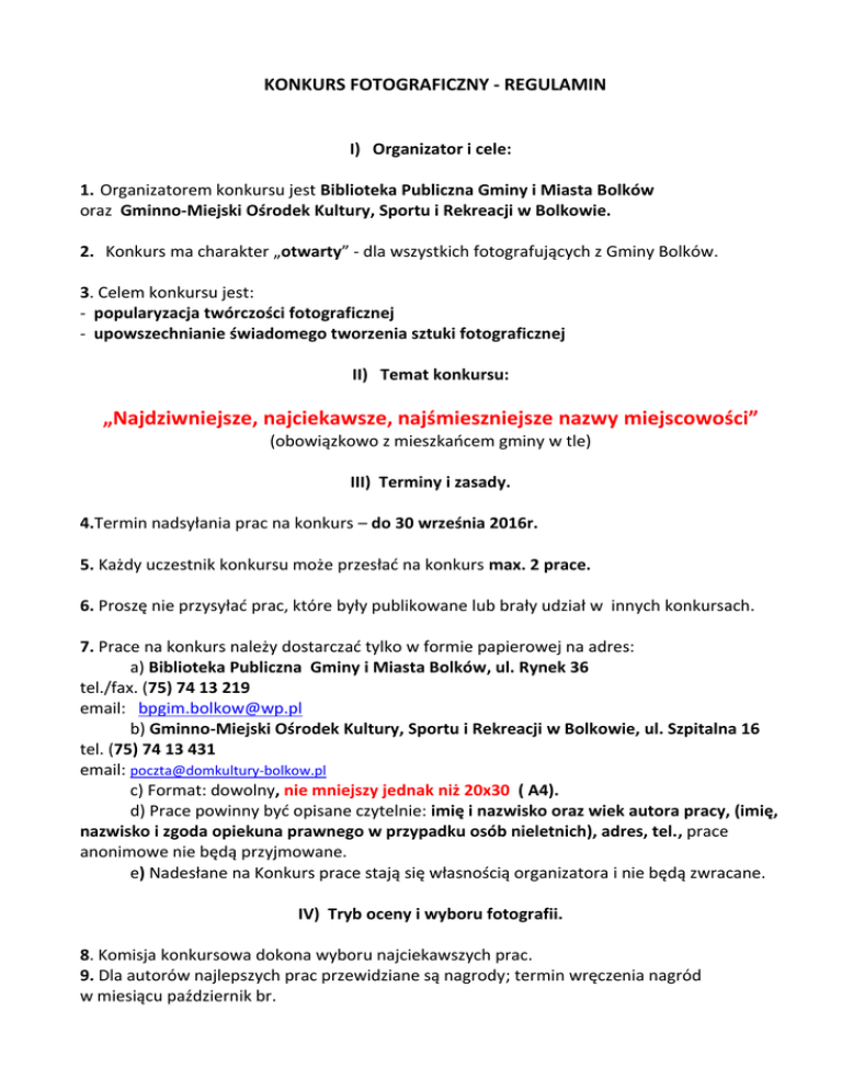 KONKURS FOTOGRAFICZNY - REGULAMIN I) Organizator i cele: 1. Organizatorem konkursu jest Biblioteka Publiczna Gminy i Miasta Bolków oraz Gminno-Miejski Ośrodek Kultury, Sportu i Rekreacji w Bolkowie. 2. Konkurs ma charakter „otwarty” - dla wszystkich fotografujących z Gminy Bolków. 3. Celem konkursu jest: - popularyzacja twórczości fotograficznej - upowszechnianie świadomego tworzenia sztuki fotograficznej II) Temat konkursu: „Najdziwniejsze, najciekawsze, najśmieszniejsze nazwy miejscowości” (obowiązkowo z mieszkańcem gminy w tle) III) Terminy i zasady. 4.Termin nadsyłania prac na konkurs – do 30 września 2016r. 5. Każdy uczestnik konkursu może przesłać na konkurs max. 2 prace. 6. Proszę nie przysyłać prac, które były publikowane lub brały udział w innych konkursach. 7. Prace na konkurs należy dostarczać tylko w formie papierowej na adres: a) Biblioteka Publiczna Gminy i Miasta Bolków, ul. Rynek 36 tel./fax. (75) 74 13 219 email: [email protected] b) Gminno-Miejski Ośrodek Kultury, Sportu i Rekreacji w Bolkowie, ul. Szpitalna 16 tel. (75) 74 13 431 email: [email protected] c) Format: dowolny, nie mniejszy jednak niż 20x30 ( A4). d) Prace powinny być opisane czytelnie: imię i nazwisko oraz wiek autora pracy, (imię, nazwisko i zgoda opiekuna prawnego w przypadku osób nieletnich), adres, tel., prace anonimowe nie będą przyjmowane. e) Nadesłane na Konkurs prace stają się własnością organizatora i nie będą zwracane. IV) Tryb oceny i wyboru fotografii. 8. Komisja konkursowa dokona wyboru najciekawszych prac. 9. Dla autorów najlepszych prac przewidziane są nagrody; termin wręczenia nagród w miesiącu październik br. V) Postanowienia końcowe, oświadczenia. 10. Udział w konkursie jest równoznaczny z przyjęciem warunków Regulaminu oraz zgodą na przetwarzanie danych osobowych uczestnika konkursu, (zgodnie z ustawą o ochronie danych osobowych z dn. 29.08.1997 r. Dz. U. Nr 133 poz. 833 z póź. zm.). 11. W sprawach spornych ostateczna interpretacja Regulaminu Konkursu należy do Organizatora. 12. Wyniki konkursu zostaną ogłoszone na stronie internetowej: http://bibliotekabolkow.blogspot.com http://www.domkultury-bolkow.pl 13. Autor fotografii zgłoszonej do konkursu oświadcza, że jest jedynym właścicielem praw autorskich i prace te nie naruszają wszelkich dóbr osobistych i materialnych osób trzecich. 14. Autor wyraża zgodę na bezpłatną publikację zdjęcia na: a) stronach internetowych, b) w prasie lokalnej. 15. Przystąpienie do konkursu jest jednoznaczne z akceptacją regulaminu w całości.