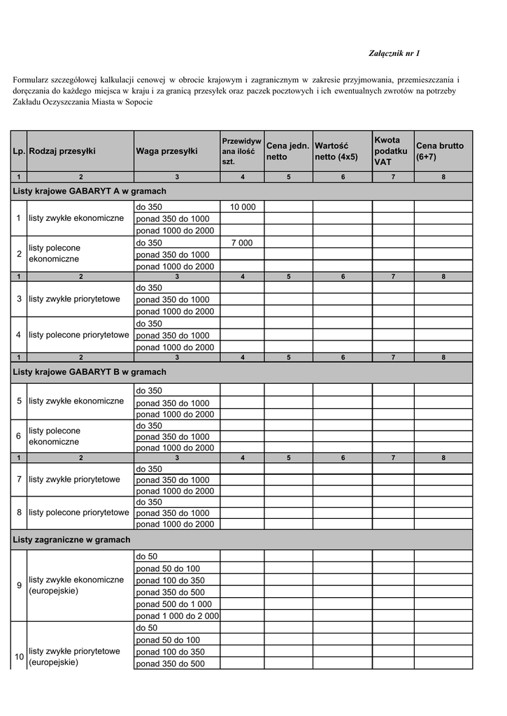 Załącznik nr 1 Formularz szczegółowej kalkulacji cenowej w obrocie krajowym i zagranicznym w zakresie przyjmowania, przemieszczania i doręczania do każdego miejsca w kraju i za granicą przesyłek oraz paczek pocztowych i ich ewentualnych zwrotów na potrzeby Zakładu Oczyszczania Miasta w Sopocie Lp. Rodzaj przesyłki 1 Waga przesyłki 2 Przewidyw Cena jedn. Wartość ana ilość netto netto (4x5) szt. 3 4 do 350 ponad 350 do 1000 ponad 1000 do 2000 do 350 ponad 350 do 1000 ponad 1000 do 2000 10 000 3 Kwota podatku VAT Cena brutto (6+7) 5 6 7 8 4 5 6 7 8 4 5 6 7 8 4 5 6 7 8 Listy krajowe GABARYT A w gramach 1 listy zwykłe ekonomiczne 2 1 listy polecone ekonomiczne 2 7 000 do 350 3 listy zwykłe priorytetowe ponad 350 do 1000 ponad 1000 do 2000 do 350 4 listy polecone priorytetowe ponad 350 do 1000 ponad 1000 do 2000 1 2 3 Listy krajowe GABARYT B w gramach 5 listy zwykłe ekonomiczne 6 1 listy polecone ekonomiczne 2 do 350 ponad 350 do 1000 ponad 1000 do 2000 do 350 ponad 350 do 1000 ponad 1000 do 2000 3 do 350 7 listy zwykłe priorytetowe ponad 350 do 1000 ponad 1000 do 2000 do 350 8 listy polecone priorytetowe ponad 350 do 1000 ponad 1000 do 2000 Listy zagraniczne w gramach 9 listy zwykłe ekonomiczne (europejskie) 10 listy zwykłe priorytetowe (europejskie) do 50 ponad 50 do 100 ponad 100 do 350 ponad 350 do 500 ponad 500 do 1 000 ponad 1 000 do 2 000 do 50 ponad 50 do 100 ponad 100 do 350 ponad 350 do 500 10 listy zwykłe priorytetowe (europejskie) ponad 500 do 1 000 ponad 1 000 do 2 000 do 50 ponad 50 do 100 listy polecone priorytetowe ponad 100 do 350 11 (europejskie) ponad 350 do 500 ponad 500 do 1 000 ponad 1 000 do 2 000 Paczki pocztowe w obrocie krajowym Gabaryt A paczka pocztowa 12 ekonomiczna 13 paczka pocztowa priorytetowa do 1 kg ponad 1 kg do 2 kg ponad 2 kg do 5 kg ponad 5 kg do 10 kg do 1 kg ponad 1 kg do 2 kg ponad 2 kg do 5 kg ponad 5 kg do 10 kg Paczki pocztowe w obrocie krajowym Gabaryt B paczka pocztowa 14 ekonomiczna 15 paczka pocztowa priorytetowa do 1 kg ponad 1 kg do 2 kg ponad 2 kg do 5 kg ponad 5 kg do 10 kg do 1 kg ponad 1 kg do 2 kg ponad 2 kg do 5 kg ponad 5 kg do 10 kg Paczki pocztowe w obrocie zagranicznym (europejskie) paczka pocztowa 16 ekonomiczna do 1 kg ponad 1 kg do 2 kg ponad 2 kg do 3 kg ponad 3 kg do 4 kg Pozostałe usługi Zwroty listów listów poleconych ekonomicznych 17 za potwierdzeniem odbioru w obrocie krajowym do 350 g 18 19 20 21 22 Odbiór przesyłek z siedziby Zamawiającego - usługa transportowa potwierdzenie odbioru listów poleconych krajowych potwierdzenie odbioru listów poleconych zagranicznych potwierdzenie odbioru paczek pocztowych krajowych potwierdzenie odbioru paczek pocztowych zagranicznych 1 500 6 500 Wartość brutto z kolumny 8 OGÓŁEM Słownie wartość brutto: Ceny jednostkowe netto należy określić, także dla tych elementów zamówienia, których ilość wynosi zero. Podane ilości są wielkościami orientacyjnymi ustalonymi na podstawie wysyłki poczty przez okres ostatnich 12 miesięcy oraz przewidywanego zapotrzebowania, przyjętymi w celu porównania ofert i wyboru najkorzystniejszej oferty. Wpisane ceny stanowić będą podstawę do rozliczeń z Wykonawcą po podpisaniu umowy. W przypadku nadawania przez Zamawiającego przesyłek nie ujętych w formularzu cenowym podstawą rozliczeń będą ceny z załączonego do umowy cennika usług pocztowych Wykonawcy. Mając na względzie przepisy ustawy z dnia 23 listopada 2012 r. – Prawo pocztowe (Dz. U. z 2012 r. poz. 1529) Zamawiający dopuszcza możliwość zmian tych cen pod warunkiem zatwierdzenia ich przez Prezesa Urzędu Komunikacji Elektronicznej lub w sposób dopuszczony przez przywołaną wyżej ustawę. ...................................................................................... pieczęć i podpis Wykonawcy/ Osoby uprawnionej