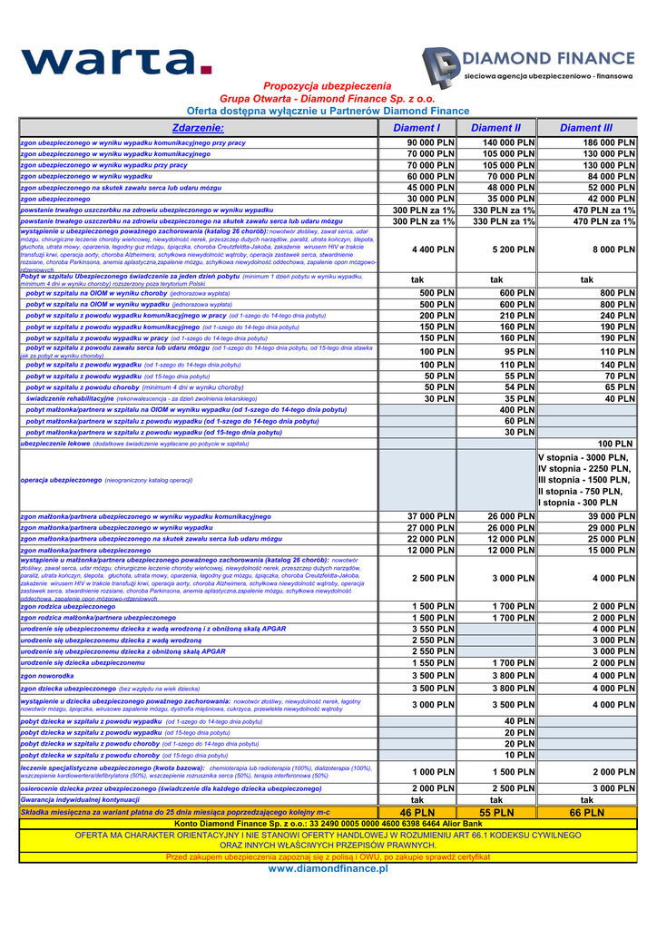Propozycja ubezpieczenia Grupa Otwarta - Diamond Finance Sp. z o.o. Oferta dostępna wyłącznie u Partnerów Diamond Finance Zdarzenie: zgon ubezpieczonego w wyniku wypadku komunikacyjnego przy pracy zgon ubezpieczonego w wyniku wypadku komunikacyjnego zgon ubezpieczonego w wyniku wypadku przy pracy zgon ubezpieczonego w wyniku wypadku zgon ubezpieczonego na skutek zawału serca lub udaru mózgu zgon ubezpieczonego powstanie trwałego uszczerbku na zdrowiu ubezpieczonego w wyniku wypadku powstanie trwałego uszczerbku na zdrowiu ubezpieczonego na skutek zawału serca lub udaru mózgu wystąpienie u ubezpieczonego poważnego zachorowania (katalog 26 chorób): nowotwór złośliwy, zawał serca, udar mózgu, chirurgiczne leczenie choroby wieńcowej, niewydolność nerek, przeszczep dużych narządów, paraliż, utrata kończyn, ślepota, głuchota, utrata mowy, oparzenia, łagodny guz mózgu, śpiączka, choroba Creutzfeldta-Jakoba, zakażenie wirusem HIV w trakcie transfuzji krwi, operacja aorty, choroba Alzheimera, schyłkowa niewydolność wątroby, operacja zastawek serca, stwardnienie rozsiane, choroba Parkinsona, anemia aplastyczna,zapalenie mózgu, schyłkowa niewydolność oddechowa, zapalenie opon mózgowordzeniowych Pobyt w szpitalu Ubezpieczonego świadczenie za jeden dzień pobytu (minimum 1 dzień pobytu w wyniku wypadku, minimum 4 dni w wyniku choroby) rozszerzony poza terytorium Polski pobyt w szpitalu na OIOM w wyniku choroby (jednorazowa wypłata) pobyt w szpitalu na OIOM w wyniku wypadku (jednorazowa wypłata) pobyt w szpitalu z powodu wypadku komunikacyjnego w pracy (od 1-szego do 14-tego dnia pobytu) pobyt w szpitalu z powodu wypadku komunikacyjnego (od 1-szego do 14-tego dnia pobytu) pobyt w szpitalu z powodu wypadku w pracy (od 1-szego do 14-tego dnia pobytu) pobyt w szpitalu z powodu zawału serca lub udaru mózgu (od 1-szego do 14-tego dnia pobytu, od 15-tego dnia stawka jak za pobyt w wyniku choroby) pobyt w szpitalu z powodu wypadku (od 1-szego do 14-tego dnia pobytu) pobyt w szpitalu z powodu wypadku (od 15-tego dnia pobytu) pobyt w szpitalu z powodu choroby (minimum 4 dni w wyniku choroby) świadczenie rehabilitacyjne (rekonwalescencja - za dzień zwolnienia lekarskiego) Diament I Diament II 90 000 PLN 70 000 PLN 70 000 PLN 60 000 PLN 45 000 PLN 30 000 PLN 300 PLN za 1% 300 PLN za 1% 140 000 PLN 105 000 PLN 105 000 PLN 70 000 PLN 48 000 PLN 35 000 PLN 330 PLN za 1% 330 PLN za 1% 186 000 PLN 130 000 PLN 130 000 PLN 84 000 PLN 52 000 PLN 42 000 PLN 470 PLN za 1% 470 PLN za 1% 4 400 PLN 5 200 PLN 8 000 PLN tak tak 500 PLN 500 PLN 200 PLN 150 PLN 150 PLN Diament III tak 600 PLN 600 PLN 210 PLN 160 PLN 160 PLN 800 PLN 800 PLN 240 PLN 190 PLN 190 PLN 100 PLN 95 PLN 110 PLN 100 PLN 50 PLN 50 PLN 30 PLN 110 PLN 55 PLN 54 PLN 35 PLN 400 PLN 60 PLN 30 PLN 140 PLN 70 PLN 65 PLN 40 PLN pobyt małżonka/partnera w szpitalu na OIOM w wyniku wypadku (od 1-szego do 14-tego dnia pobytu) pobyt małżonka/partnera w szpitalu z powodu wypadku (od 1-szego do 14-tego dnia pobytu) pobyt małżonka/partnera w szpitalu z powodu wypadku (od 15-tego dnia pobytu) 100 PLN ubezpieczenie lekowe (dodatkowe świadczenie wypłacane po pobycie w szpitalu) V stopnia - 3000 PLN, IV stopnia - 2250 PLN, III stopnia - 1500 PLN, II stopnia - 750 PLN, I stopnia - 300 PLN operacja ubezpieczonego (nieograniczony katalog operacji) 37 000 PLN 27 000 PLN 22 000 PLN 12 000 PLN 26 000 PLN 26 000 PLN 12 000 PLN 12 000 PLN 39 000 PLN 29 000 PLN 25 000 PLN 15 000 PLN 2 500 PLN 3 000 PLN 4 000 PLN 1 700 PLN 1 700 PLN zgon dziecka ubezpieczonego (bez względu na wiek dziecka) 1 500 PLN 1 500 PLN 3 550 PLN 2 550 PLN 2 550 PLN 1 550 PLN 3 500 PLN 3 500 PLN 1 700 PLN 3 800 PLN 3 800 PLN 2 000 PLN 2 000 PLN 4 000 PLN 3 000 PLN 3 000 PLN 2 000 PLN 4 000 PLN 4 000 PLN wystąpienie u dziecka ubezpieczonego poważnego zachorowania: nowotwór złośliwy, niewydolność nerek, łagotny nowotwór mózgu, śpiączka, wirusowe zapalenie mózgu, dystrofia mięśniowa, cukrzyca, przewlekła niewydolność wątroby 3 000 PLN 3 500 PLN 4 000 PLN zgon małżonka/partnera ubezpieczonego w wyniku wypadku komunikacyjnego zgon małżonka/partnera ubezpieczonego w wyniku wypadku zgon małżonka/partnera ubezpieczonego na skutek zawału serca lub udaru mózgu zgon małżonka/partnera ubezpieczonego wystąpienie u małżonka/partnera ubezpieczonego poważnego zachorowania (katalog 26 chorób): nowotwór złośliwy, zawał serca, udar mózgu, chirurgiczne leczenie choroby wieńcowej, niewydolność nerek, przeszczep dużych narządów, paraliż, utrata kończyn, ślepota, głuchota, utrata mowy, oparzenia, łagodny guz mózgu, śpiączka, choroba Creutzfeldta-Jakoba, zakażenie wirusem HIV w trakcie transfuzji krwi, operacja aorty, choroba Alzheimera, schyłkowa niewydolność wątroby, operacja zastawek serca, stwardnienie rozsiane, choroba Parkinsona, anemia aplastyczna,zapalenie mózgu, schyłkowa niewydolność oddechowa, zapalenie opon mózgowo-rdzeniowych zgon rodzica ubezpieczonego zgon rodzica małżonka/partnera ubezpieczonego urodzenie się ubezpieczonemu dziecka z wadą wrodzoną i z obniżoną skalą APGAR urodzenie się ubezpieczonemu dziecka z wadą wrodzoną urodzenie się ubezpieczonemu dziecka z obniżoną skalą APGAR urodzenie się dziecka ubezpieczonemu zgon noworodka 40 PLN 20 PLN 20 PLN 10 PLN pobyt dziecka w szpitalu z powodu wypadku (od 1-szego do 14-tego dnia pobytu) pobyt dziecka w szpitalu z powodu wypadku (od 15-tego dnia pobytu) pobyt dziecka w szpitalu z powodu choroby (od 1-szego do 14-tego dnia pobytu) pobyt dziecka w szpitalu z powodu choroby (od 15-tego dnia pobytu) leczenie specjalistyczne ubezpieczonego (kwota bazowa): chemioterapia lub radioterapia (100%), dializoterapia (100%), wszczepienie kardiowertera/defibrylatora (50%), wszczepienie rozrusznika serca (50%), terapia interferonowa (50%) 1 000 PLN 1 500 PLN 2 000 PLN osierocenie dziecka przez ubezpieczonego (świadczenie dla każdego dziecka ubezpiec