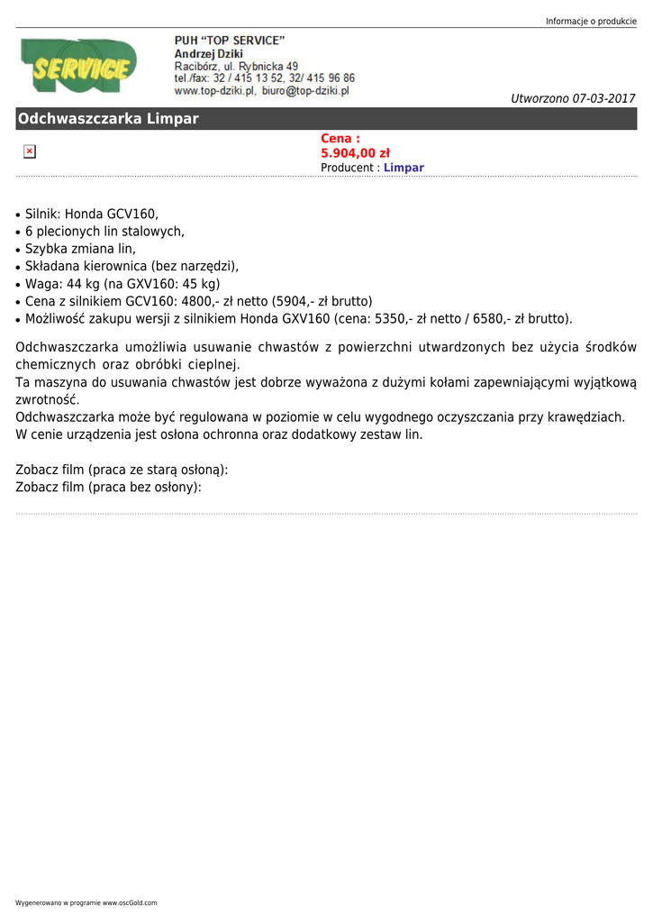 Informacje o produkcie Utworzono 07-03-2017 Odchwaszczarka Limpar Cena : 5.904,00 zł Producent : Limpar ● ● ● ● ● ● ● Silnik: Honda GCV160, 6 plecionych lin stalowych, Szybka zmiana lin, Składana kierownica (bez narzędzi), Waga: 44 kg (na GXV160: 45 kg) Cena z silnikiem GCV160: 4800,- zł netto (5904,- zł brutto) Możliwość zakupu wersji z silnikiem Honda GXV160 (cena: 5350,- zł netto / 6580,- zł brutto). Odchwaszczarka umożliwia usuwanie chwastów z powierzchni utwardzonych bez użycia środków chemicznych oraz obróbki cieplnej. Ta maszyna do usuwania chwastów jest dobrze wyważona z dużymi kołami zapewniającymi wyjątkową zwrotność. Odchwaszczarka może być regulowana w poziomie w celu wygodnego oczyszczania przy krawędziach. W cenie urządzenia jest osłona ochronna oraz dodatkowy zestaw lin. Zobacz film (praca ze starą osłoną): Zobacz film (praca bez osłony): Wygenerowano w programie www.oscGold.com