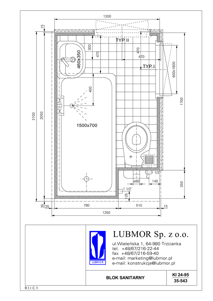15 1300 470 470 300 600x1800 470 TYP I 2050 2100 1700 400 460x350 TYP II 1500x700 1 1/2" 145 350 ø80 35 125 1 1/2" 35 790 510 15 1350 LUBMOR Sp. z o.o. LUBMOR ul.Wieleñska 1, 64-980 Trzcianka tel. +48/67/216-22-44 fax +48/67/216-59-40 e-mail: [email protected] e-mail: [email protected] BLOK SANITARNY R.f.l C.1 KI 24-95 35-543 BLOK SANITARNY PRZEZNACZENIE WYROBU Blok sanitarny z wanną przeznaczony jest do montażu na statkach jako kompletna łazienka do obsługi kabin załogi lub pasażerów. Blok taki może być również zainstalowany w pomieszczeniach budynków lądowych. WYKONANIE WYROBU Korpus bloku wykonany jest ze ścianek o grubości 33 mm utworzonych z kaset z blachy stalowej ocynkowanej wypełnionych wełną mineralną. Kasety wewnętrzne ścianek o grubości 0,75 mm - pokryte folią PCV, lub o grubości 1,5 mm - wyklejone płytkami ceramicznymi. Kasety zewnętrzne mają grubość 0,75 mm. Podłoga wykonana z blachy stalowej o grubości 4 mm. Zewnętrzne i wewnętrzne powierzchnie podłogi zabezpieczone są antykorozyjnie. Podłoga wyklejona jest płytkami ceramicznymi przeciwślizgowymi lub gładkimi z gretingiem. Sufit tworzą dwie blachy stalowe ocynkowane o grubości 0,75mm izolowane wewnątrz wełną mineralną. Kasety dolne ścianek sufitowych pokryte są folią PCV lub powłoką lakierniczą. W bloku zamontowane są drzwi klasy B-15 ze skrzydłem wykonanym z blachy pokrytej folią PCV i wypełnionym wełną mineralną. Wyposażenie bloku stanowi : - wanna 1500 z baterią natryskową z termostatem - uchwyty sztormowe szt.2 lub bez termostatu - wieszaki na ręczniki szt.3 - miska ustępowa naścienna (spłukiwanie grawitacyjne - wieszak na płaszcze kąpielowe szt.1 lub podciśnieniowe) - koszyk na mydło i gąbkę - umywalka z baterią - podstawka na mydło - szczotka ustępowa - anemostat wyciągowy ∅ 80 mm - kotara prysznicowa - grzejnik elektryczny 300W lub ogrzewanie podłogowe - inne wg życzenia - uchwyt na papier toaletowy + zapasowy - szafka toaletowa lub lustro - lampa naścienna z gniazdkiem Rurociągi doprowadzające ciepłą i zimną wodę izolowane są przeciwpotnie. Rurociągi wewnątrz bloku pokryte są powłoką niklowo-chromową. ZAKRES DOSTAWY Dostawa obejmuje kompletnie wyposażony blok sanitarny przystosowany do podłączenia do instalacji wodnej i elektrycznej. Blok sanitarny może być dostarczony w całości lub w częściach (do zamontowania w miejscu przeznaczenia). OPAKOWANIE, TRANSPORT, MAGAZYNOWANIE Bloki sanitarne opakowane są folią, drzwi zabezpieczone są płytą pilśniową. Przemieszczanie bloków odbywa się za pomocą wózków widłowych lub dźwigów. Muszą być składowane w zamkniętych pomieszczeniach magazynowych. Bloki sanitarne dostarczane w częściach pakowane są w skrzynie drewniane. PODZIAŁ, OZNACZENIE I WYKOŃCZENIE Odmiany : P - prawy jak na rysunku L - lewy wg lustrzanego odbicia Kierunek otwierania drzwi A - L/P - drzwi otwierane na zewn ątrz lewe lub prawe. Wyposażenie: 1 - umywalka 3 - wanna 1500 5 - miska ustępowa Typy : I - jak na rys. II - jak na rys. Rodzaj sp łukiwania: a - grawitacyjny c - system podciśnieniowy PRZYKŁAD OZNACZENIA Blok sanitarny o wymiarach 1350x2100 prawy typu I z drzwiami lewymi otwieranymi na zewnątrz wyposażony w umywalkę, wannę i miskę ustępową ze spłukiwaniem grawitacyjnym. BLOK SANITARNY 1350x2100-P-IA-L-135a wg KI 24-95/35-543.