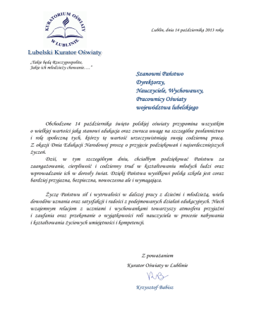 Lublin, dnia 14 października 2013 roku „Takie będą Rzeczypospolite, Jakie ich młodzieży chowanie….” Szanowni Państwo Dyrektorzy, Nauczyciele, Wychowawcy, Pracownicy Oświaty województwa lubelskiego Obchodzone 14 października święto polskiej oświaty przypomina wszystkim o wielkiej wartości jaką stanowi edukacja oraz zwraca uwagę na szczególne posłannictwo i rolę społeczną tych, którzy tę wartość urzeczywistniają swoją codzienną pracą. Z okazji Dnia Edukacji Narodowej proszę o przyjęcie podziękowań i najserdeczniejszych życzeń. Dziś, w tym szczególnym dniu, chciałbym podziękować Państwu za zaangażowanie, cierpliwość i codzienny trud w kształtowaniu młodych ludzi oraz wprowadzanie ich w dorosły świat. Dzięki Państwa wysiłkowi polska szkoła jest coraz bardziej przyjazna, bezpieczna, nowoczesna ale i wymagająca. Życzę Państwu sił i wytrwałości w dalszej pracy z dziećmi i młodzieżą, wielu dowodów uznania oraz satysfakcji i radości z podejmowanych działań edukacyjnych. Niech wzajemnym relacjom z uczniami i wychowankami towarzyszy atmosfera przyjaźni i zaufania oraz przekonanie o wyjątkowości roli nauczyciela w procesie nabywania i kształtowania życiowych umiejętności i kompetencji. Z poważaniem Kurator Oświaty w Lublinie Krzysztof Babisz