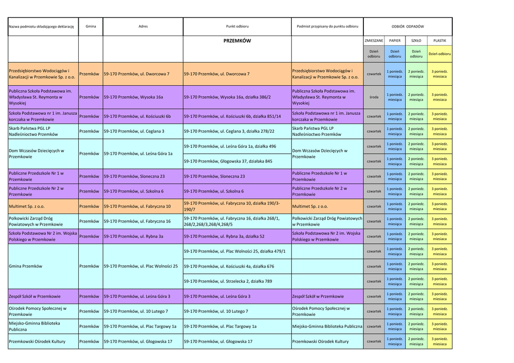 Nazwa podmiotu składającego deklarację Gmina Adres Punkt odbioru Podmiot przypisany do punktu odbioru PRZEMKÓW Przedsiębiorstwo Wodociągów i Przemków 59-170 Przemków, ul. Dworcowa 7 Kanalizacji w Przemkowie Sp. z o.o. ODBIÓR ODPADÓW ZMIESZANE PAPIER SZKŁO PLASTIK Dzień odbioru Dzień odbioru Dzień odbioru Dzień odbioru czwartek 1 poniedz. miesiąca 2 poniedz. miesiąca 3 poniedz. miesiaca środa 1 poniedz. miesiąca 2 poniedz. miesiąca 3 poniedz. miesiaca 59-170 Przemków, ul. Dworcowa 7 Przedsiębiorstwo Wodociągów i Kanalizacji w Przemkowie Sp. z o.o. 59-170 Przemków, Wysoka 16a, działka 386/2 Publiczna Szkoła Podstawowa im. Władysława St. Reymonta w Wysokiej Szkoła Podstawowa nr 1 im. Janusza Przemków 59-170 Przemków, ul. Kościuszki 6b korczaka w Przemkowie 59-170 Przemków, ul. Kościuszki 6b, działka 851/14 Szkoła Podstawowa nr 1 im. Janusza korczaka w Przemkowie czwartek 1 poniedz. miesiąca 2 poniedz. miesiąca 3 poniedz. miesiaca Skarb Państwa PGL LP Nadleśnioctwo Przemków 59-170 Przemków, ul. Ceglana 3, działka 278/22 Skarb Państwa PGL LP Nadleśnioctwo Przemków czwartek 1 poniedz. miesiąca 2 poniedz. miesiąca 3 poniedz. miesiaca czwartek 1 poniedz. miesiąca 2 poniedz. miesiąca 3 poniedz. miesiaca czwartek 1 poniedz. miesiąca 2 poniedz. miesiąca 3 poniedz. miesiaca Publiczna Szkoła Podstawowa im. Władysława St. Reymonta w Wysokiej Dom Wczasów Dziecięcych w Przemkowie Przemków 59-170 Przemków, Wysoka 16a Przemków 59-170 Przemków, ul. Ceglana 3 59-170 Przemków, ul. Leśna Góra 1a, działka 496 Przemków 59-170 Przemków, ul. Leśna Góra 1a 59-170 Przemków, Głogowska 37, działaka 845 Dom Wczasów Dziecięcych w Przemkowie Publiczne Przedszkole Nr 1 w Przemkowie Przemków 59-170 Przemków, Sloneczna 23 59-170 Przemków, Sloneczna 23 Publiczne Przedszkole Nr 1 w Przemkowie czwartek 1 poniedz. miesiąca 2 poniedz. miesiąca 3 poniedz. miesiaca Publiczne Przedszkole Nr 2 w Przemkowie Przemków 59-170 Przemków, ul. Szkolna 6 59-170 Przemków, ul. Szkolna 6 Publiczne Przedszkole Nr 2 w Przemkowie czwartek 1 poniedz. miesiąca 2 poniedz. miesiąca 3 poniedz. miesiaca Multimet Sp. z o.o. Przemków 59-170 Przemków, ul. Fabryczna 10 59-170 Przemków, ul. Fabryczna 10, działka 190/3190/7 Multimet Sp. z o.o. czwartek 1 poniedz. miesiąca 2 poniedz. miesiąca 3 poniedz. miesiaca Polkowicki Zarząd Dróg Powiatowych w Przemkowie Przemków 59-170 Przemków, ul. Fabryczna 16 59-170 Przemków, ul. Fabryczna 16, działka 268/1, 268/2,268/3,268/4,268/5 Polkowicki Zarząd Dróg Powiatowych czwartek w Przemkowie 1 poniedz. miesiąca 2 poniedz. miesiąca 3 poniedz. miesiaca 59-170 Przemków, ul. Rybna 3a, działka 52 Szkoła Podstawowa Nr 2 im. Wojska Polskiego w Przemkowie czwartek 1 poniedz. miesiąca 2 poniedz. miesiąca 3 poniedz. miesiaca 59-170 Przemków, ul. Plac Wolności 25, działka 479/1 czwartek 1 poniedz. miesiąca 2 poniedz. miesiąca 3 poniedz. miesiaca 59-170 Przemków, ul. Kościuszki 4a, działka 676 czwartek 1 poniedz. miesiąca 2 poniedz. miesiąca 3 poniedz. miesiaca 59-170 Przemków, ul. Strzelecka 2, działka 789 czwartek 1 poniedz. miesiąca 2 poniedz. miesiąca 3 poniedz. miesiaca Szkoła Podstawowa Nr 2 im. Wojska Przemków 59-170 Przemków, ul. Rybna 3a Polskiego w Przemkowie Gmina Przemków Przemków 59-170 Przemków, ul. Plac Wolności 25 Zespół Szkół w Przemkowie Przemków 59-170 Przemków, ul. Leśna Góra 3 59-170 Przemków, ul. Leśna Góra 3 Zespół Szkół w Przemkowie czwartek 1 poniedz. miesiąca 2 poniedz. miesiąca 3 poniedz. miesiaca Ośrodek Pomocy Społecznej w Przemkowie Przemków 59-170 Przemków, ul. 10 Lutego 7 59-170 Przemków, ul. 10 Lutego 7 Ośrodek Pomocy Społecznej w Przemkowie czwartek 1 poniedz. miesiąca 2 poniedz. miesiąca 3 poniedz. miesiaca Miejsko-Gminna Biblioteka Publiczna Przemków 59-170 Przemków, ul. Plac Targowy 1a 59-170 Przemków, ul. Plac Targowy 1a Miejsko-Gminna Biblioteka Publiczna czwartek 1 poniedz. miesiąca 2 poniedz. miesiąca 3 poniedz. miesiaca Przemkowski Ośrodek Kultury Przemków 59-170 Przemków, ul. Głogowska 17 59-170 Przemków, ul. Głogowska 17 Przemkowski Ośrodek Kultury 1 poniedz. miesiąca 2 poniedz. miesiąca 3 poniedz. miesiaca czwartek Nazwa podmiotu składającego deklarację Tauron Dystrybucja S.A. Gmina Polkowice Adres 59-100 Polkowice, ul. Energetyków 1 Punkt odbioru 59-140 Chocianów, ul. Łąkowa 1 Podmiot przypisany do punktu odbioru ODBIÓR ODPADÓW czwartek 1 poniedz. miesiąca 2 poniedz. miesiąca 3 poniedz. miesiaca