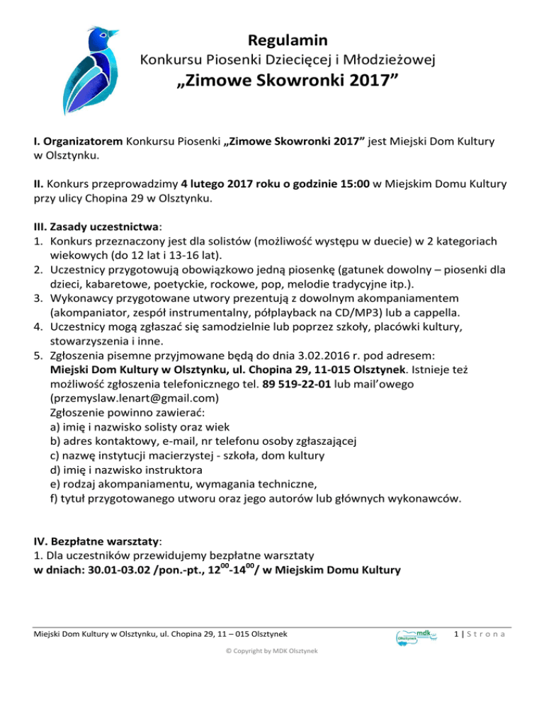 Regulamin Konkursu Piosenki Dziecięcej i Młodzieżowej „Zimowe Skowronki 2017” I. Organizatorem Konkursu Piosenki „Zimowe Skowronki 2017” jest Miejski Dom Kultury w Olsztynku. II. Konkurs przeprowadzimy 4 lutego 2017 roku o godzinie 15:00 w Miejskim Domu Kultury przy ulicy Chopina 29 w Olsztynku. III. Zasady uczestnictwa: 1. Konkurs przeznaczony jest dla solistów (możliwośd występu w duecie) w 2 kategoriach wiekowych (do 12 lat i 13-16 lat). 2. Uczestnicy przygotowują obowiązkowo jedną piosenkę (gatunek dowolny – piosenki dla dzieci, kabaretowe, poetyckie, rockowe, pop, melodie tradycyjne itp.). 3. Wykonawcy przygotowane utwory prezentują z dowolnym akompaniamentem (akompaniator, zespół instrumentalny, półplayback na CD/MP3) lub a cappella. 4. Uczestnicy mogą zgłaszad się samodzielnie lub poprzez szkoły, placówki kultury, stowarzyszenia i inne. 5. Zgłoszenia pisemne przyjmowane będą do dnia 3.02.2016 r. pod adresem: Miejski Dom Kultury w Olsztynku, ul. Chopina 29, 11-015 Olsztynek. Istnieje też możliwośd zgłoszenia telefonicznego tel. 89 519-22-01 lub mail’owego ([email protected]) Zgłoszenie powinno zawierad: a) imię i nazwisko solisty oraz wiek b) adres kontaktowy, e-mail, nr telefonu osoby zgłaszającej c) nazwę instytucji macierzystej - szkoła, dom kultury d) imię i nazwisko instruktora e) rodzaj akompaniamentu, wymagania techniczne, f) tytuł przygotowanego utworu oraz jego autorów lub głównych wykonawców. IV. Bezpłatne warsztaty: 1. Dla uczestników przewidujemy bezpłatne warsztaty w dniach: 30.01-03.02 /pon.-pt., 1200-1400/ w Miejskim Domu Kultury Miejski Dom Kultury w Olsztynku, ul. Chopina 29, 11 – 015 Olsztynek © Copyright by MDK Olsztynek 1|S t r o n a V. Ocena i nagrody: 1. Uczestnicy będą walczyd o statuetkę „Zimowego Skowronka” w dwóch kategoriach wiekowych: do 12 lat oraz 13-16 lat. 2. Jury oceniad będzie: dobór repertuaru, interpretację wokalną i sceniczną, poziom warsztatu wykonawczego. 3. Laureaci konkursu otrzymują dyplomy i nagrody ufundowane przez organizatorów i sponsorów. 4. Wszyscy uczestnicy otrzymują pamiątkowe dyplomy i słodki upominek. VI. Sprawy organizacyjne: 1. Kolejnośd prezentacji ustala organizator. 2. Uczestnicy przyjeżdżają na własny koszt. VII. Organizatorzy zastrzegają sobie prawo zmian w regulaminie, jeżeli nastąpi taka koniecznośd i prawo ostatecznej interpretacji powyższego regulaminu. SERDECZNIE ZAPRASZAMY DO WSPÓLNEJ ZABAWY NA KONKURSIE „Zimowe Skowronki 2017”!!! Miejski Dom Kultury w Olsztynku, ul. Chopina 29, 11 – 015 Olsztynek © Copyright by MDK Olsztynek 2|S t r o n a