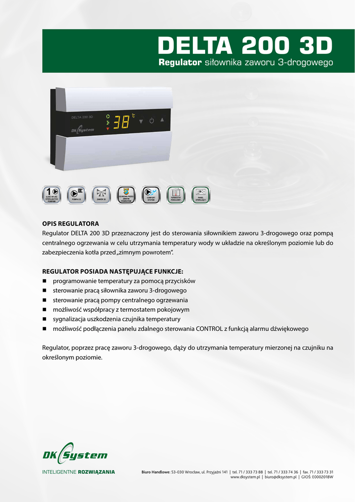 DELTA 200 3D Regulator siłownika zaworu 3-drogowego 1 ILOŚĆ WYJŚĆ STERUJĄCYCH POMPAMI POMPA CO ZAWÓR 3D OCHRONA PRZED ZIMNYM POWROTEM COMFORT SYSTEM TERMOSTAT POKOJOWY PANEL STERUJĄCY OPIS REGULATORA Regulator DELTA 200 3D przeznaczony jest do sterowania siłownikiem zaworu 3-drogowego oraz pompą centralnego ogrzewania w celu utrzymania temperatury wody w układzie na określonym poziomie lub do zabezpieczenia kotła przed „zimnym powrotem”. REGULATOR POSIADA NASTĘPUJĄCE FUNKCJE: programowanie temperatury za pomocą przycisków sterowanie pracą siłownika zaworu 3-drogowego sterowanie pracą pompy centralnego ogrzewania możliwość współpracy z termostatem pokojowym sygnalizacja uszkodzenia czujnika temperatury możliwość podłączenia panelu zdalnego sterowania CONTROL z funkcją alarmu dźwiękowego Regulator, poprzez pracę zaworu 3-drogowego, dąży do utrzymania temperatury mierzonej na czujniku na określonym poziomie. INTELIGENTNE ROZWIĄZANIA Biuro Handlowe: 53-030 Wrocław, ul. Przyjaźni 141 | tel. 71 / 333 73 88 | tel. 71 / 333 74 36 | fax. 71 / 333 73 31 www.dksystem.pl | [email protected] | GIOŚ: E0002018W DANE TECHNICZNE DELTA 200 3D Zakres mierzonych temperatur od - 9 °C do + 99 °C Zakres ustawienia temperatur od + 10 °C do + 90 °C Histereza zaworu 3-drogowego od 1 °C do 5 °C pompa: 100 W / 230 V zawór 3-dr: 50 W / 230 V Obciążalność wyjścia Znamionowe napięcie zasilania 230 V, 50 Hz Zabezpieczenie elektryczne 1,25 A Wilgotność względna powietrza < 95 % Stopień ochrony IP40 Klasa izolacji II Tryb rozłączenia pełne Wymiary regulatora 145 x 90 x 45 mm Temperatura otoczenia od 0 °C do + 40 °C Klasa oprogramowania A SCHEMAT PODŁĄCZENIA REGULATORA DO INSTALACJI GRZEWCZEJ 2 1 ~ 230 V 5 3 1. 2. 3. 4. 5. 4 Regulator DELTA 200 3D Panel zdalnego sterowania CONTROL Zawór 3-drogowy Czujnik temperatury Pompa Przykładowy schemat instalacji ogrzewania podłogowego ze sterownikiem DELTA 200 3D bez urządzeń odcinających i zabezpieczających. Nie zastępuje on fachowego projektu w miejscu montażu.