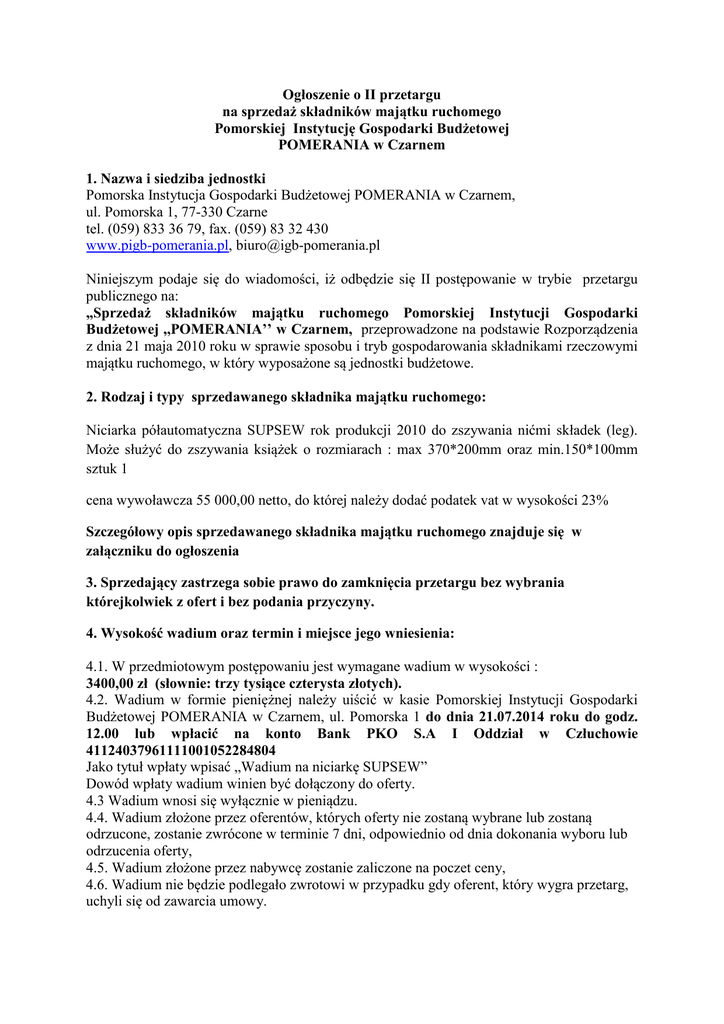 Ogłoszenie o II przetargu na sprzedaż składników majątku ruchomego Pomorskiej Instytucję Gospodarki Budżetowej POMERANIA w Czarnem 1. Nazwa i siedziba jednostki Pomorska Instytucja Gospodarki Budżetowej POMERANIA w Czarnem, ul. Pomorska 1, 77-330 Czarne tel. (059) 833 36 79, fax. (059) 83 32 430 www.pigb-pomerania.pl, [email protected] Niniejszym podaje się do wiadomości, iż odbędzie się II postępowanie w trybie przetargu publicznego na: „Sprzedaż składników majątku ruchomego Pomorskiej Instytucji Gospodarki Budżetowej ,,POMERANIA’’ w Czarnem, przeprowadzone na podstawie Rozporządzenia z dnia 21 maja 2010 roku w sprawie sposobu i tryb gospodarowania składnikami rzeczowymi majątku ruchomego, w który wyposażone są jednostki budżetowe. 2. Rodzaj i typy sprzedawanego składnika majątku ruchomego: Niciarka półautomatyczna SUPSEW rok produkcji 2010 do zszywania nićmi składek (leg). Może służyć do zszywania książek o rozmiarach : max 370*200mm oraz min.150*100mm sztuk 1 cena wywoławcza 55 000,00 netto, do której należy dodać podatek vat w wysokości 23% Szczegółowy opis sprzedawanego składnika majątku ruchomego znajduje się w załączniku do ogłoszenia 3. Sprzedający zastrzega sobie prawo do zamknięcia przetargu bez wybrania którejkolwiek z ofert i bez podania przyczyny. 4. Wysokość wadium oraz termin i miejsce jego wniesienia: 4.1. W przedmiotowym postępowaniu jest wymagane wadium w wysokości : 3400,00 zł (słownie: trzy tysiące czterysta złotych). 4.2. Wadium w formie pieniężnej należy uiścić w kasie Pomorskiej Instytucji Gospodarki Budżetowej POMERANIA w Czarnem, ul. Pomorska 1 do dnia 21.07.2014 roku do godz. 12.00 lub wpłacić na konto Bank PKO S.A I Oddział w Człuchowie 41124037961111001052284804 Jako tytuł wpłaty wpisać „Wadium na niciarkę SUPSEW” Dowód wpłaty wadium winien być dołączony do oferty. 4.3 Wadium wnosi się wyłącznie w pieniądzu. 4.4. Wadium złożone przez oferentów, których oferty nie zostaną wybrane lub zostaną odrzucone, zostanie zwrócone w terminie 7 dni, odpowiednio od dnia dokonania wyboru lub odrzucenia oferty, 4.5. Wadium złożone przez nabywcę zostanie zaliczone na poczet ceny, 4.6. Wadium nie będzie podlegało zwrotowi w przypadku gdy oferent, który wygra przetarg, uchyli się od zawarcia umowy. 5. Wymagania jakimi powinna odpowiadać oferta złożona na sprzedawany składnik majątku ruchomego: (wzór oferty-załącznik) 5.1. Ofertę należy złożyć w formie pisemnej, która musi zawierać: a) imię, nazwisko i adres lub nazwę (firmę) i siedzibę oferenta, b) nazwę składnika majątku oraz oferowaną za jego nabycie cenę sposób i warunki jej zapłaty c) oświadczenie oferenta, iż zapoznał się ze stanem technicznym przedmiotu przetargu lub, że ponosi odpowiedzialność za skutki wynikające z rezygnacji z oględzin. 5.2. Oferta musi być złożona w zamkniętej nieprzezroczystej kopercie i zaadresowana według poniższego wzoru: „Pomorska Instytucja Gospodarki Budżetowej Pomerania w Czarnem ul. Pomorska1, 77-330 Czarne, przetarg na sprzedaż majątku ruchomego – niciarka, nie otwierać przed 22.07.2014 godz. 10.15, oraz nazwa i adres Kupującego.” Sprzedający nie bierze odpowiedzialności za skutki braku zachowania powyższego sposobu opakowania i opisu kopert tj.: np. rozerwanie koperty w czasie drogi do Sprzedającego, nieskuteczne doręczenie z powodu złego opisu. 5.3. Nie dopuszcza się składania ofert częściowych w ramach zakupu składnika majątku 5.4. Kupujący ponoszą wszelkie koszty związane z przygotowaniem i złożeniem oferty. 5.5. Oferta powinna być napisana w języku polskim, powinna być sporządzona czytelnie oraz podpisana przez osobę upoważnioną do reprezentowania firmy na zewnątrz (właściciela). Jeżeli ofertę podpisuje osoba uprawomocniona do reprezentowania firmy do oferty powinno być dołączone pełnomocnictwo. 5.6. Wszelkie poprawki lub zmiany w tekście oferty muszą być parafowane własnoręcznie przez osobę podpisującą ofertę. 5.7. Wszelkie strony oferty mogą być spięte, zszyte w sposób zapobiegający możliwości dekompletacji zawartości oferty. 5.8. Oferty zostaną odrzucone, jeżeli: a) zostaną złożone po wyznaczonym terminie, w niewłaściwym miejscu lub przez osobę, która nie wniosła wadium, b) nie zawierają danych i dokumentów, o których mowa w ogłoszeniu lub są one niekompletne, nieczytelne lub budzą inną wątpliwość, zaś złożenie wyjaśnień mogłoby prowadzić do uznania jej za nową ofertę. c) uczestnicy przetargu nie zaoferowali co najmniej ceny wywoławczej 5.9. O odrzuceniu oferty komisja przetargowa zawiadamia niezwłocznie oferenta. 5.10. Złożenie jednej ważnej oferty wystarcza do przeprowadzenia przetargu 5.11 Komisja przetargowa wybiera oferenta ,który zaoferował najwyższą cenę. 5.12. Termin, w którym oferent będzie związany ze złożoną ofertą wynosi 30 dni. 6. Miejsce oraz termin przeprowadzenia przetargu: 6.1. Oferty należy złożyć w sekretariacie Pomorskiej Instytucji Gospodarki Budżetowej ,,POMERANIA’’ w Czarnem, ul. Pomorska 1 , 77-330 Czarne do dnia 22.07.2014 roku do godz. 10.00 6.2. Otwarcie ofert nastąpi dnia 22.07.2014 roku o godz. 10.15 w Pomorskiej Instytucji Gospodarki Budżetowej ,,POMERANIA’’ w Czarnem, ul. Pomorska 1 7.Składnik majątku ruchomego wymieniony w pkt. 2 można oglądać od poniedziałku do piątku w godz. 7:00 - 15:00 na terenie Pomorskiej Instytucji Gospodarki Budżetowej ,,POMERANIA’’ w Czarnem, ul. Pomorska 1 8.. Nabywca będzie zobowiązany do zapłacenia sprzedającemu cenę nabycia w terminie nie dłuższym niż 7 dni od dnia zawarcia umowy sprzedaży. Wydanie przedmiotu sprzedaży następuje niezwłocznie po zapłaceniu przez nabywcę ceny nabycia . Odbiór środka trwałego – transportem na koszt i ryzyko kupującego. 9. Osobą uprawnioną przez Zamawiającego do kontaktowania się z oferentami
