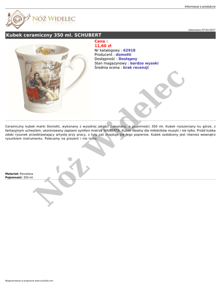 Informacje o produkcie Utworzono 07-03-2017 Kubek ceramiczny 350 ml. SCHUBERT Cena : 11,60 zł id e le c Nr katalogowy : 62918 Producent : domotti Dostępność : Dostępny Stan magazynowy : bardzo wysoki Średnia ocena : brak recenzji W Ceramiczny kubek marki Domotti, wykonany z wysokiej jakości porcelany, o pojemności 350 ml. Kubek rozszerzany ku górze, z fantazyjnym uchwytem, ukoronowany zapisem symfoni mistrza SHUBERTA. Kubek idealny dla miłośników muzyki i nie tylko. Przód kubka zdobi rysunek przedstawiający artystę przy pracy, z tyłu zaś znajduje się jego popiersie. Kubek ozdobiony jest również wewnątrz rysunkiem instrumentu. Polecamy na prezent i nie tylko. N Materiał: Porcelana Pojemność: 350 ml. óż . Wygenerowano w programie www.oscGold.com