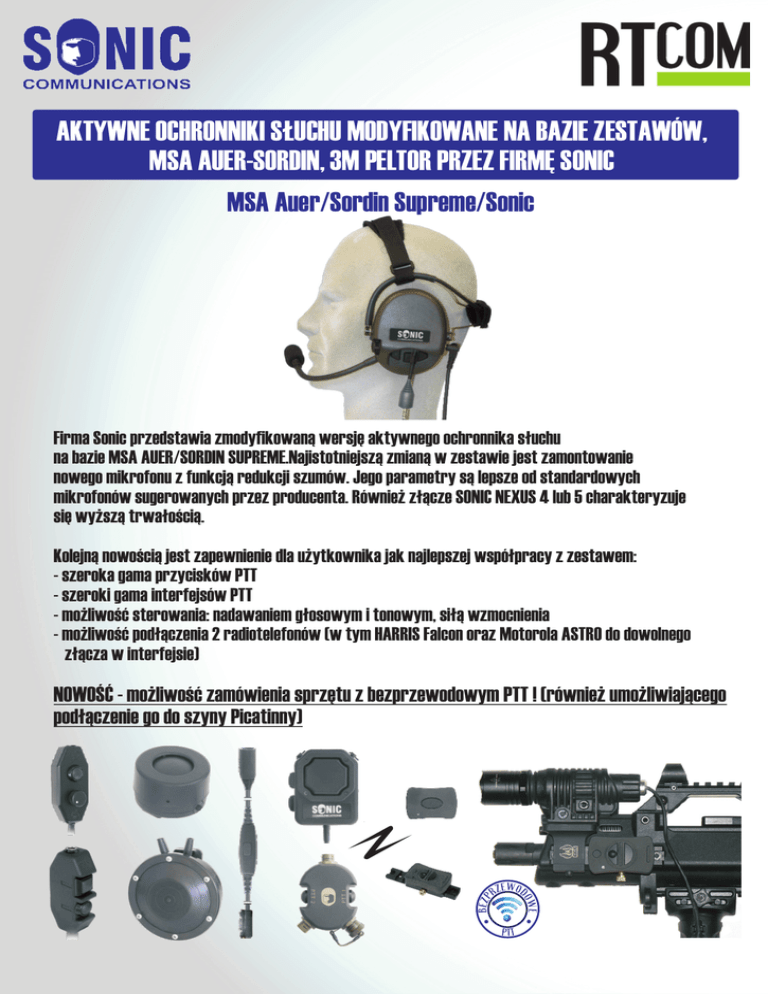 AKTYWNE OCHRONNIKI S£UCHU MODYFIKOWANE NA BAZIE ZESTAWÓW, MSA AUER-SORDIN, 3M PELTOR PRZEZ FIRMÊ SONIC MSA Auer/Sordin Supreme/Sonic Firma Sonic przedstawia zmodyfikowan¹ wersjê aktywnego ochronnika s³uchu na bazie MSA AUER/SORDIN SUPREME.Najistotniejsz¹ zmian¹ w zestawie jest zamontowanie nowego mikrofonu z funkcj¹ redukcji szumów. Jego parametry s¹ lepsze od standardowych mikrofonów sugerowanych przez producenta. Równie¿ z³¹cze SONIC NEXUS 4 lub 5 charakteryzuje siê wy¿sz¹ trwa³oœci¹. Kolejn¹ nowoœci¹ jest zapewnienie dla u¿ytkownika jak najlepszej wspó³pracy z zestawem: - szeroka gama przycisków PTT - szeroki gama interfejsów PTT - mo¿liwoœæ sterowania: nadawaniem g³osowym i tonowym, si³¹ wzmocnienia - mo¿liwoœæ pod³¹czenia 2 radiotelefonów (w tym HARRIS Falcon oraz Motorola ASTRO do dowolnego z³¹cza w interfejsie) NOWOŒÆ - mo¿liwoœæ zamówienia sprzêtu z bezprzewodowym PTT ! (równie¿ umo¿liwiaj¹cego pod³¹czenie go do szyny Picatinny)