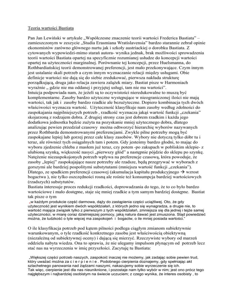 Teoria wartości Bastiata Pan Jan Lewiński w artykule „Współczesne znaczenie teorii wartości Frederica Bastiata” – zamieszczonym w zeszycie „Studia Erasmiana Wratislavensia” bardzo starannie zebrał opinie ekonomistów zarówno głównego nurtu jak i szkoły austriackiej o dorobku Bastiata. Z cytowanych wypowiedzi-mimo starań autora- wynika jednak, brak możliwości sprowadzenia teorii wartości Bastiata opartej na specyficznie rozumianej usłudze do koncepcji wartości opartej na użyteczności marginalnej. Porównanie tej koncepcji, przez Huelsmanna, do Rothbardiańskiej teorii demonstrowanej preferencji, jest mało przekonywające. Czym innym jest ustalanie skali potrzeb a czym innym wyznaczanie relacji między usługami. Obie definicje wartości nie dają się do siebie zredukować, pierwsza nakłada strukturę porządkującą, druga jako relacja zawiera zalążek miary. Bastiat pisze w Harmoniach wyraźnie „ gdzie nie ma oddanej i przyjętej usługi, tam nie ma wartości”. Intuicja podpowiada nam, że jeżeli są to oczywistości nieredukowalne to muszą być komplementarne. Zasoby bardzo użyteczne występujące w nieograniczonej ilości nie mają wartości, tak jak i zasoby bardzo rzadkie ale bezużyteczne. Dopiero kombinacja tych dwóch właściwości wyznacza wartość. Użyteczność klasyfikuje nam zasoby według zdolności do zaspokajania najpilniejszych potrzeb , rzadkość wyznacza jakąś wartość funkcji „czekania” skojarzoną z rodzajem dobra. Z drugiej strony czas jest dobrem rzadkim i każda jego dodatkowa jednostka będzie zużyta na pozyskanie mniej użytecznego dobra, dlatego analizując pewien przedział czasowy można odtworzyć hierarchię wyborów nazywanych przez Rothbarda demonstrowanymi preferencjami. Zwykle pilne potrzeby mogą być zaspokajane lepiej lub gorzej przez całe klasy zasobów. Wybory nie dotyczą tylko dóbr tu i teraz, ale również tych osiągalnych tam i potem. Gdy jesteśmy bardzo głodni, to mając do wyboru zjedzenie chleba z masłem już teraz, czy potem -po zakupach w pobliskim sklepie- z ulubioną szynką, większość nasyci „pierwszy głód” a następnie pójdzie do sklepu po szynkę. Natężenie niezaspokojonych potrzeb wpływa na preferencje czasową, która powoduje, że zasoby „lepiej” zaspokajające nasze potrzeby ale rzadsze, będą przegrywać w wyborach z gorszymi ale bardziej pospolitymi substytutami (mniejsza wartość funkcji „czekania”). Dlatego, ze spadkiem preferencji czasowej (akumulacja kapitału produkcyjnego Æ wzrost bogactwa ), nie tylko oszczędności rosną ale rośnie też konsumpcja bardziej wartościowych (rzadszych) substytutów. Bastiata interesuje proces redukcji rzadkości, doprowadzania do tego, że to co było bardzo wartościowe i mało dostępne, staje się mniej rzadkie a tym samym bardziej dostępne. Bastiat tak pisze o tym „w każdym produkcie część darmowa, dąży do zastąpienia części uciążliwej. Oto, że gdy użyteczność jest wynikiem dwóch współdziałań, z których jedno się wynagradza, a drugie nie, to wartość mająca związek tylko z pierwszym z tych współdziałań, zmniejsza się dla jednej i tejże samej użyteczności, w miarę coraz dzielniejszej pomocy, jaką natura dawać jest zmuszona. Stąd powiedzieć można, że ludzkość o tyle więcej ma zaspokojeń i bogactw, o ile mniej posiada wartości.” O ile klasyfikacja potrzeb pod kątem pilności podlega ciągłym zmianom subiektywnie warunkowanym, o tyle rzadkość konkretnego zasobu jest właściwością obiektywną (niezależną od subiektywnej oceny) i dającą się mierzyć. Rzeczywiste wybory od marzeń oddziela nabyta wiedza. Ona to sprawia, że nie ulegamy impulsom płynącym od potrzeb lecz stać nas na wyrzeczenia w imię przyszłości. Zacytuję tu Bastiata: „Większej części potrzeb naszych, zaspokoić inaczej nie możemy, jak zadając sobie pewien trud, który uważać można za c i e r p i e n i e . Podobnego cierpienia doznajemy, gdy spełniając akt szlachetnego panowania nad żądzami naszymi, nakazujemy sobie wyrzeczenie się ich. Tak więc, cierpienie jest dla nas nieuniknione, i pozostaje nam tylko wybór w nim; jest ono prócz tego najgłębszym i najbardziej osobistym na świecie uczuciem; z czego wynika, że interes osobisty , to uczucie napiętnowane za dni naszych, mianem egoizmu, indywidualizmu — jest nie do zniszczenia.” I dalej „przeznaczeniem cierpienia jest stopniowe zniszczenie własnych jego przyczyn, zamknięcie się w granicach coraz szczuplejszych, a ostatecznie, zapewnienie przewagi dobra i piękna,” „Godnym uwagi fenomenem jest owa szybkość za pomocą której, dzięki ciągłemu zaspokojeniu — to co było jeszcze nieokreślonym życzeniem, staje się gustem, a to co było gustem tylko — staje się potrzebą, a nawet gwałtowną potrzebą.” W tych kilku zdaniach znajdujemy zalążek tezy rozwiniętej przez A.Rand w książce „Cnota egoizmu” jak i tezy Hansa-Hermana Hoppe o kulturotwórczym mechanizmie związanym z redukcją preferencji czasowej. Do tego momentu, przy odpowiedniej interpretacji, nie ma większej rozbieżności koncepcji Bastiata z porządkowym charakterem współczesnej marginalistycznej koncepcji wartości. Problemy zaczynają się gdy przejdziemy do dobrowolnej wymiany. Austriacy jako warunek wymiany przyjmują odwrotne porządkowanie dóbr przez uczestników wymiany tj. użyteczność krańcowa jednostki pozyskanego dobra ma być wyższa od użyteczności krańcowej jednostki dobra oddanego , natomiast Bastiat zakłada możliwość porównania korzyści z wymiany usług (oszczędności na czasie) : „są okoliczności, w których zadając sobie bardzo mało trudu, możemy wielką wyświadczyć Usługę; a są inne znowu, w których widzimy, że największy trud nawet, nie wyświadczy nikomu usługi i dla tego pod tym jeszcze względem, słusznie powiedzieć możemy, że Wartość jest raczej w Usłud