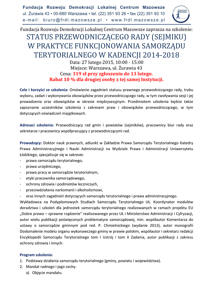 Fundacja Rozwoju Demokracji Lokalnej Centrum Mazowsze zaprasza na szkolenie: STATUS PRZEWODNICZĄCEGO RADY (SEJMIKU) W PRAKTYCE FUNKCJONOWANIA SAMORZĄDU TERYTORIALNEGO W KADENCJI 2014-2018 Data: 27 lutego 2015, 10:00 - 15:00 Miejsce: Warszawa, ul. Żurawia 43 Cena: 319 zł przy zgłoszeniu do 13 lutego. Rabat 10 % dla drugiej osoby z tej samej Instytucji. Cele i korzyści ze szkolenia: Omówienie zagadnień statusu prawnego przewodniczącego rady, trybu wyboru, zadań i wykonywania obowiązków przez przewodniczącego rady, w tym zwoływania sesji i jej prowadzenia oraz obowiązków w okresie międzysesyjnym. Przedmiotem szkolenia będzie także zapoznanie uczestników szkolenia z zakresem praw i obowiązków przewodniczącego, w tym dotyczących oświadczeń majątkowych. Adresaci szkolenia: Przewodniczący rad gmin i powiatów (sejmików), pracownicy biur rady oraz sekretarze i pracownicy współpracujący z przewodniczącymi rad. Prowadzący: Doktor nauk prawnych, adiunkt w Zakładzie Prawa Samorządu Terytorialnego Katedry Prawa Administracyjnego i Nauki Administracji na Wydziale Prawa i Administracji Uniwersytetu Łódzkiego, specjalizuje się w zakresie: - prawa samorządu terytorialnego, - prawa urzędniczego, - prawa pracy w samorządzie terytorialnym, - etyki pracownika samorządowego, - ochrony zdrowia i podmiotów leczniczych, - przeciwdziałania narkomanii i alkoholizmowi, - oraz innych zagadnień dotyczących samorządu terytorialnego i prawa administracyjnego. Wykładowca na Podyplomowych Studiach Samorządu Terytorialnego UŁ. Koordynator modułów doradztwa i szkoleń dla jednostek samorządu terytorialnego realizowanych w ramach projektu EU „Dobre prawo – sprawne rządzenie” realizowanego przez UŁ i Ministerstwo Administracji i Cyfryzacji, autor wielu publikacji poświęconych problematyce samorządowej, min. współautor Komentarza do ustawy o samorządzie gminnym pod red. P. Chmielnickiego (wydanie 2013), autor monografii Doskonalenie modelu organu wykonawczego gminy w prawie polskim, współautor i sekretarz redakcji Encyklopedii Samorządu Terytorialnego tom I Ustrój i tom II Zadania, autor publikacji z zakresu ochrony zdrowia i innych. Program szkolenia: 1. Podstawy działania samorządu terytorialnego (gminy, powiatu i województwa). 2. Mandat radnego i jego cechy. a) Objęcie mandatu. b) Cechy mandatu. c) Wygaśnięcie mandatu. 3. Rada gminy (powiatu), jako organ stanowiący i jej zadania. 4. Rada gminy (powiatu), jako organ kontrolny i jej zadania w tym zakresie. 5. Przewodniczący rady (sejmiku): a) Tryb kreacji. b) Zadania i obowiązki. c) Analiza oświadczeń majątkowych. d) Zastępcy przewodniczącego. 6. Sesja rady, jej organizacja i przebieg. 7. Komisje rady. 8. Organ wykonawczy w gminie (powiecie) oraz jego podstawowe zadania. 9. Wzajemne relacje organu stanowiącego i organu wykonawczego. 10. Podstawowe prawa i ochrona radnego: a) Uzyskiwanie informacji na temat działania organów gminy (powiatu). b) Zwolnienie z obowiązków zawodowych a mandat radnego. c) Dieta. d) Ochrona stosunku pracy. e) Ochrona prawna związana z pełnieniem obowiązków. f) Inne prawa radnego. 11. Podstawowe obowiązki radnego: a) Uczestniczenie w pracach rady i jej komisji. b) Kontakt z wyborcami. c) Etyka wykonywania mandatu radnego. d) Inne obowiązki radnych. 12. Zakazy i ograniczenia dotyczące radnych: a) Zakazy łączenia mandatu. b) Zakazy ograniczenia prowadzenia działalności gospodarczej. c) Zakazy zatrudnienia i realizacji usług na podstawie umów cywilnoprawnych. d) Inne zakazy i ograniczenia. 13. Oświadczenia majątkowe w kadencji 2014-2018 i skutkach ich nie złożenia. 14. Pytania i odpowiedzi. ZGŁOSZENIE STATUS PRZEWODNICZĄCEGO RADY (SEJMIKU) W PRAKTYCE FUNKCJONOWANIA SAMORZĄDU TERYTORIALNEGO W KADENCJI 2014-2018 Data: 27 lutego 2015, 10:00 - 15:00 Miejsce: Warszawa, ul. Żurawia 43 Cena: 319 zł przy zgłoszeniu do 13 lutego. Rabat 10 % dla drugiej osoby z tej samej Instytucji. Instytucja (dane do faktury): ................................................................................................ Adres: ................................................................................................................................. NIP: ..................................................................................................................................... L.p. Imię i nazwisko Wydział tel. e-mail 1.......................................................................................................................................... 2.......................................................................................................................................... 3.......................................................................................................................................... ........................................................... podpis i pieczątka osoby delegującej Zgłoszenia prosimy przesyłać do 20 lutego 2015 r. fax: (22) 351 93 10, e-mail: [email protected] lub wybrać opcje zapisu przez stronę www.frdl.mazowsze.pl Przy zgłoszeniu w ramach Forów prosimy o wpisanie w uwagach: „Zgłoszenie w ramach Forum (nazwa odpowiedniego Forum)”. Ewentualną rezygnację ze szkolenia można zgłosić najpóźniej na dwa dni robocze przed szkoleniem. W przypadku niewykorzystania zgłoszonego uczestnictwa - Urząd będzie zobowiązany do sfinansowania 60% odpłatności za uczestnictwo i materiały. FRDL zastrzega sobie prawo odwołania szkolenia. Miejsce szkolenia: Warszawa, ul. Żurawia 43. Lokalizacja 300 metrów od Metra Centrum. Cena: 319 zł netto przy zgłoszeniu do 13 lutego. Cena po 13 lutego to 369 zł. Rabat 10 % dla drugiej osoby z tej samej Instytucji. Zwolnienie z VAT w przypadku finansowania ze środków publicznych. W cenie materiały szkoleniowe, zaświadczenie, lunch oraz przerwy kawowe. Płatność przelewem, na podstawie faktury wystawionej w dniu szkolenia.